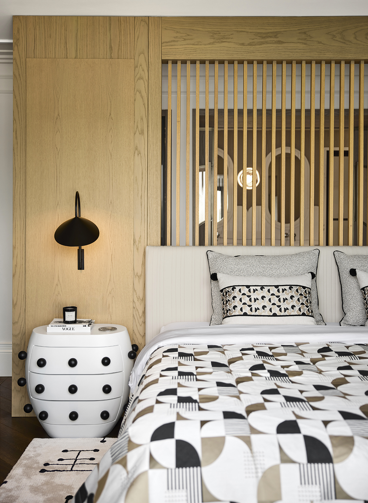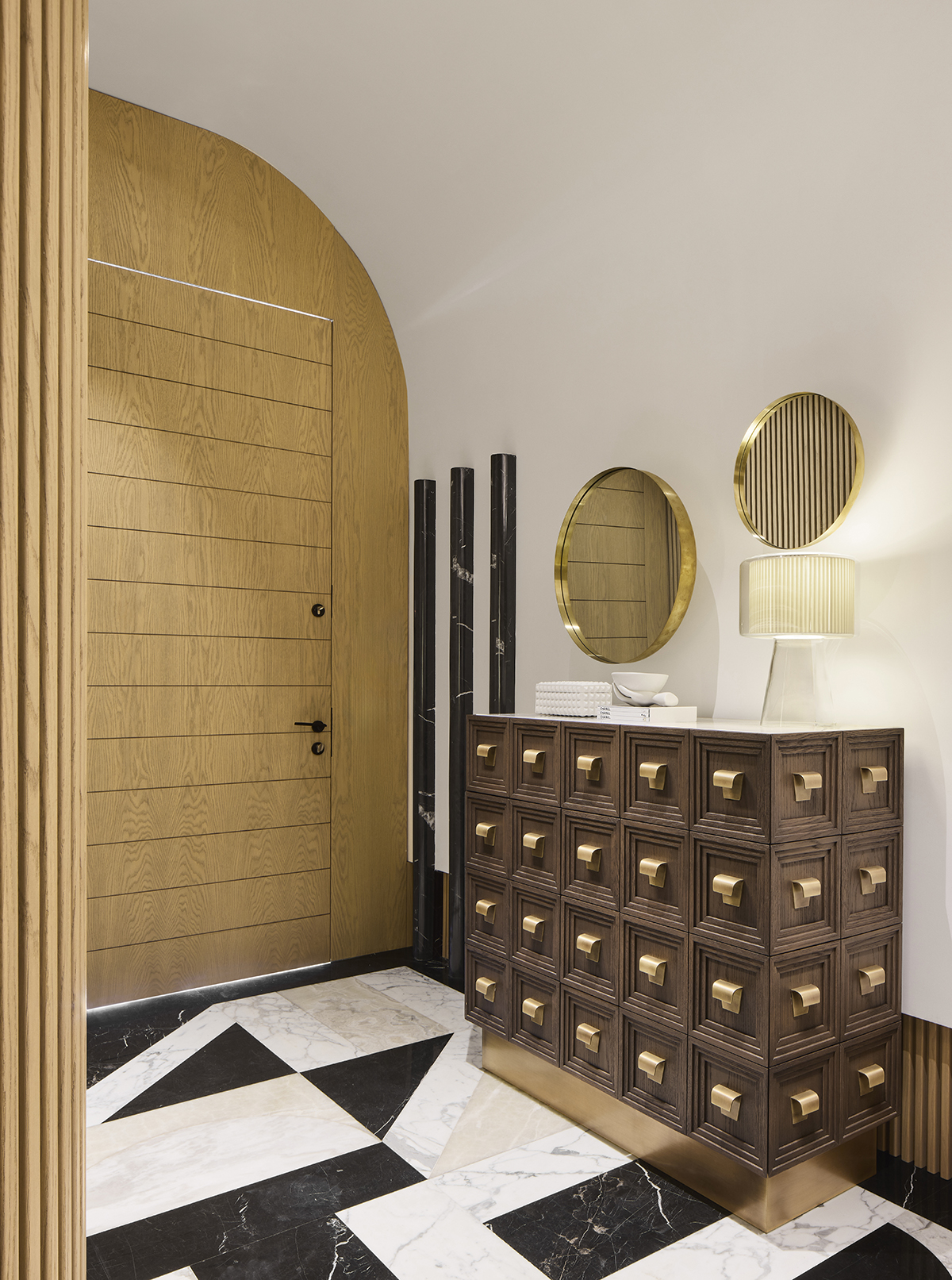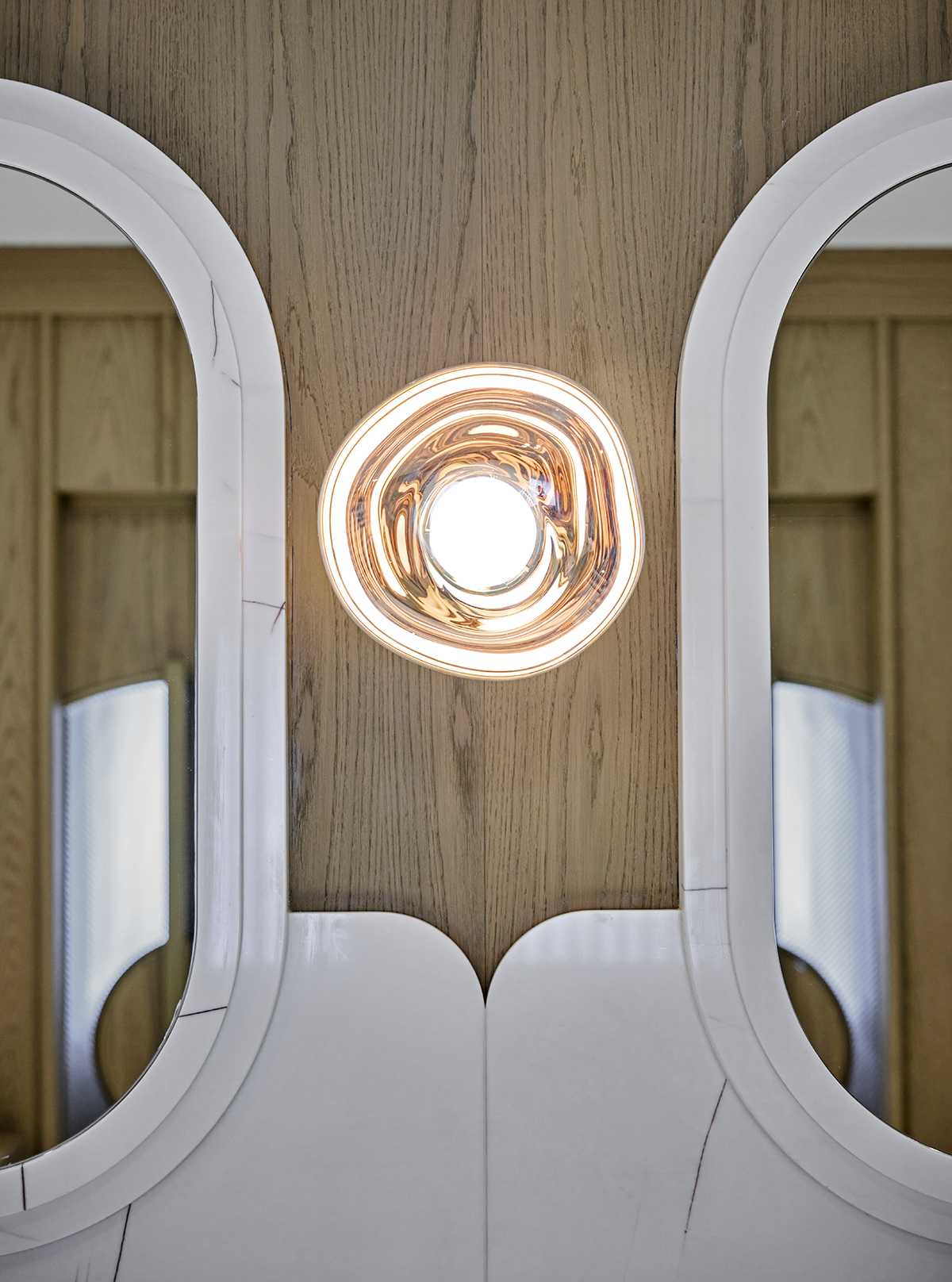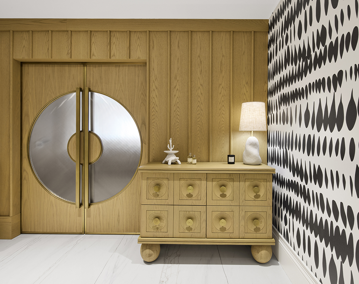 The interior language is defined by natural materials, light oak finishes, soft earth tones, and bronze mirror accents.