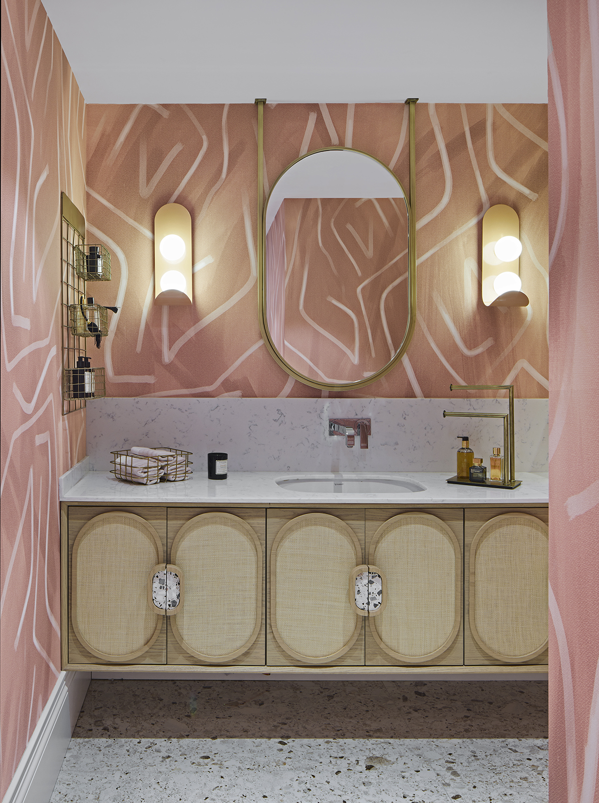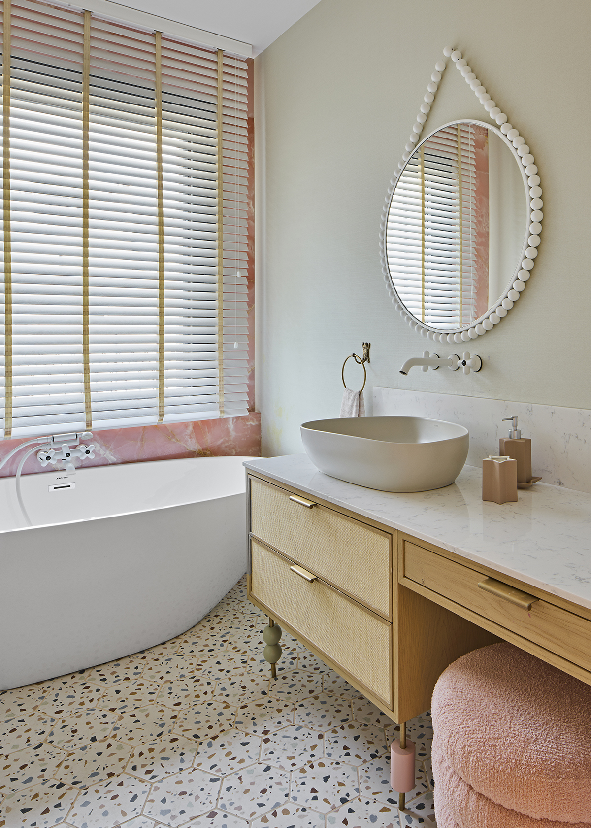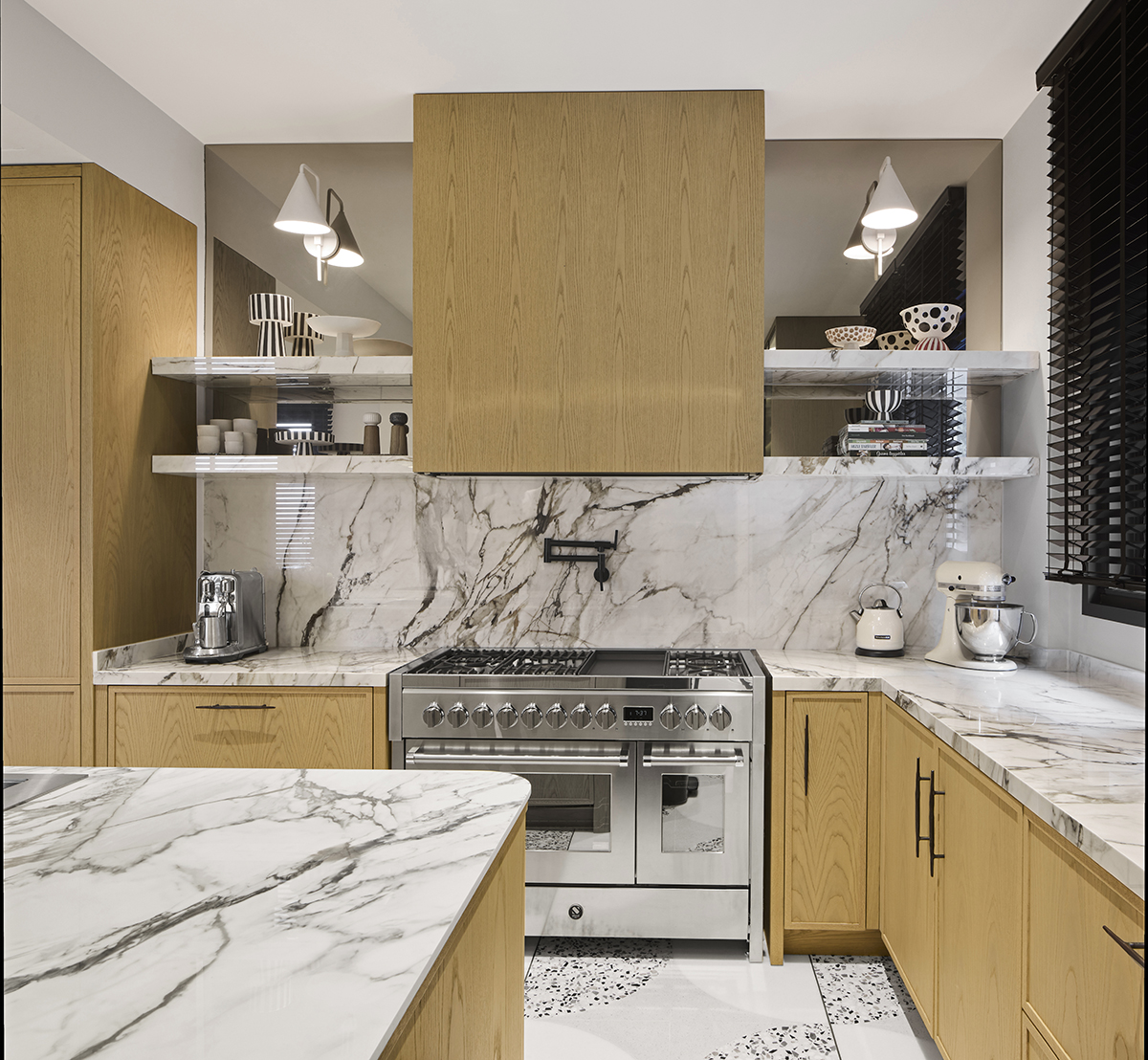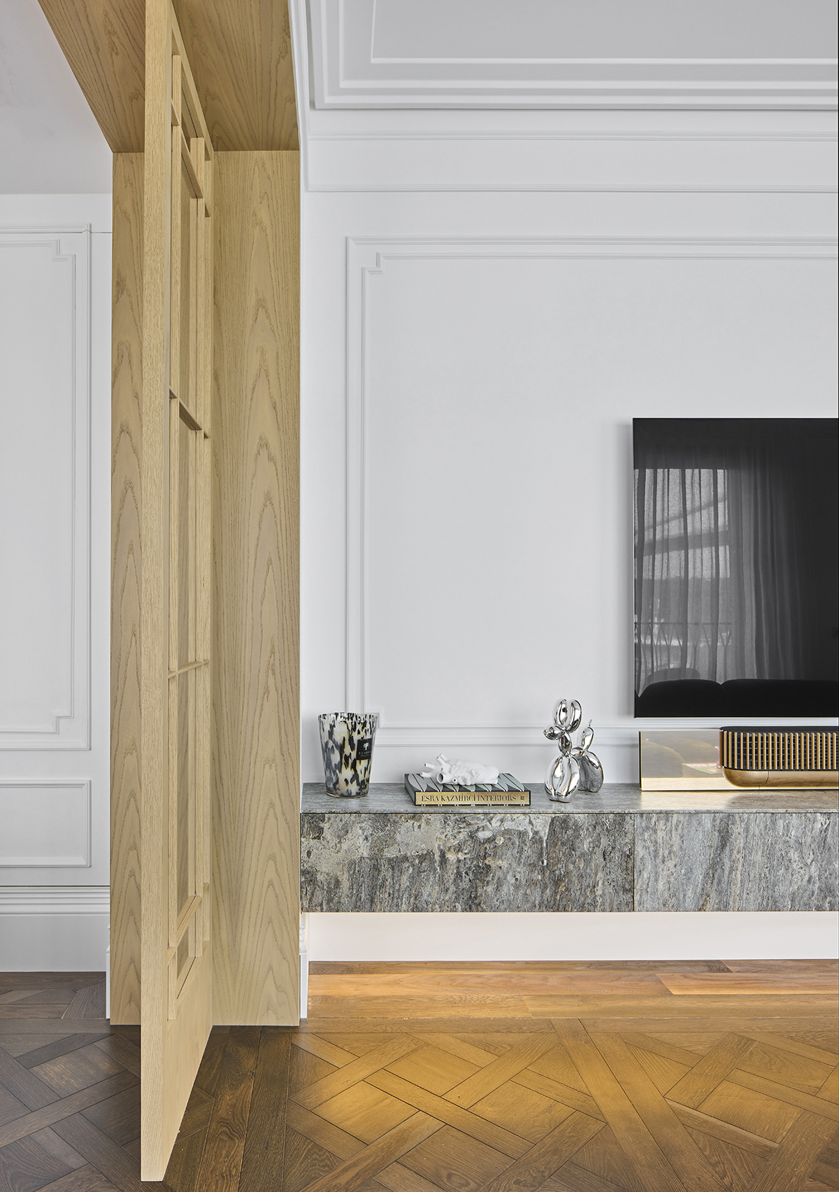 The interior language is defined by natural materials, light oak finishes, soft earth tones, and bronze mirror accents.