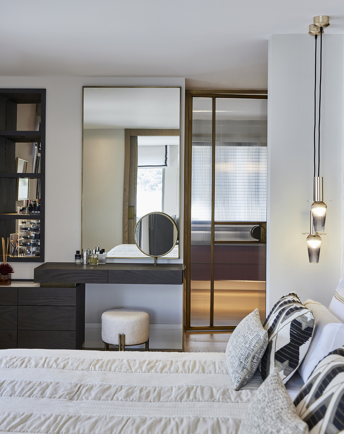 The upper level was transformed into a private suite, housing the master bedroom with an open dressing area and bathroom on one side, and a combined study and TV room on the other, anchored by a compact kitchenette at the stair landing.