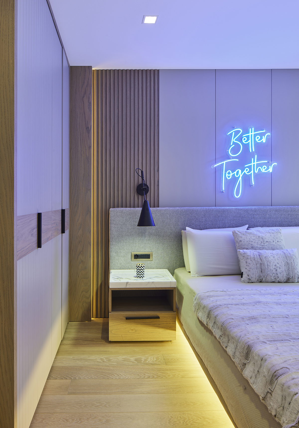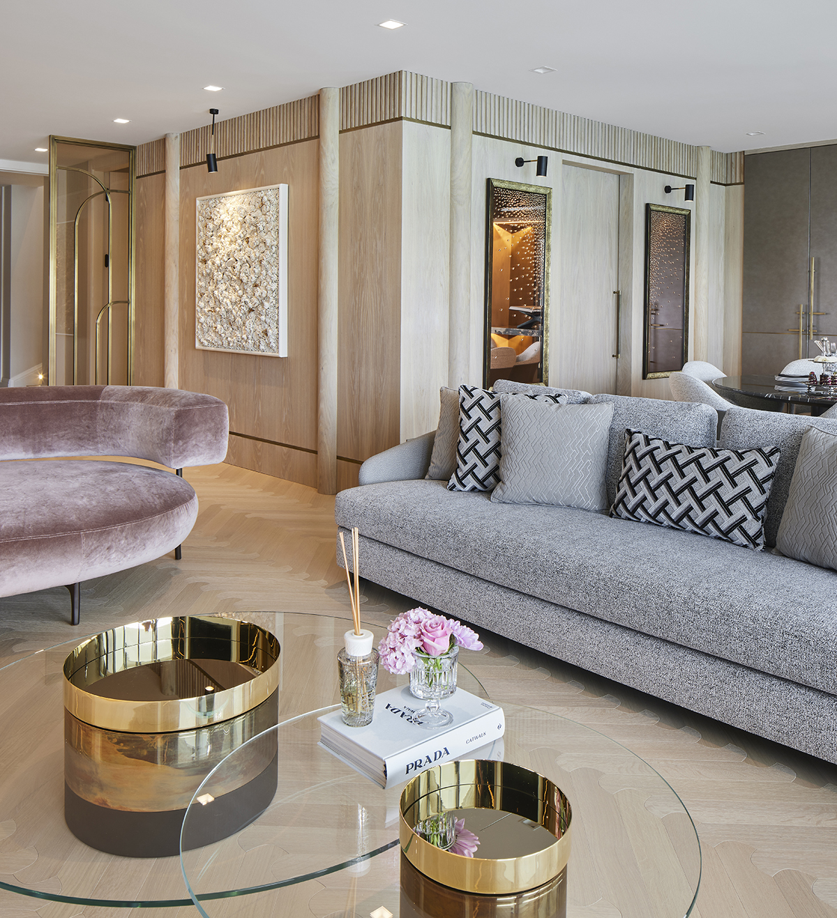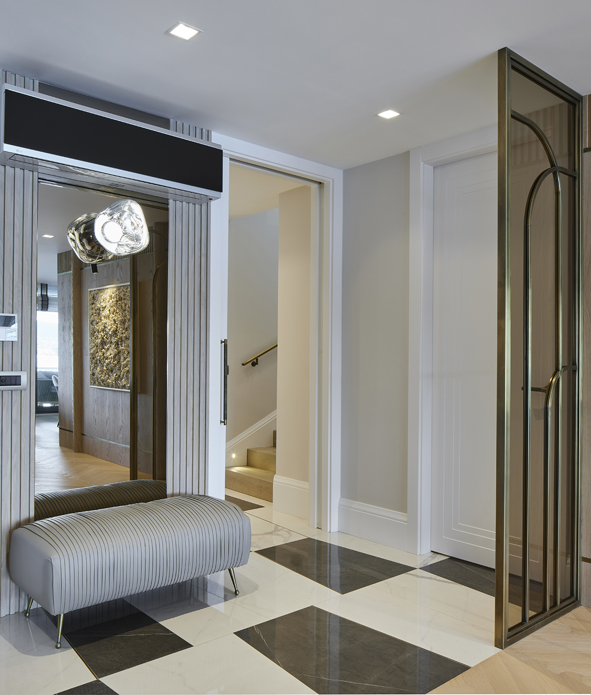 The interior language remains understated and elegant, supported by layered lighting that includes recessed square spots, wall lights accentuating wood paneling, concealed LEDs within bespoke furniture, and artwork lighting.