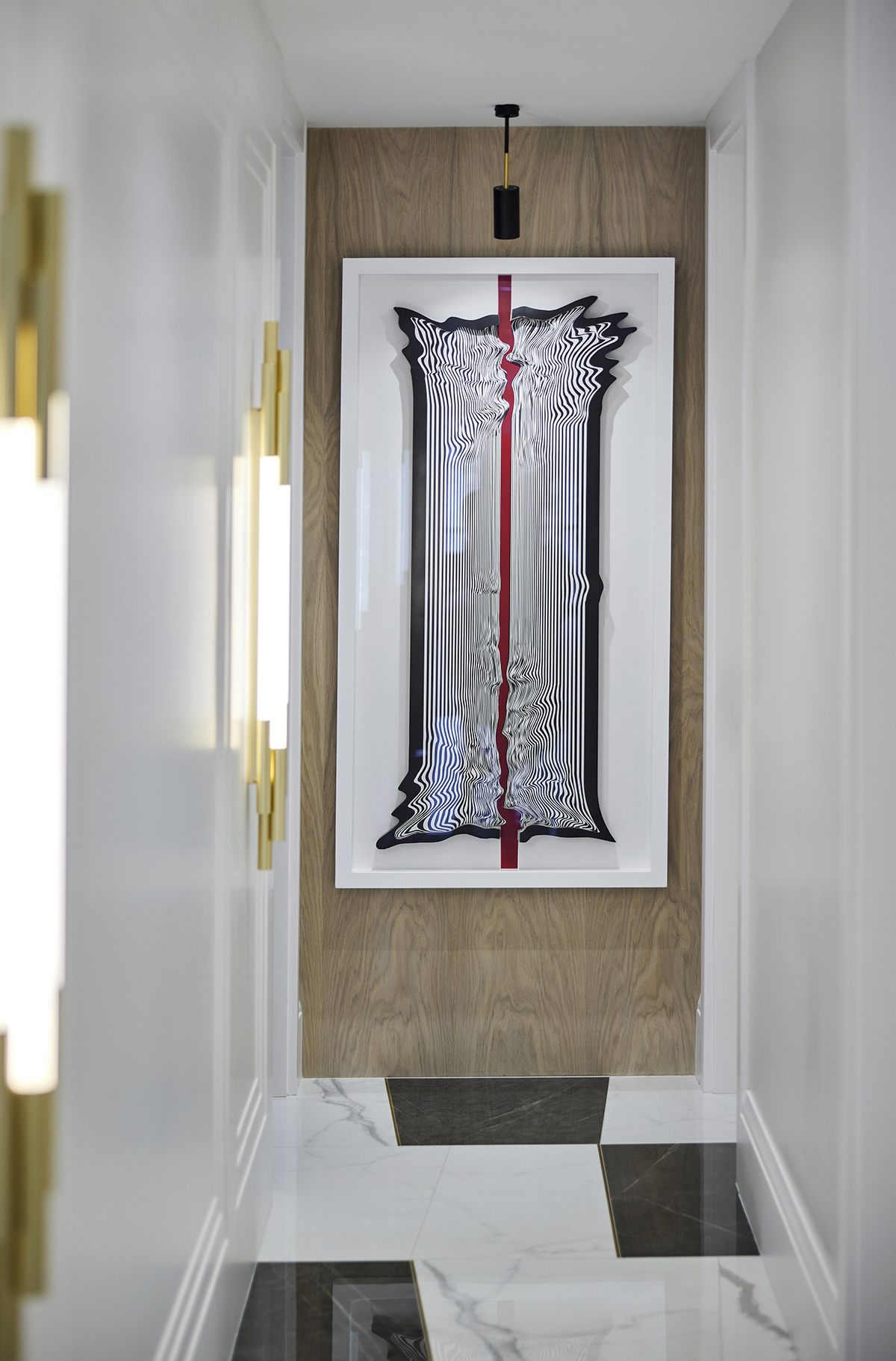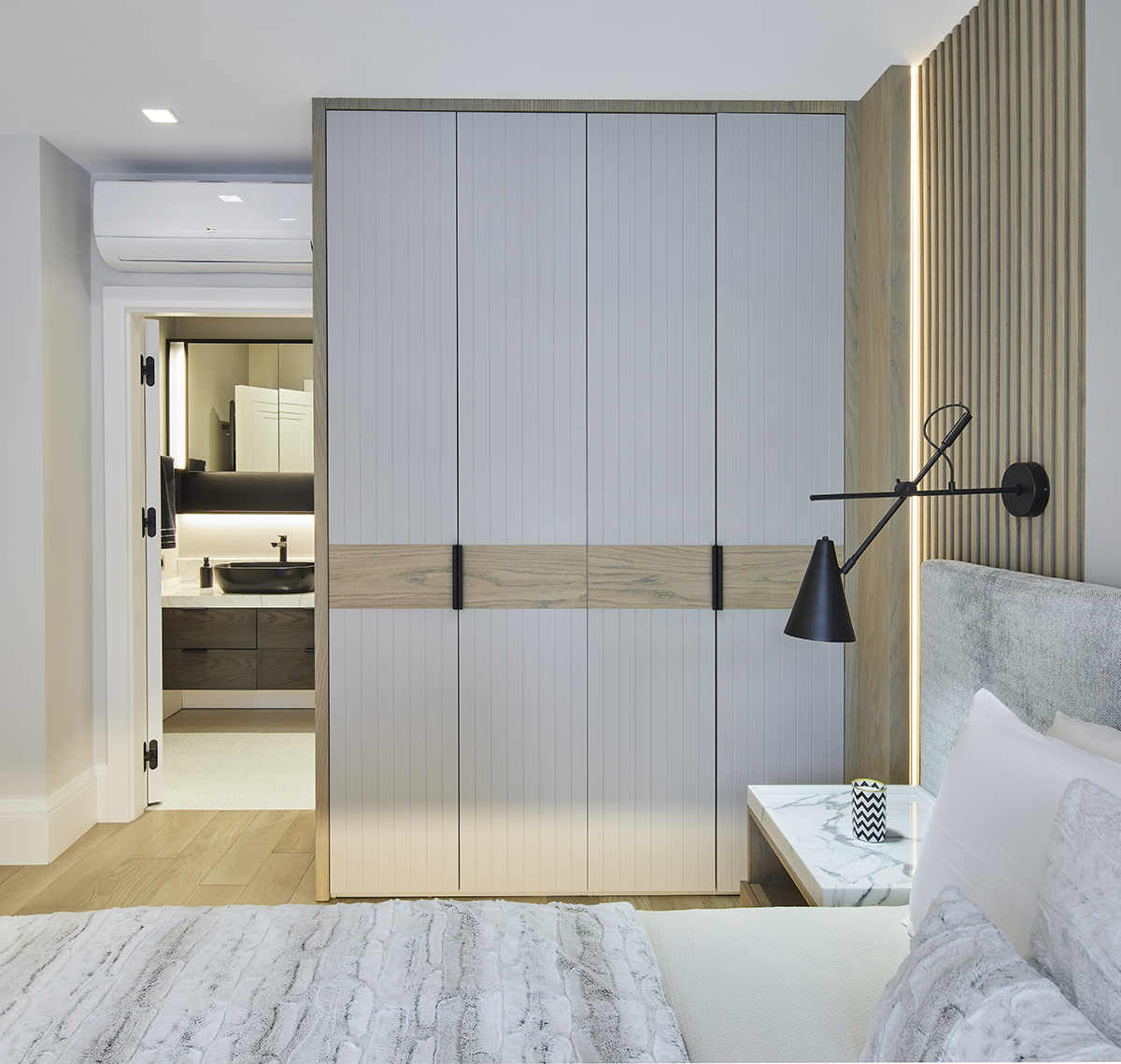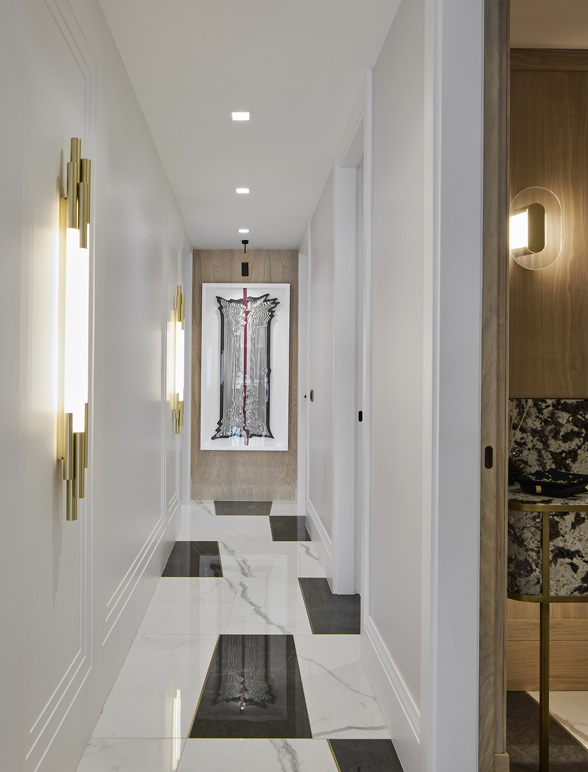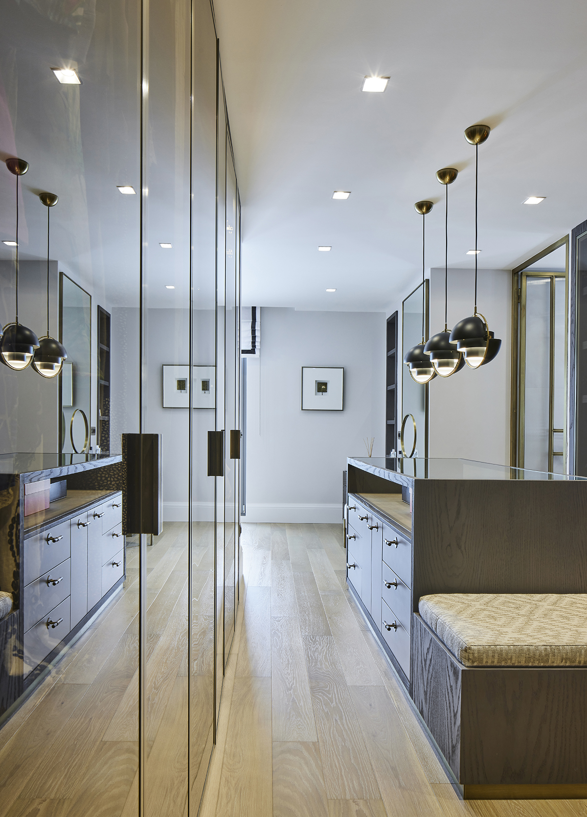 The interior language remains understated and elegant, supported by layered lighting that includes recessed square spots, wall lights accentuating wood paneling, concealed LEDs within bespoke furniture, and artwork lighting.