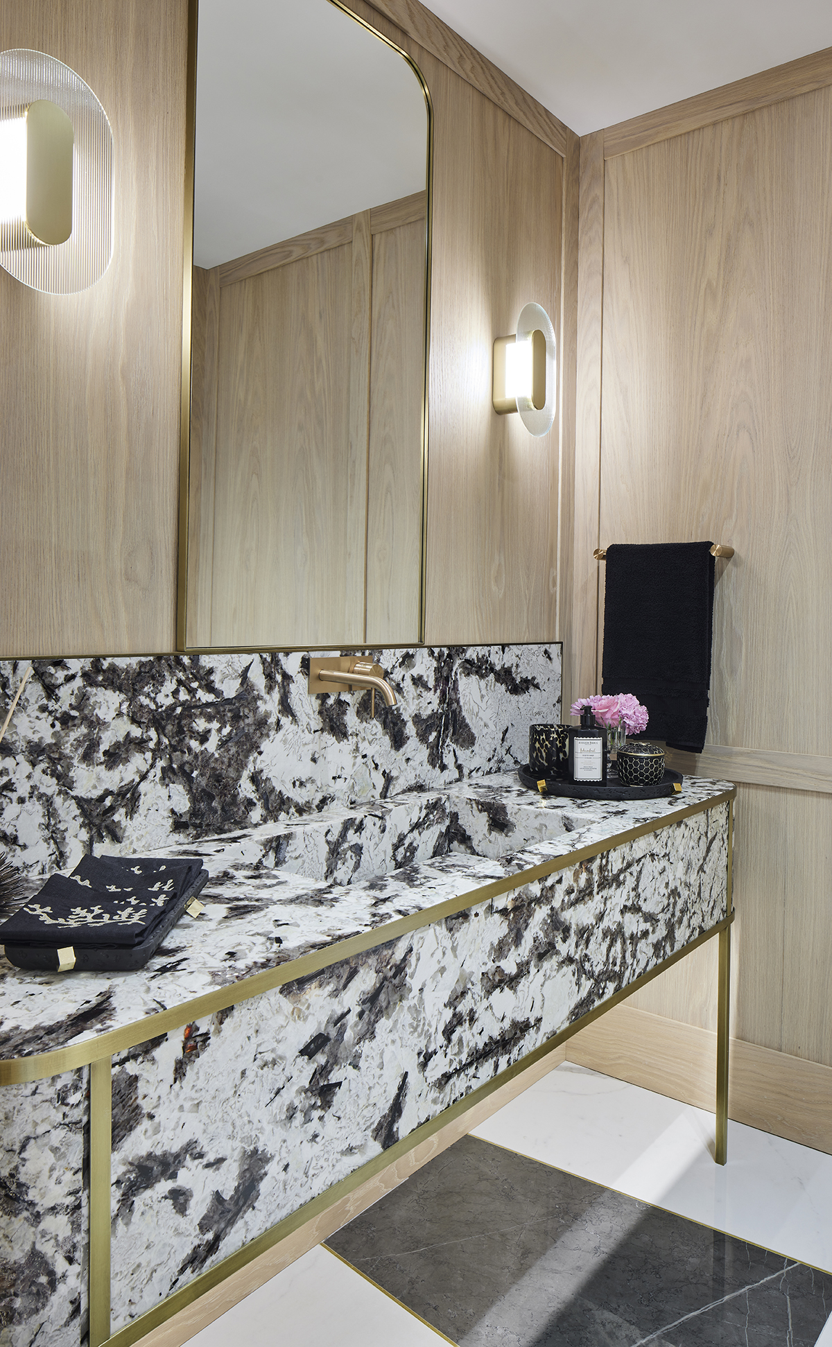 Material choices reinforce the timeless character of the home… custom patterned ceramics in circulation areas, oak parquet flooring in living spaces and bedrooms, and imported ceramics in bathrooms.