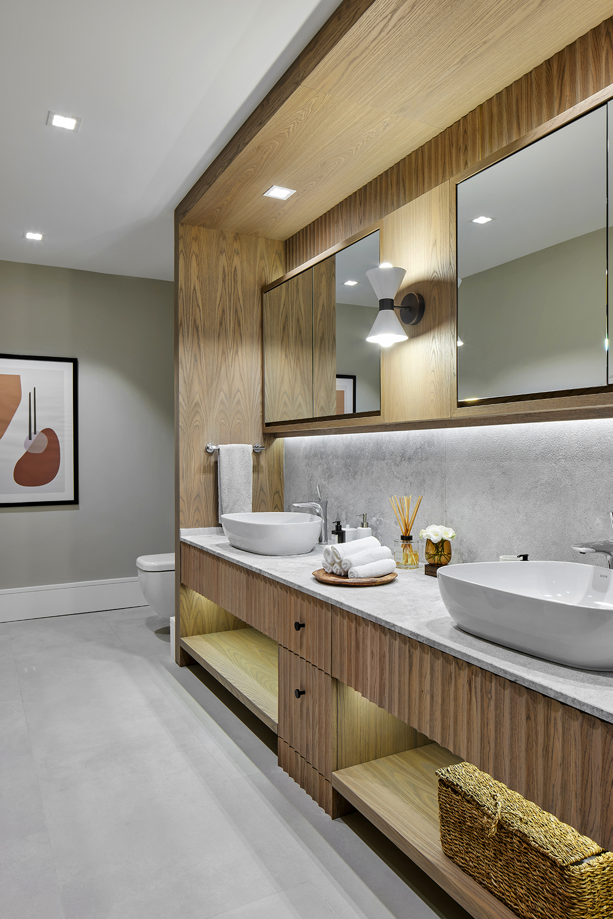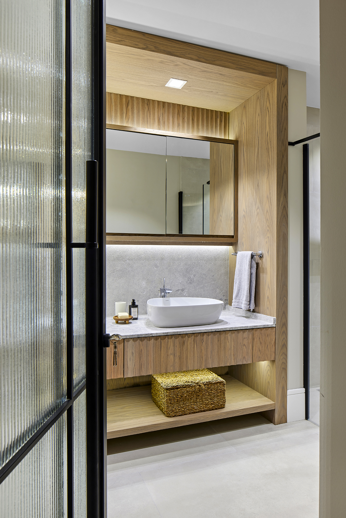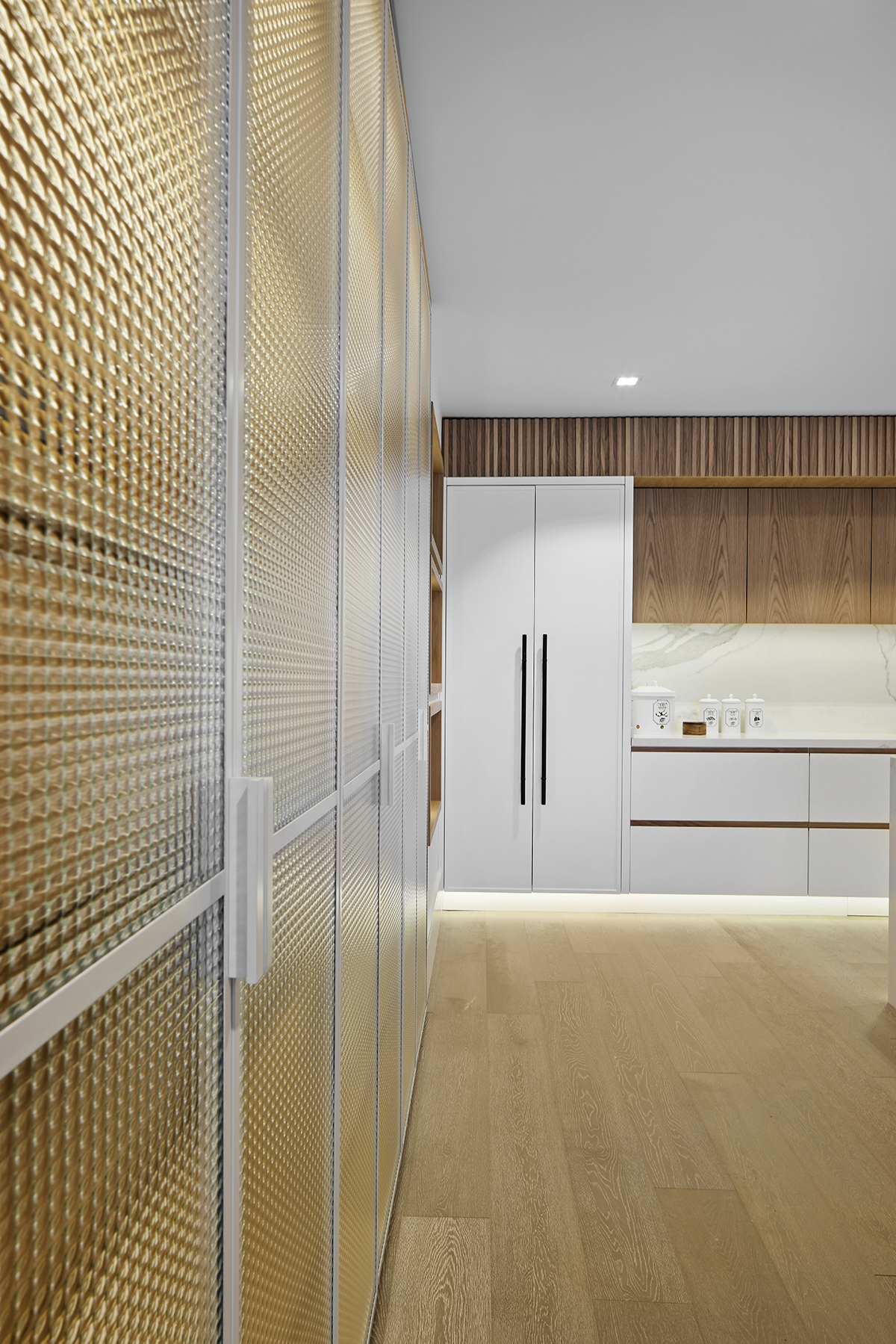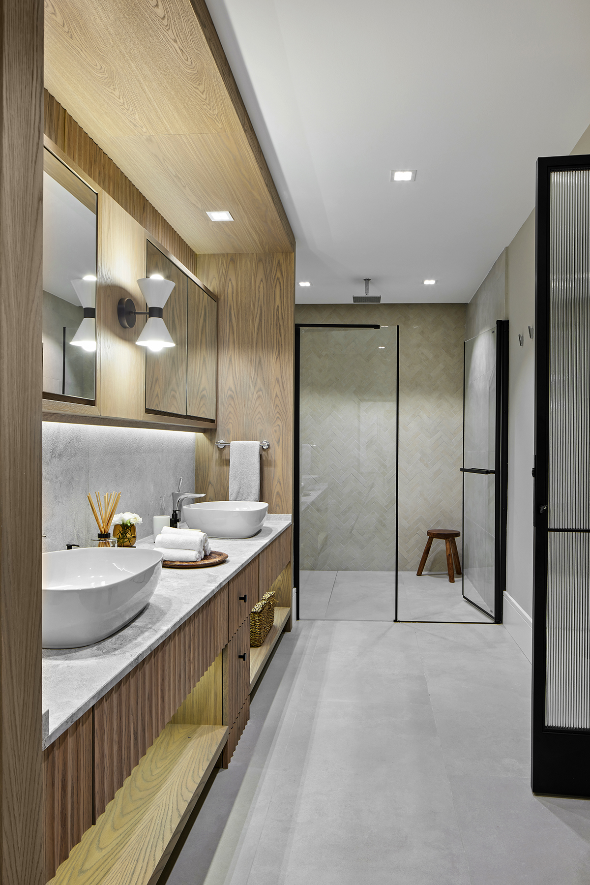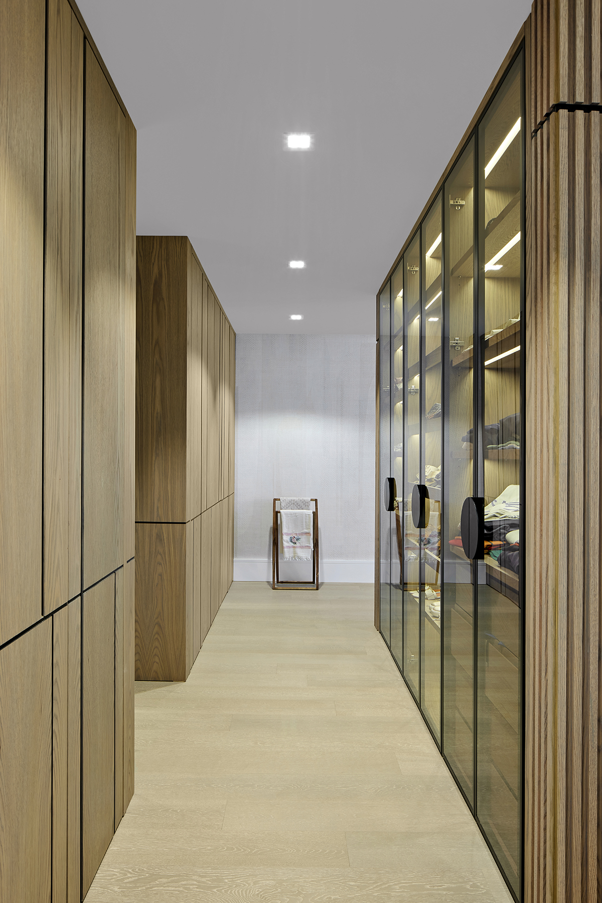The layout includes a generous entrance hall, an open-plan living area with kitchen, a master suite with en-suite bathroom, three guest bedrooms, additional bathrooms, laundry and storage spaces, as well as a separate staff room with its own entrance.