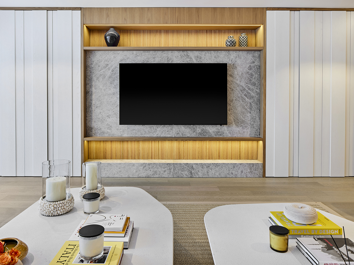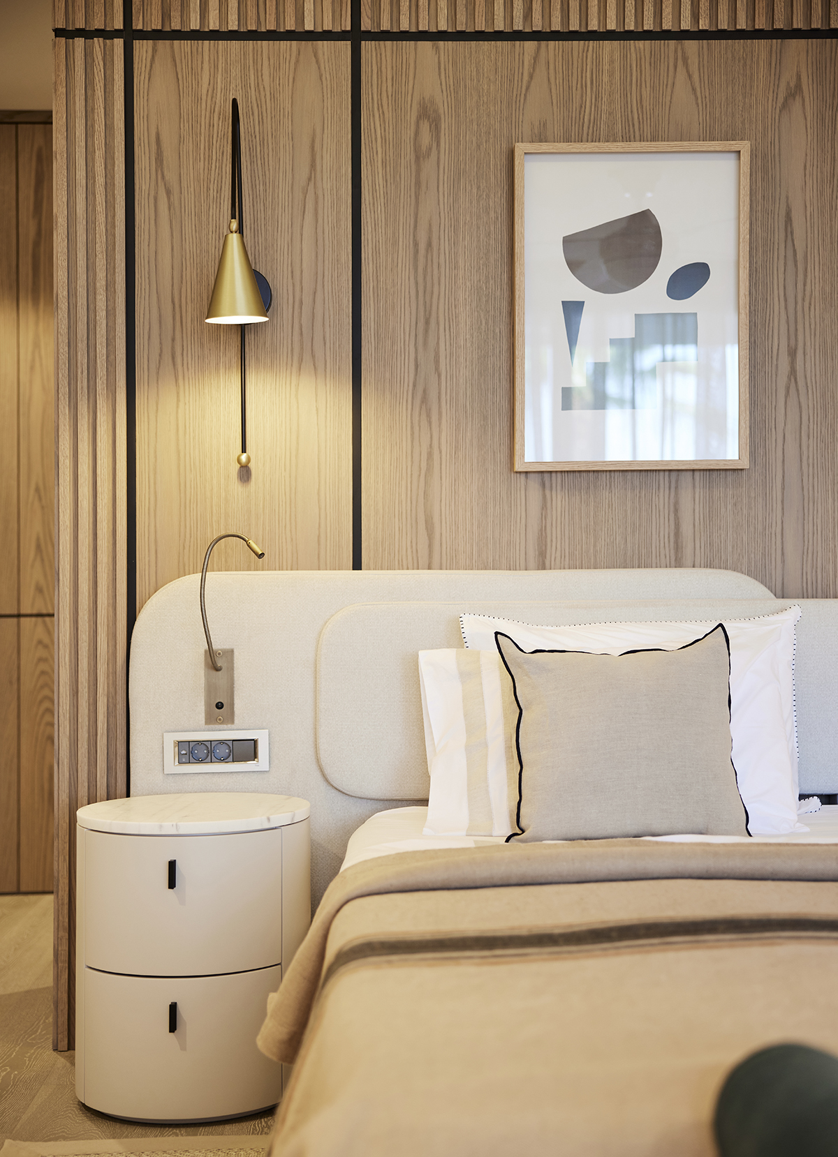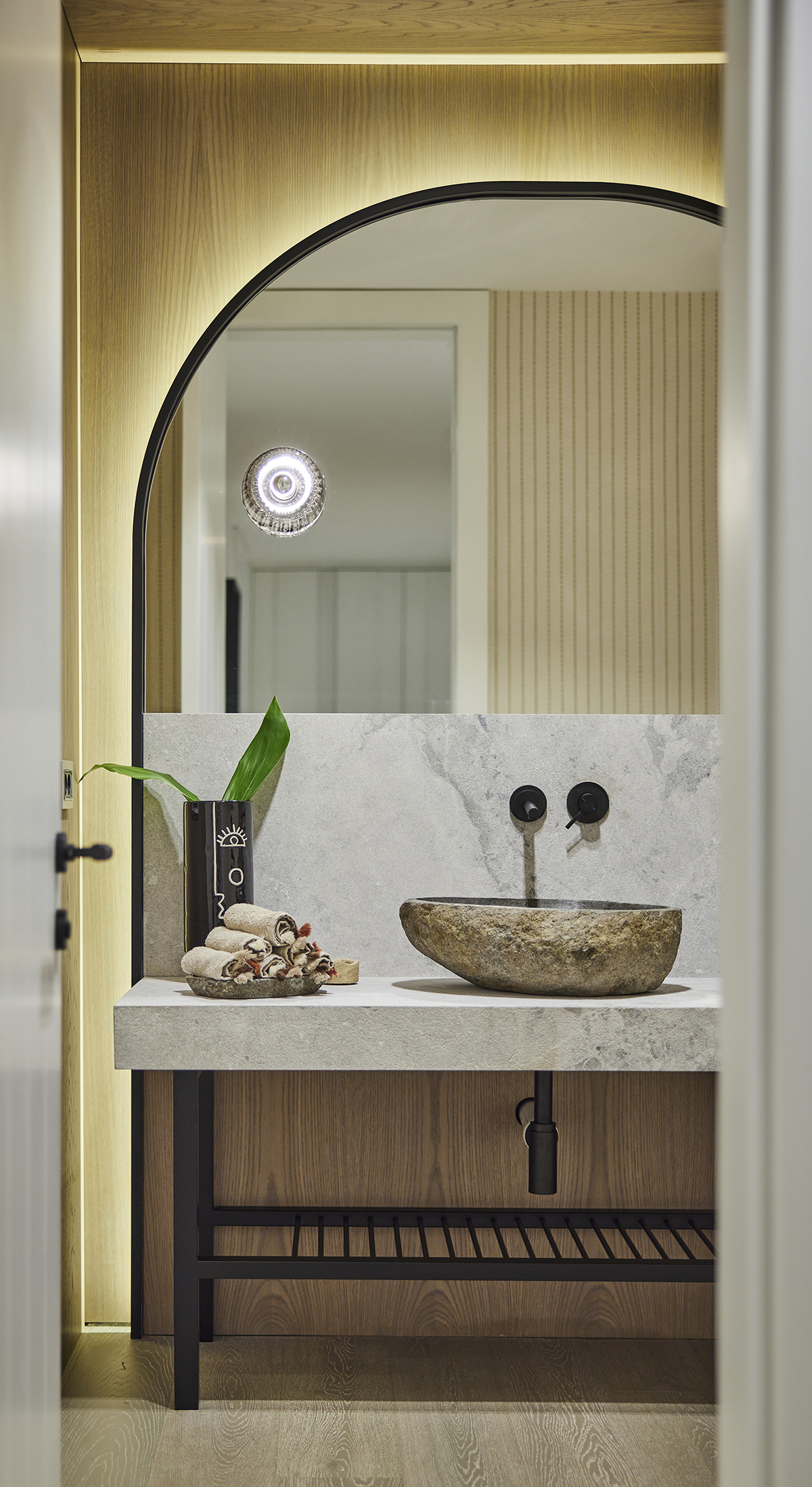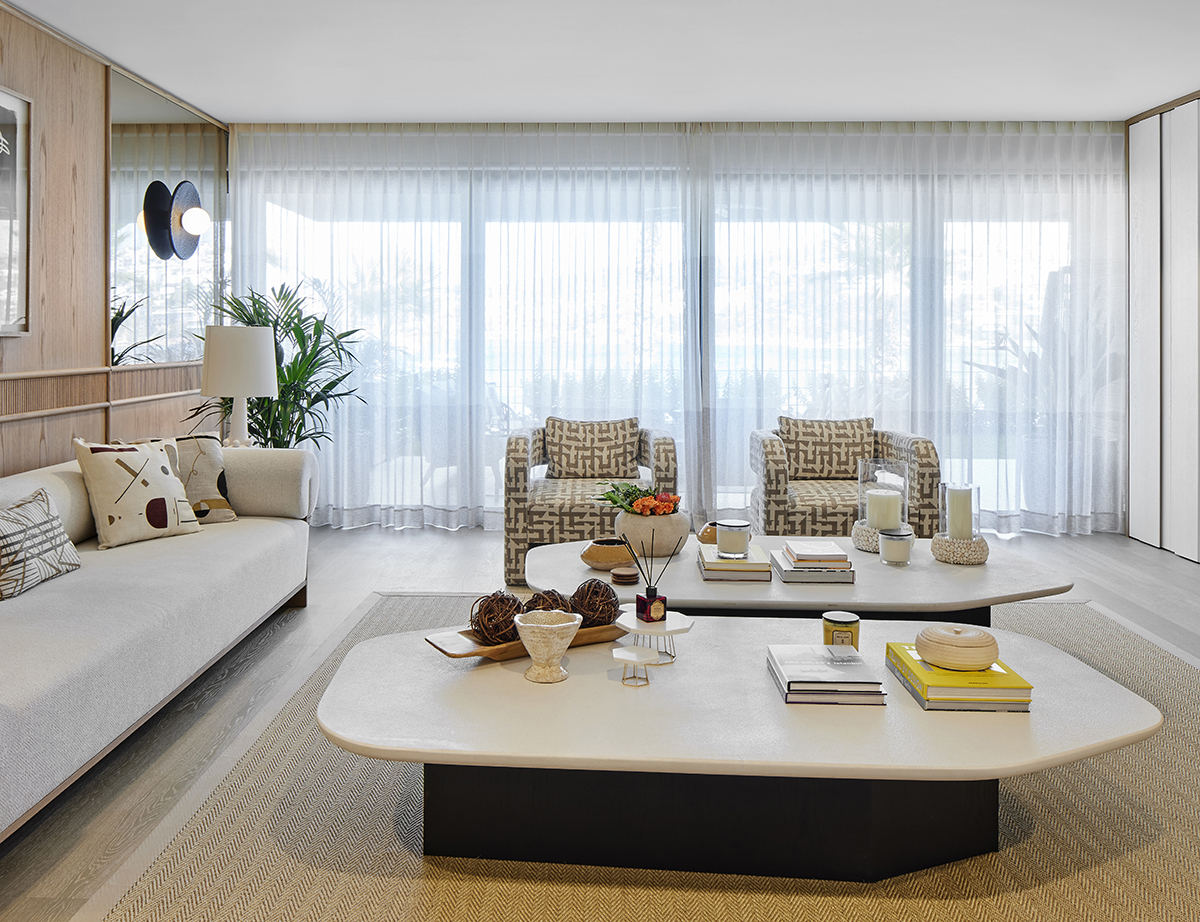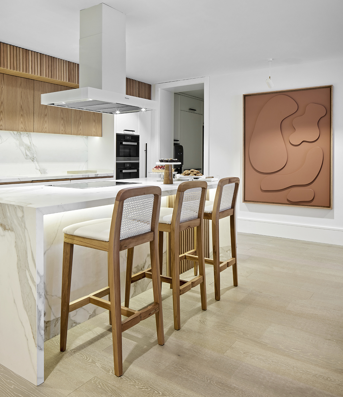 The layout includes a generous entrance hall, an open-plan living area with kitchen, a master suite with en-suite bathroom, three guest bedrooms, additional bathrooms, laundry and storage spaces, as well as a separate staff room with its own entrance.