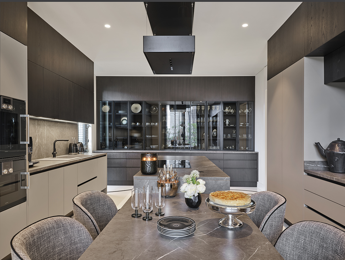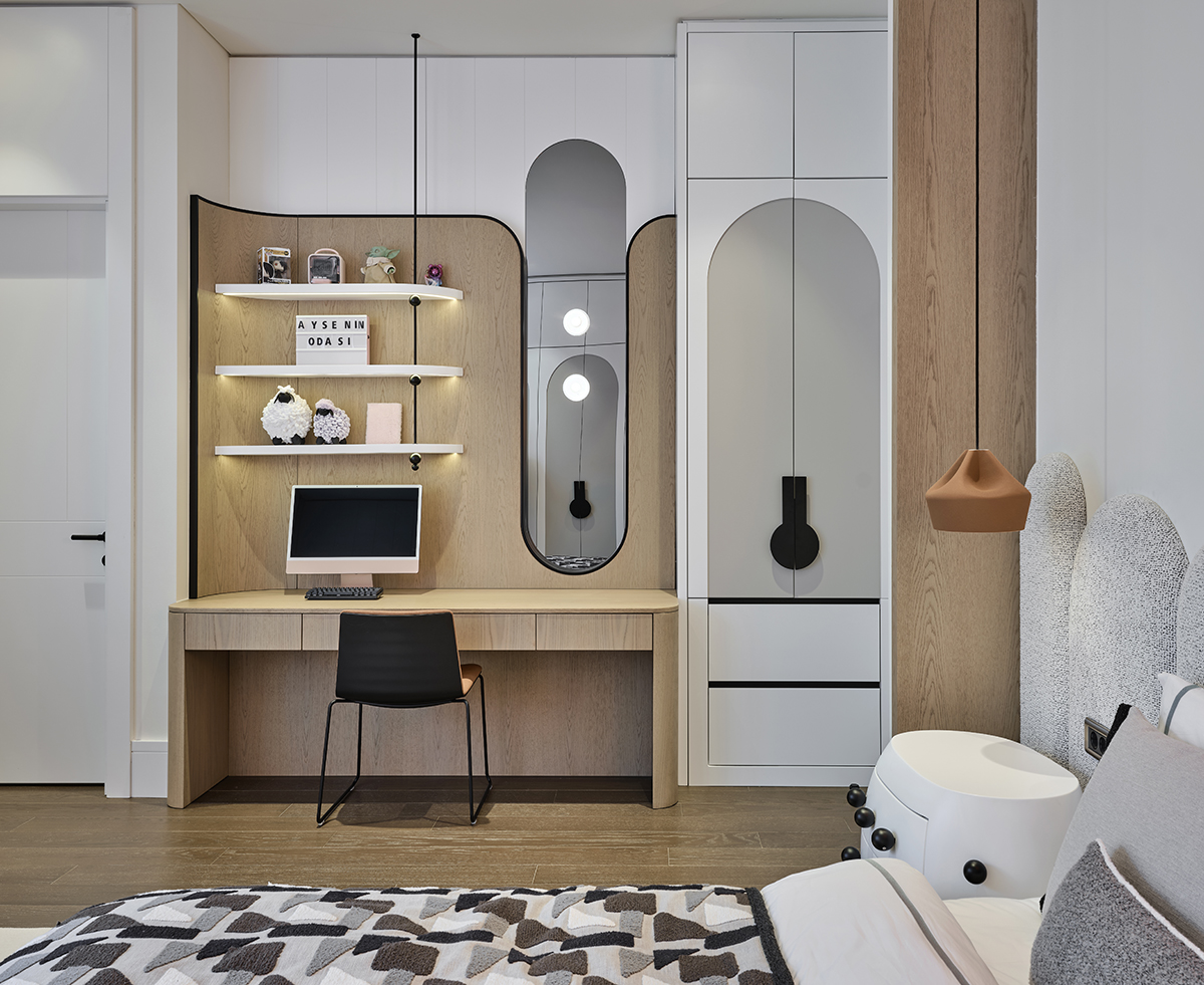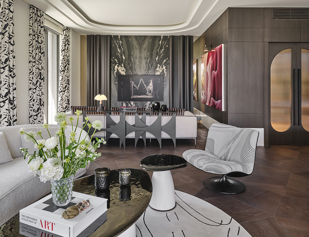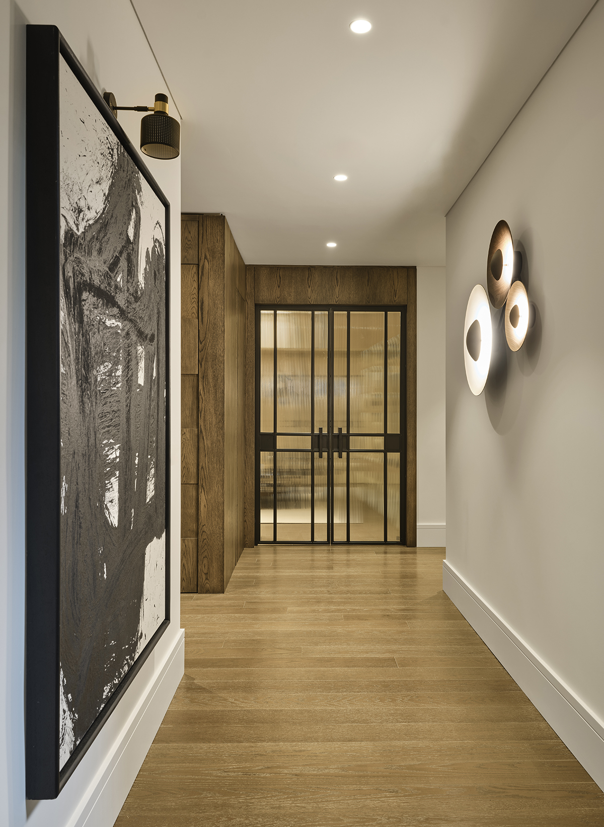 Wood paneled walls add architectural depth, while layered lighting, carefully selected textiles, and balanced material choices ensure both functionality and timeless appeal.