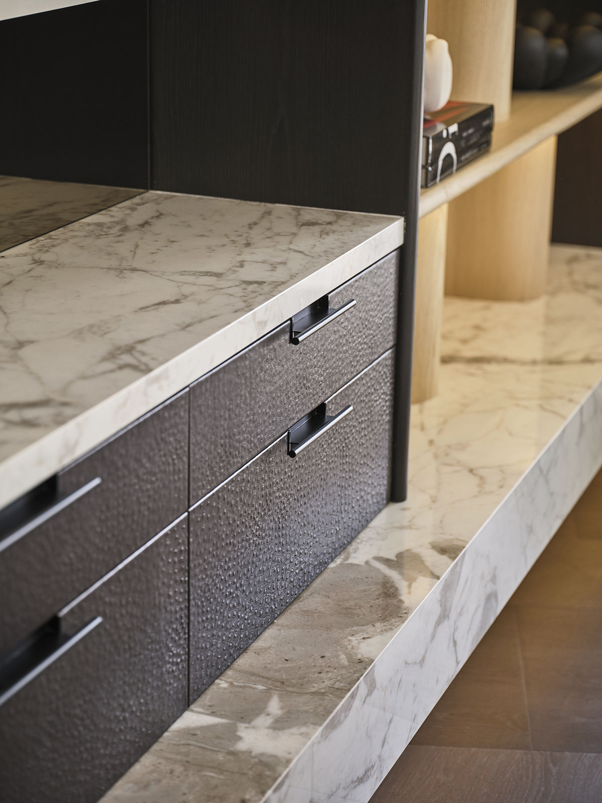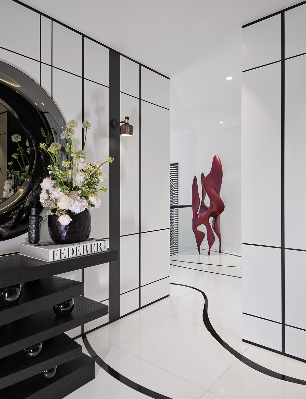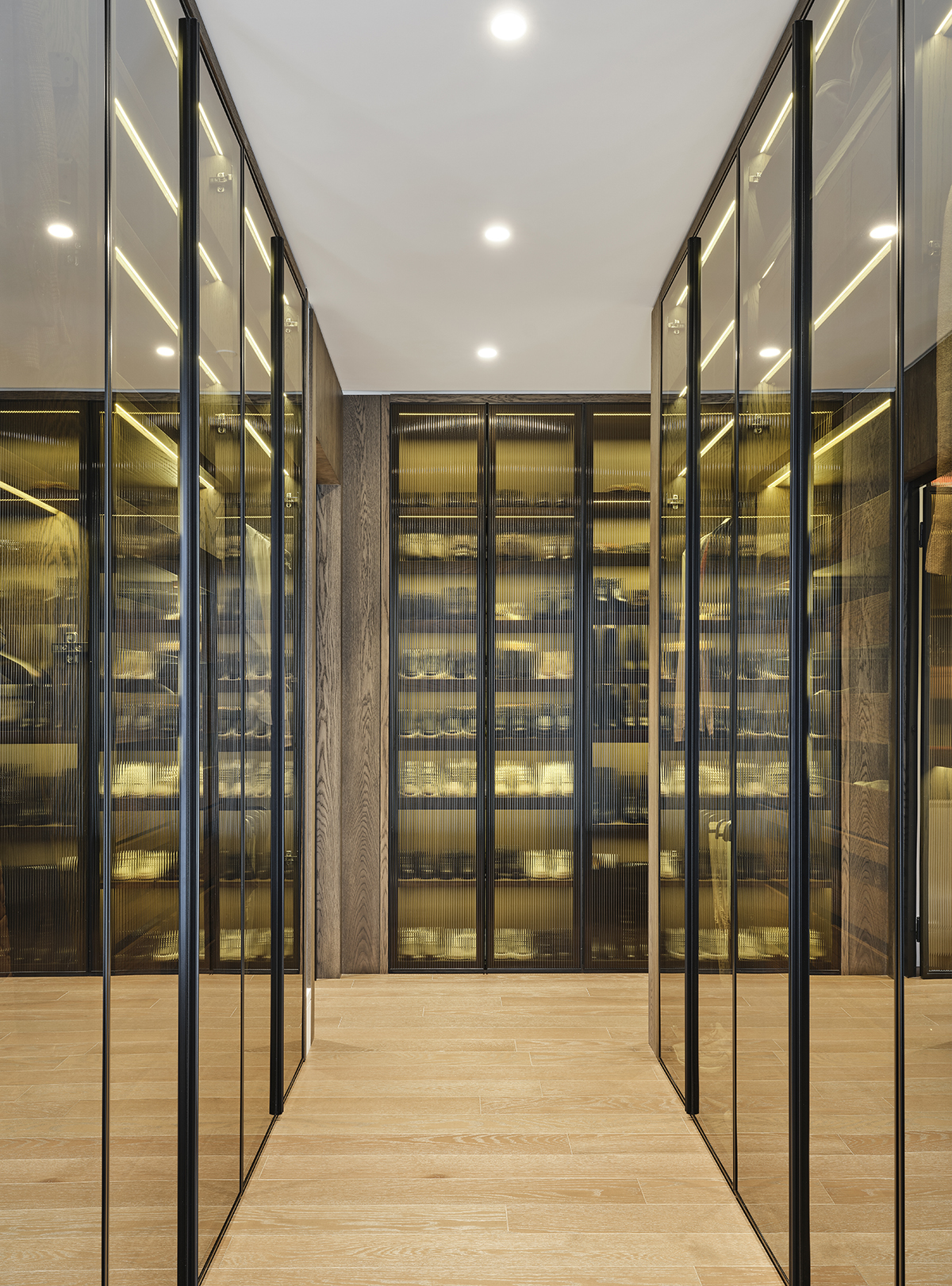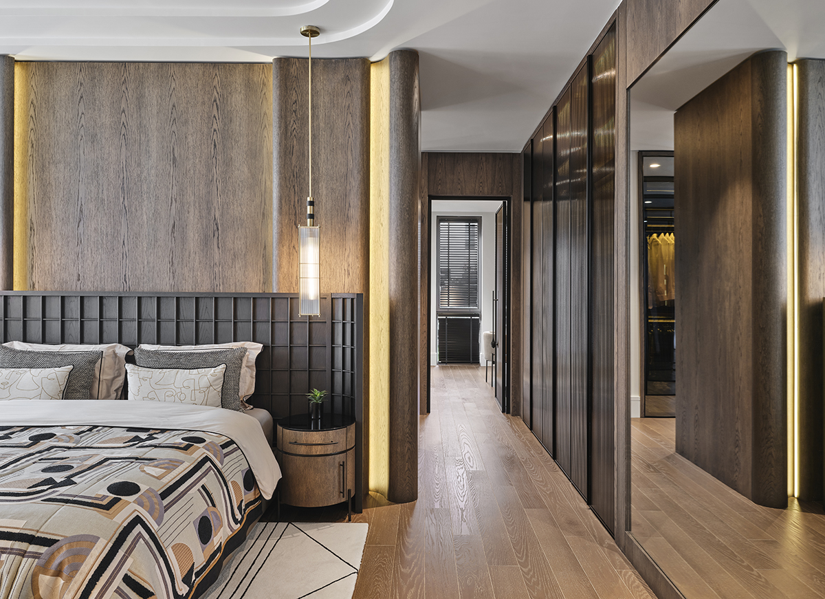 The master suite is designed as a layered space, where the sleeping area flows naturally into the dressing room and bathroom.