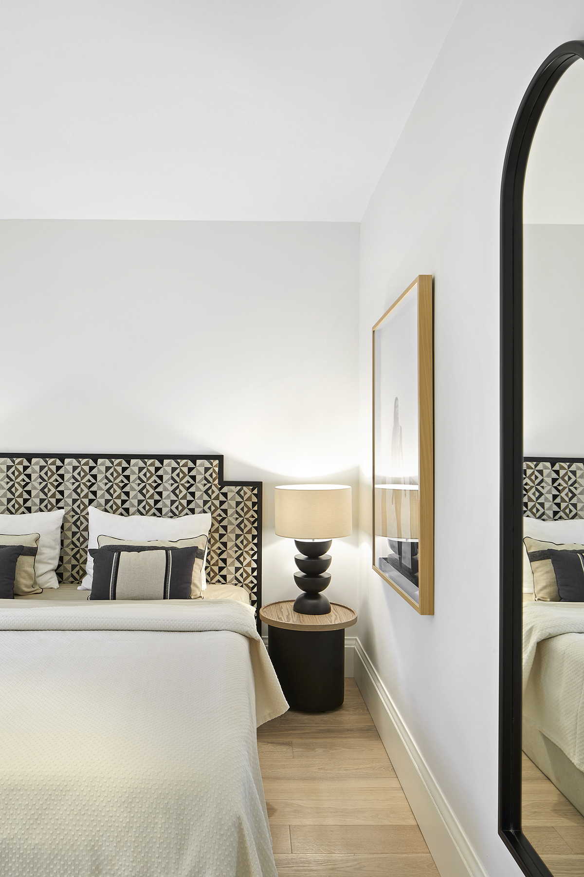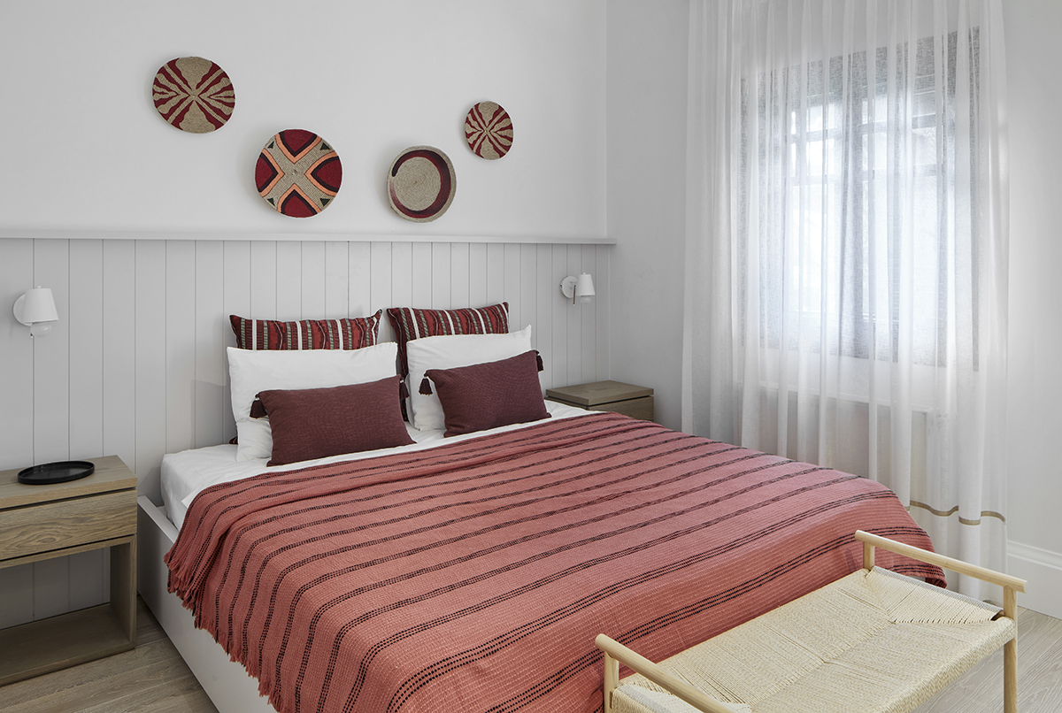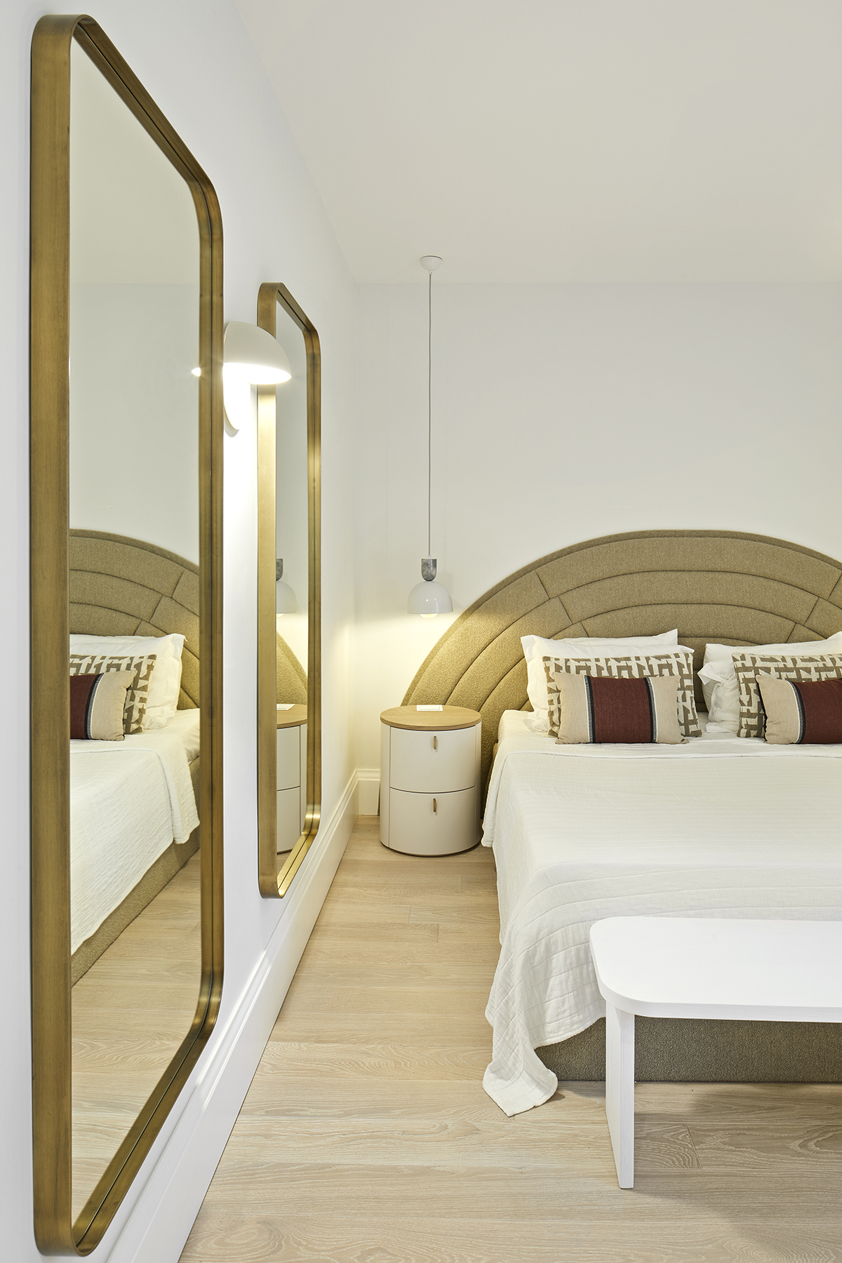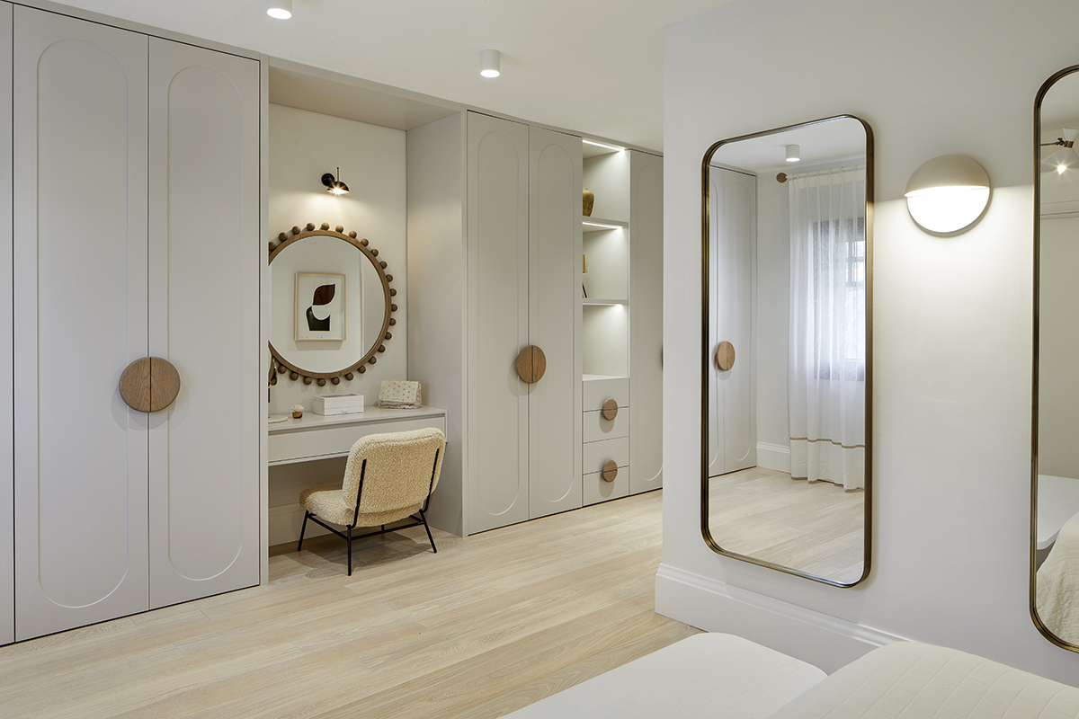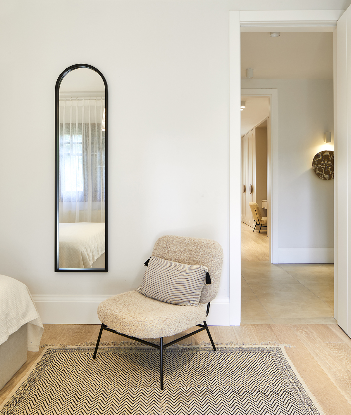 Mirrors were placed strategically to enhance openness, while shutters, linen curtains, and light-toned flooring complete the timeless interior language.