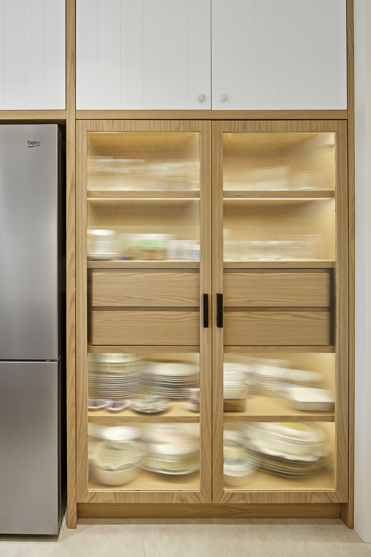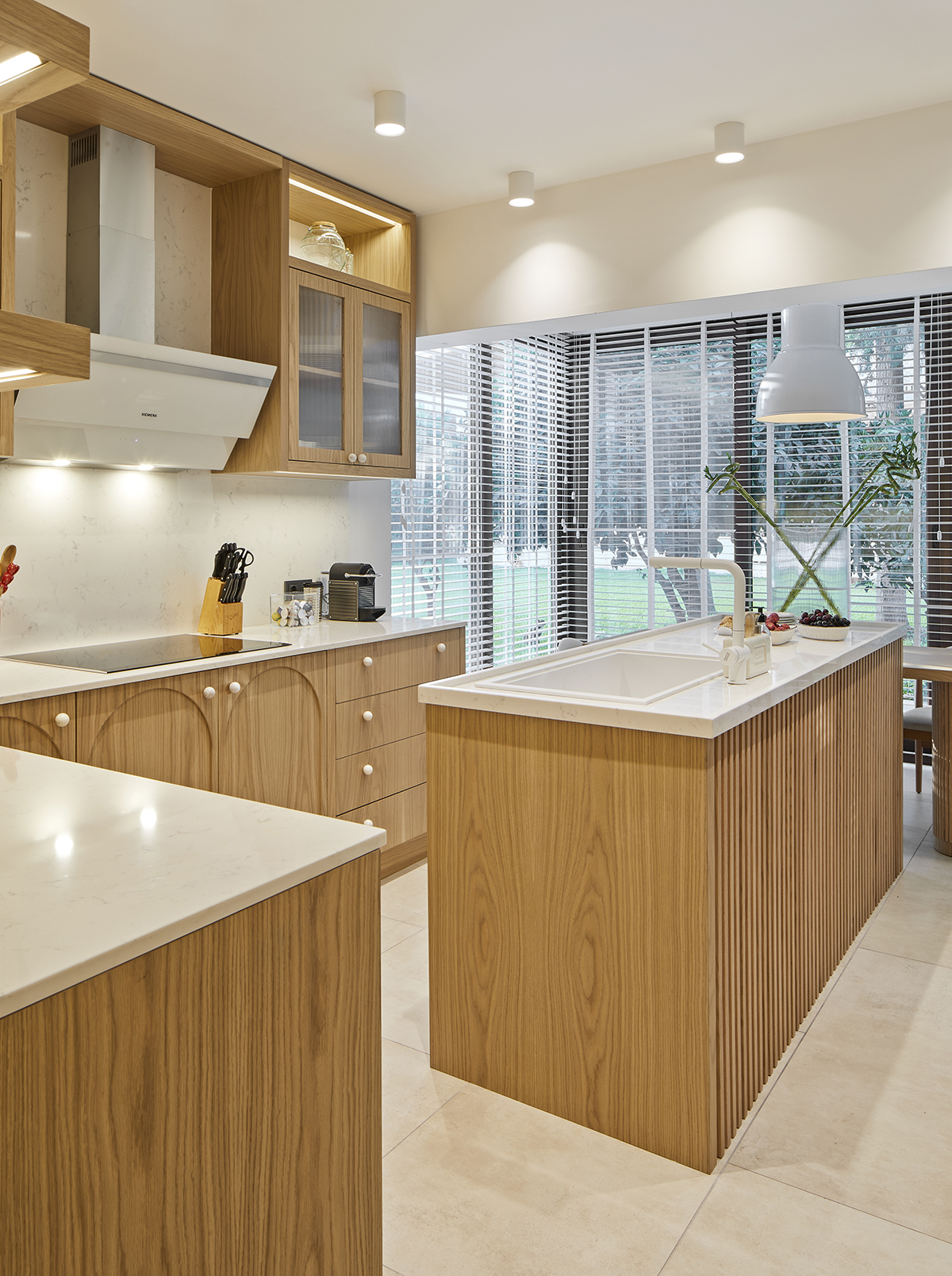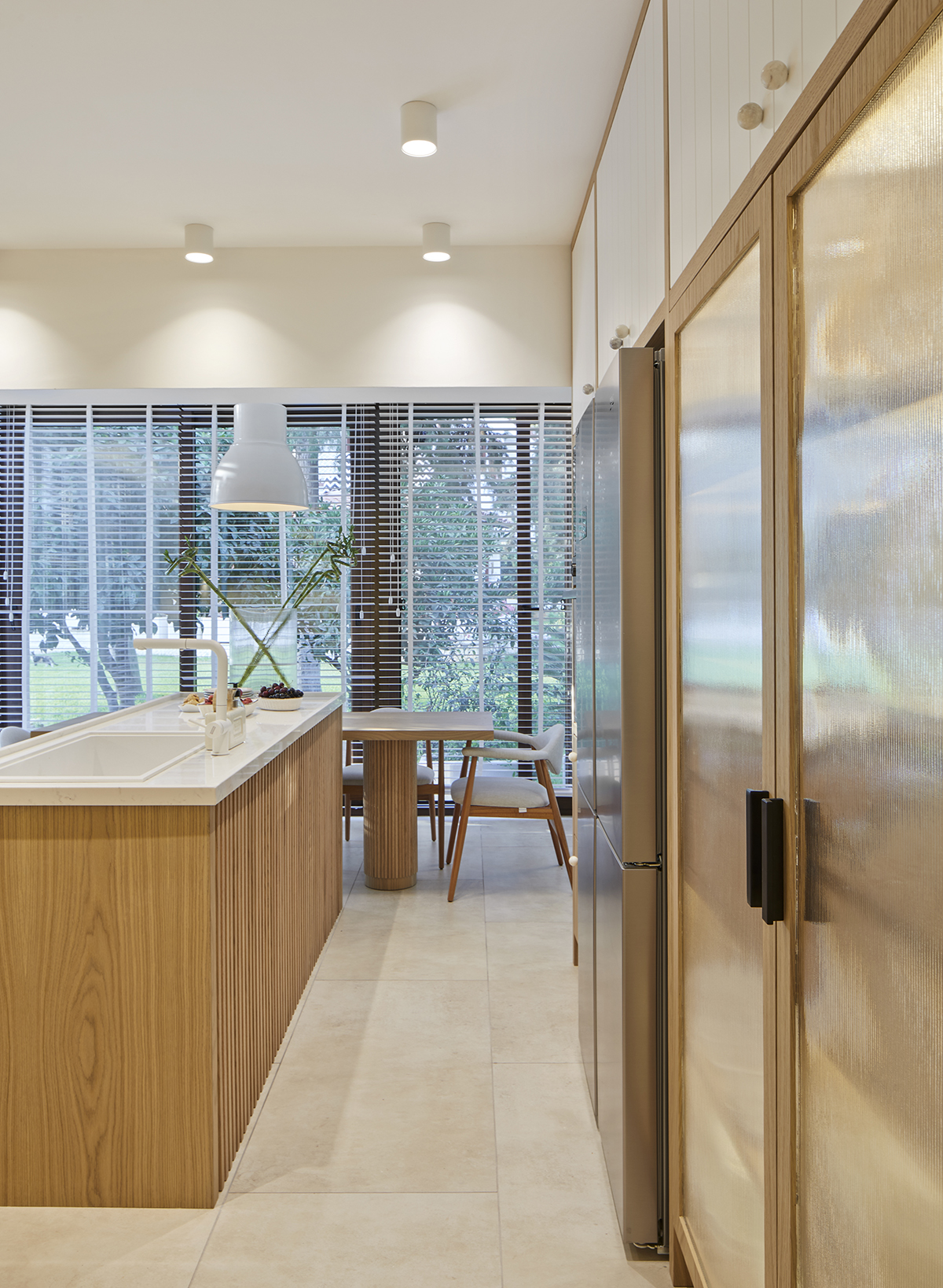 A palette of whites, light lacquers, and natural oak defines the interiors, reinforcing a sense of calm inspired by Mediterranean living.