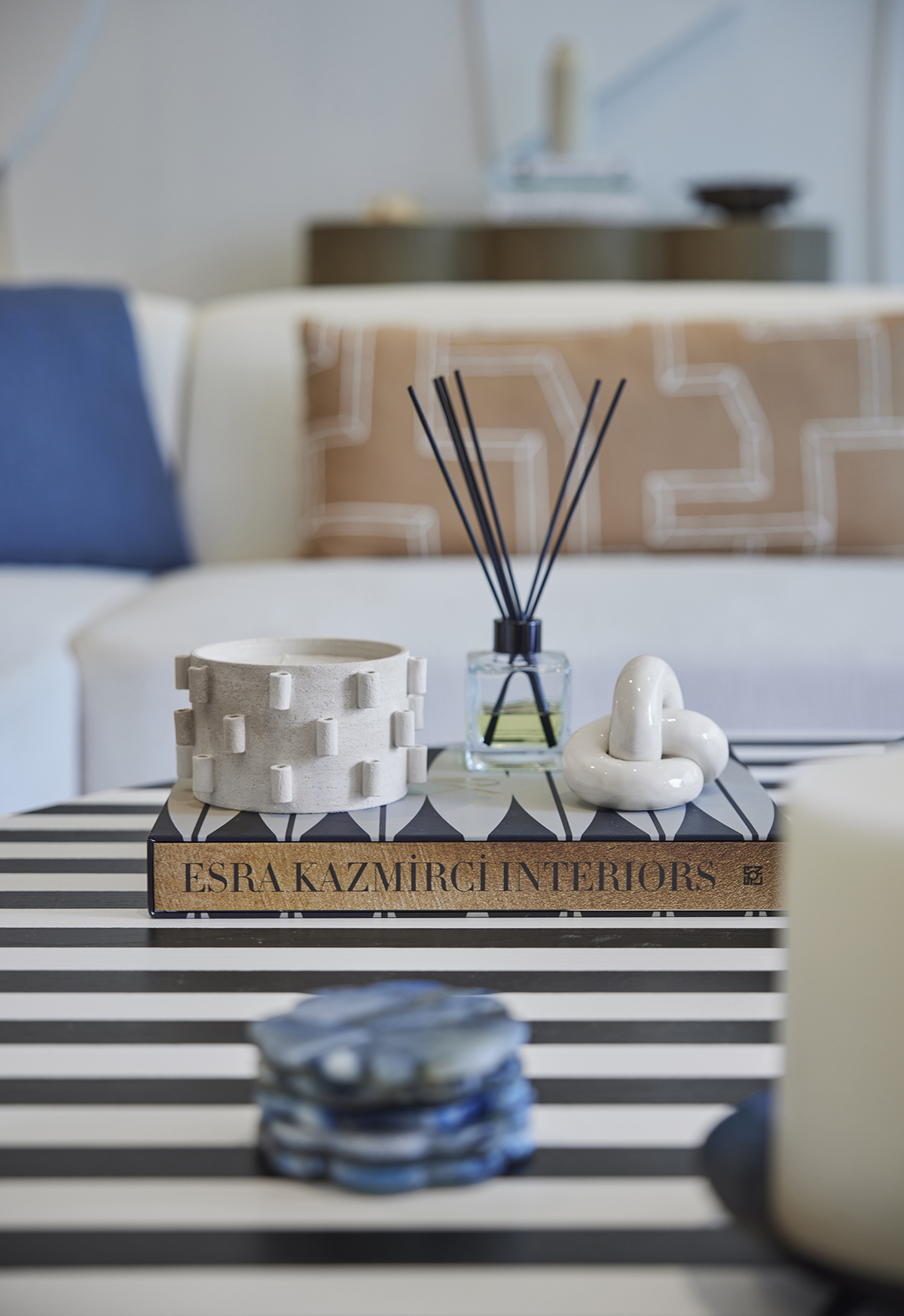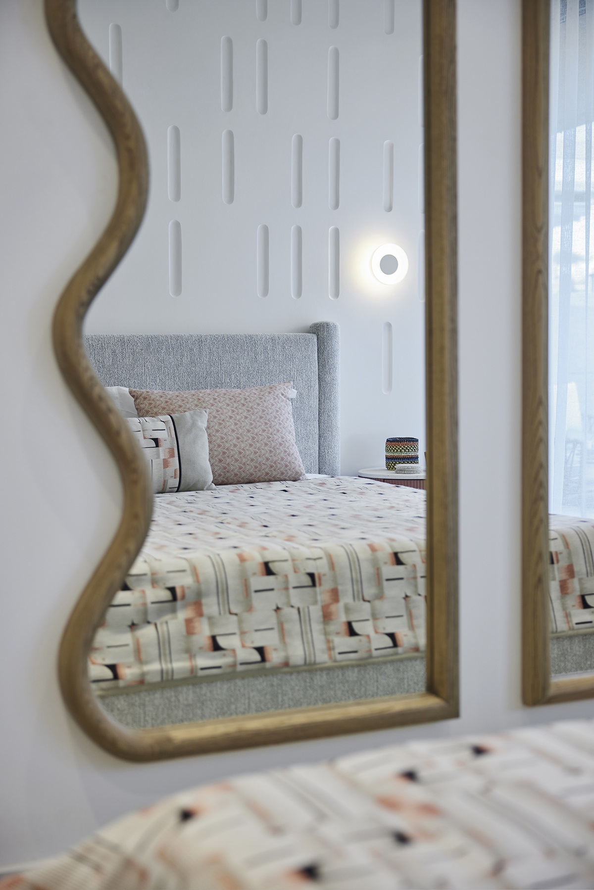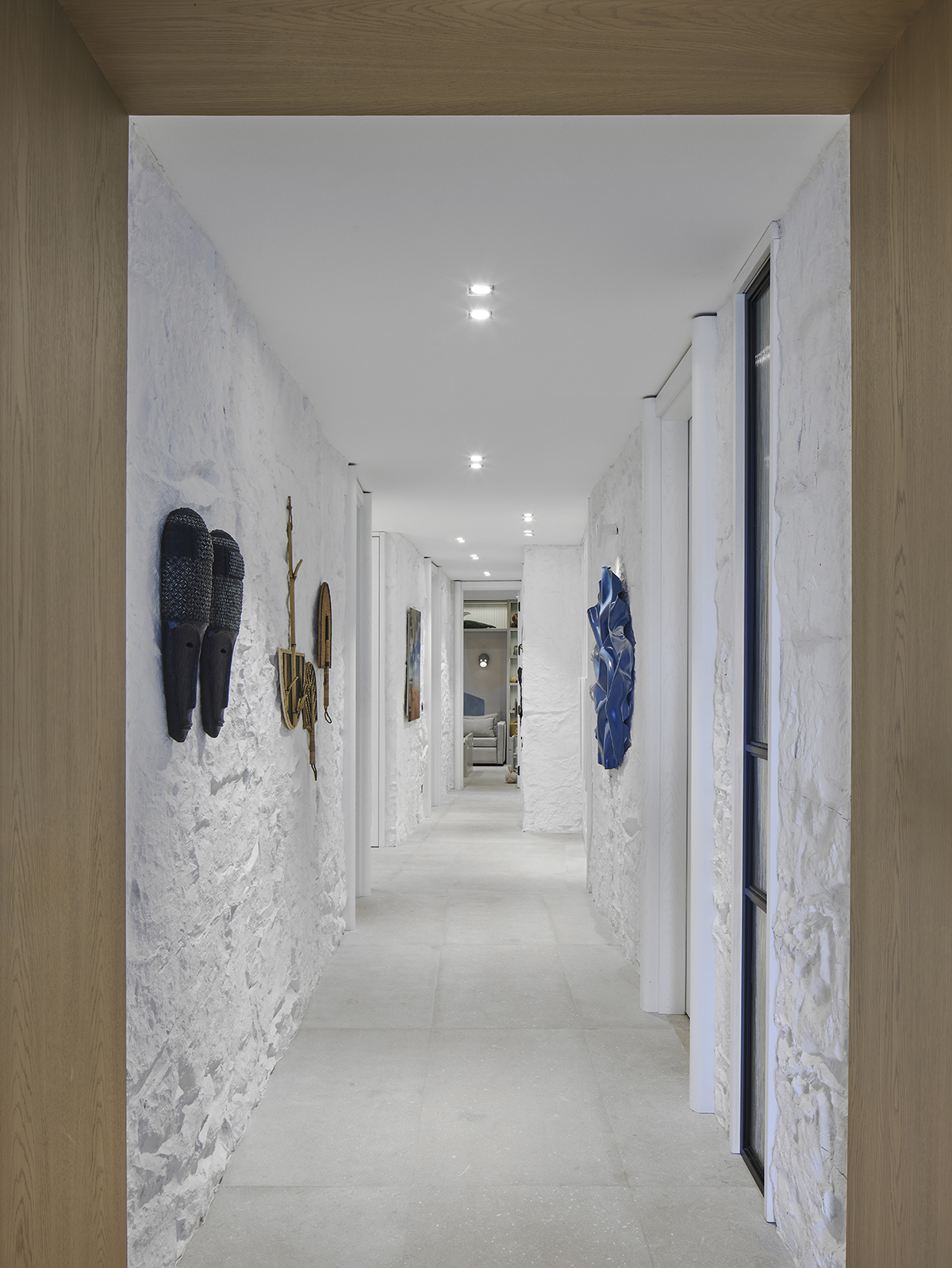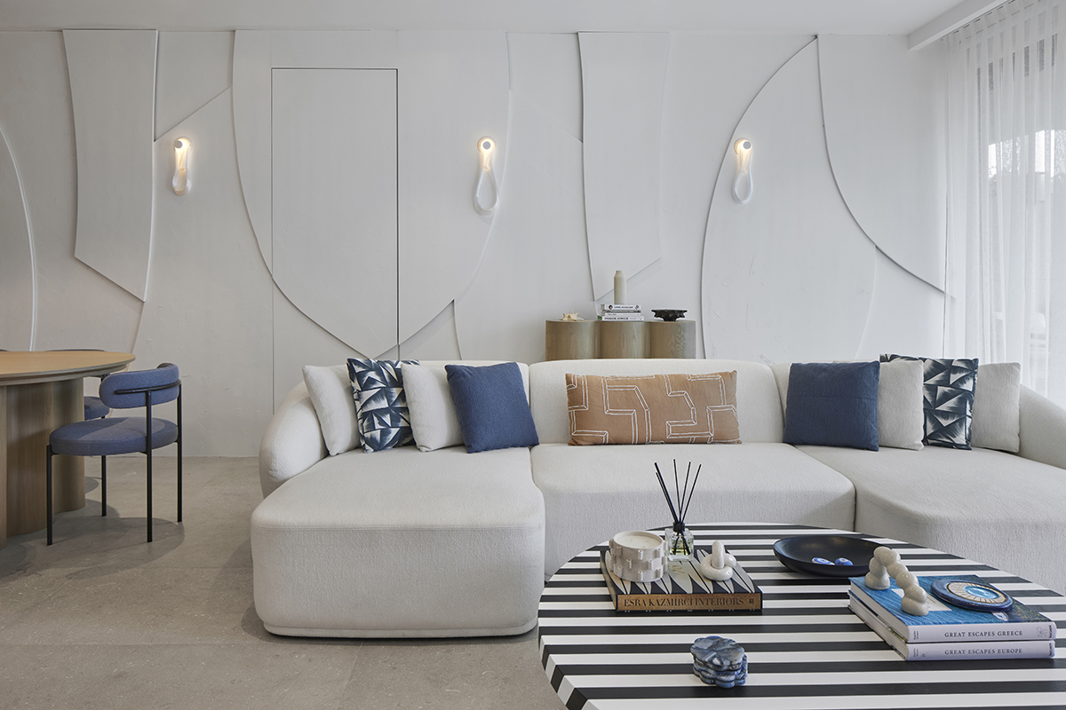 A calm summer palette defines the interiors, where white surfaces create a light backdrop enriched by natural textures and subtle color accents.