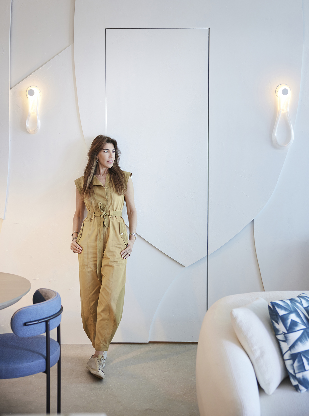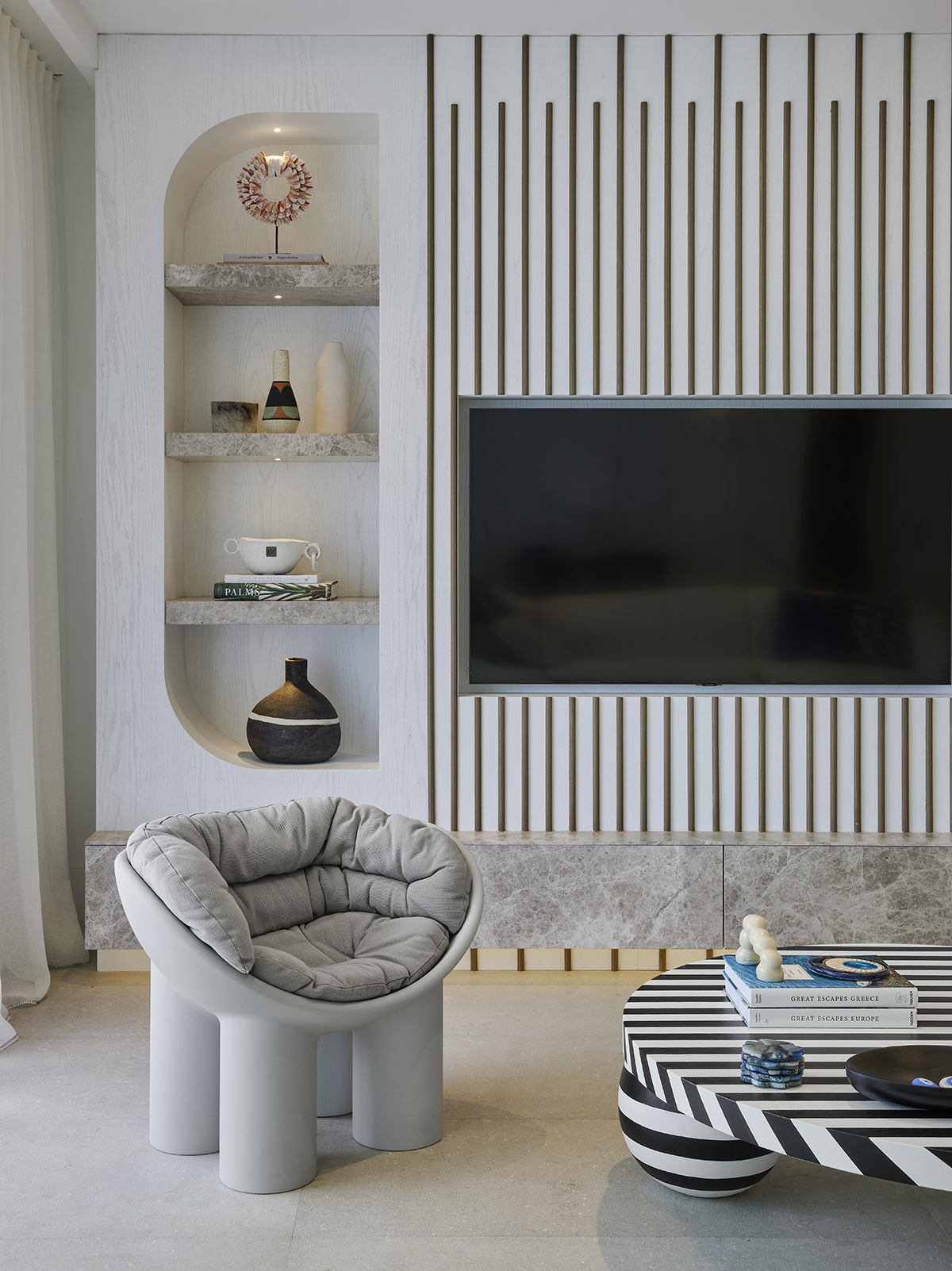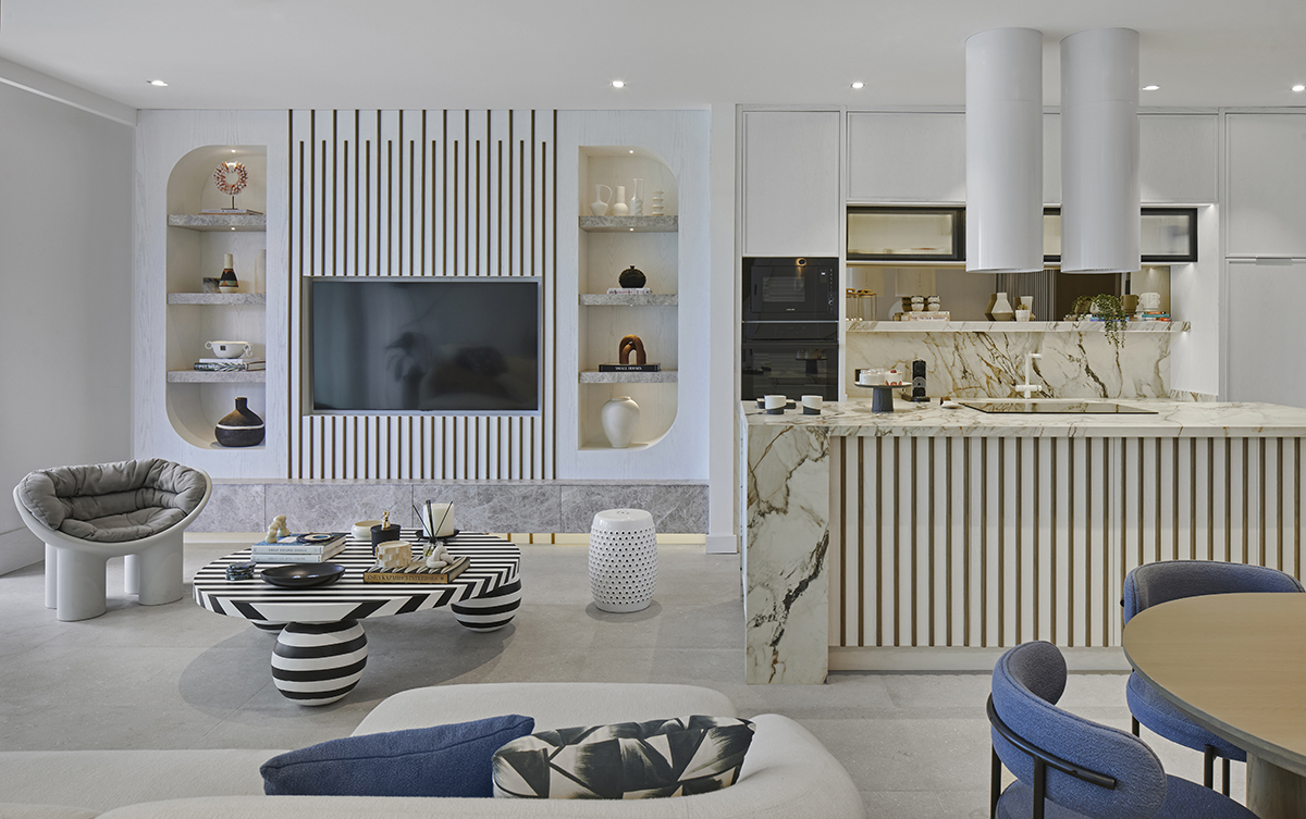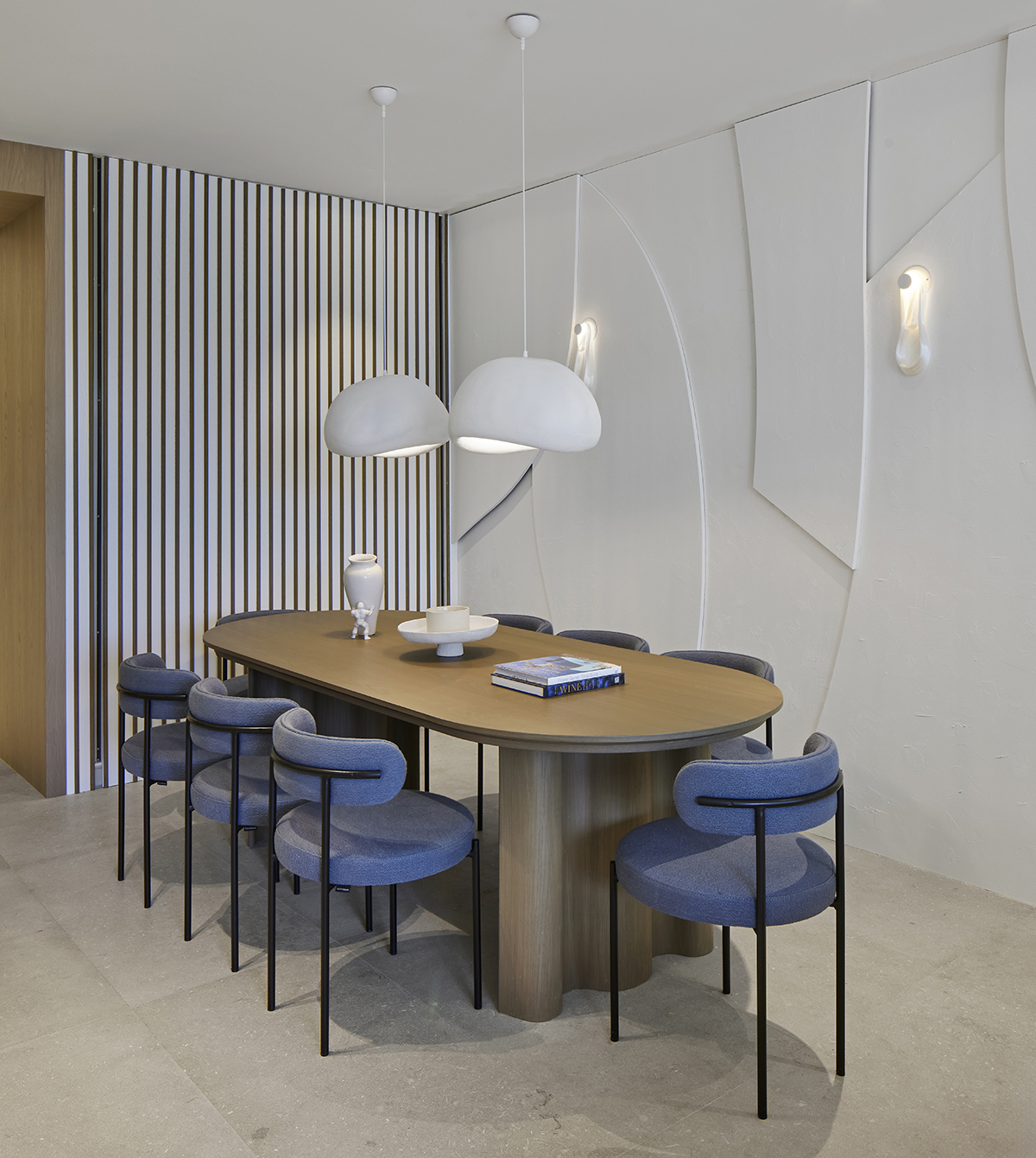 A calm summer palette defines the interiors, where white surfaces create a light backdrop enriched by natural textures and subtle color accents.
