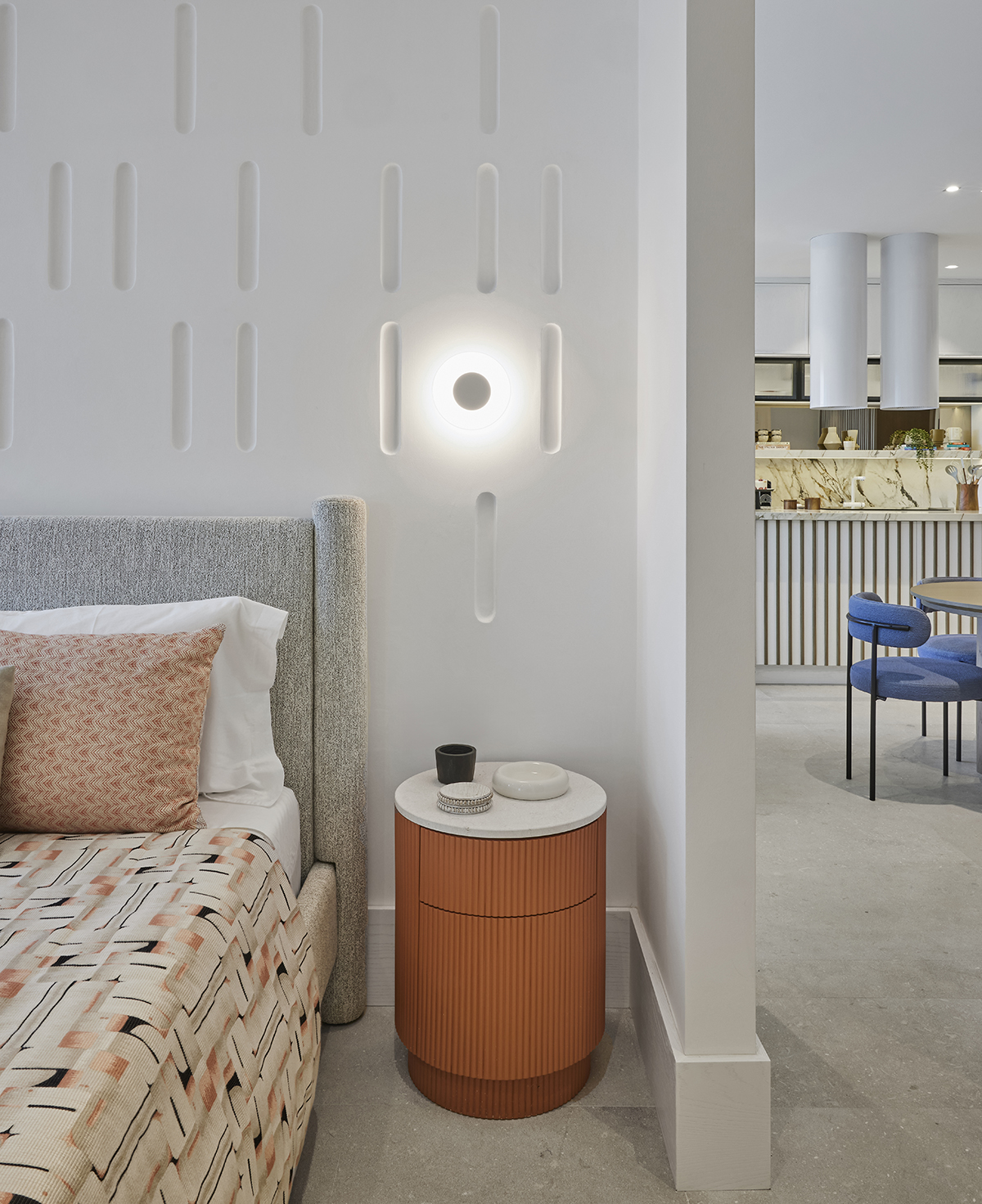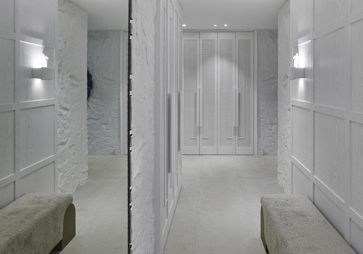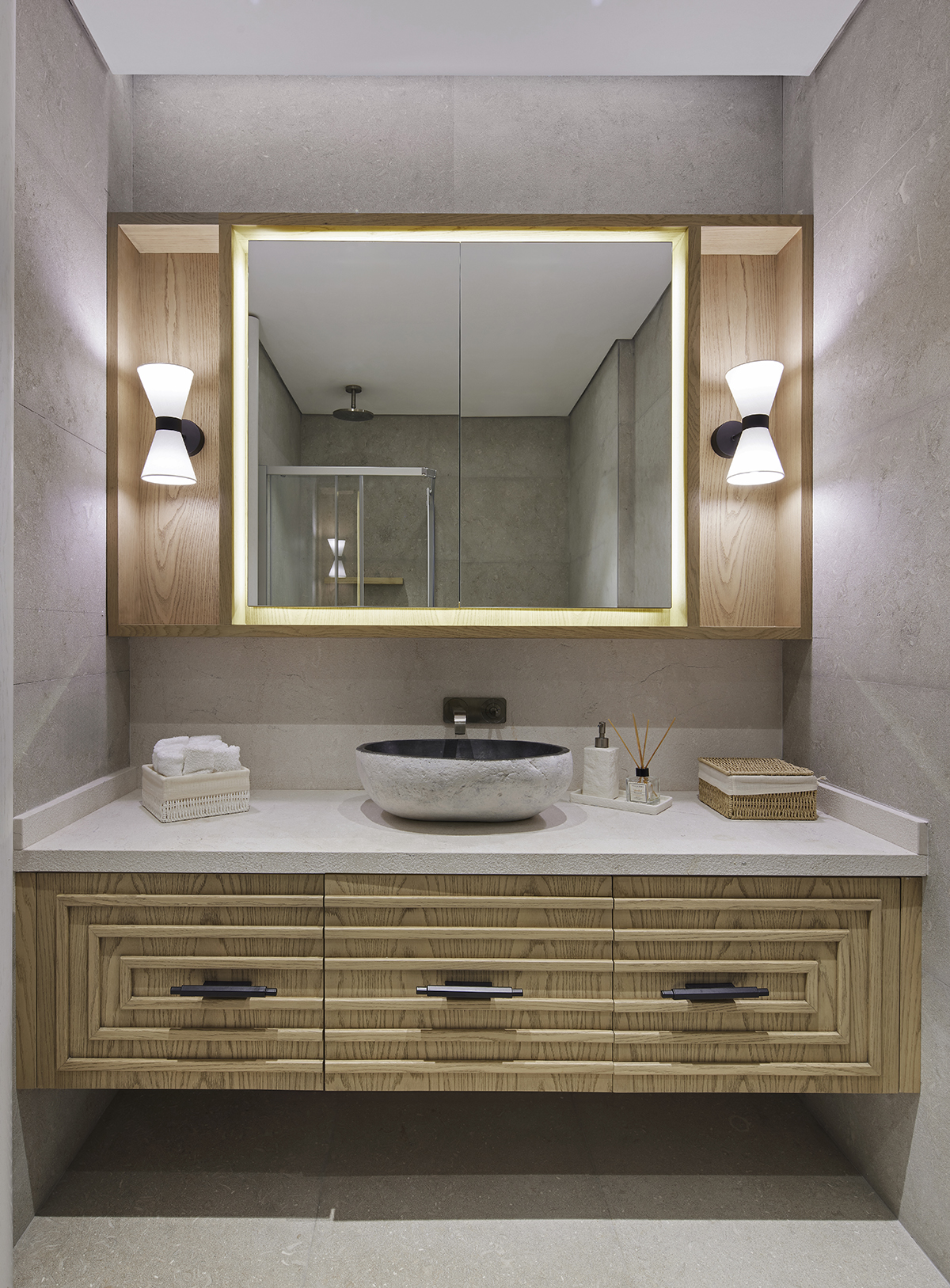White stone look wall panels, mirrors, and light toned wood cladding enhance brightness and depth, while blue accents in the living area reflect the homeowners’ personal preferences.