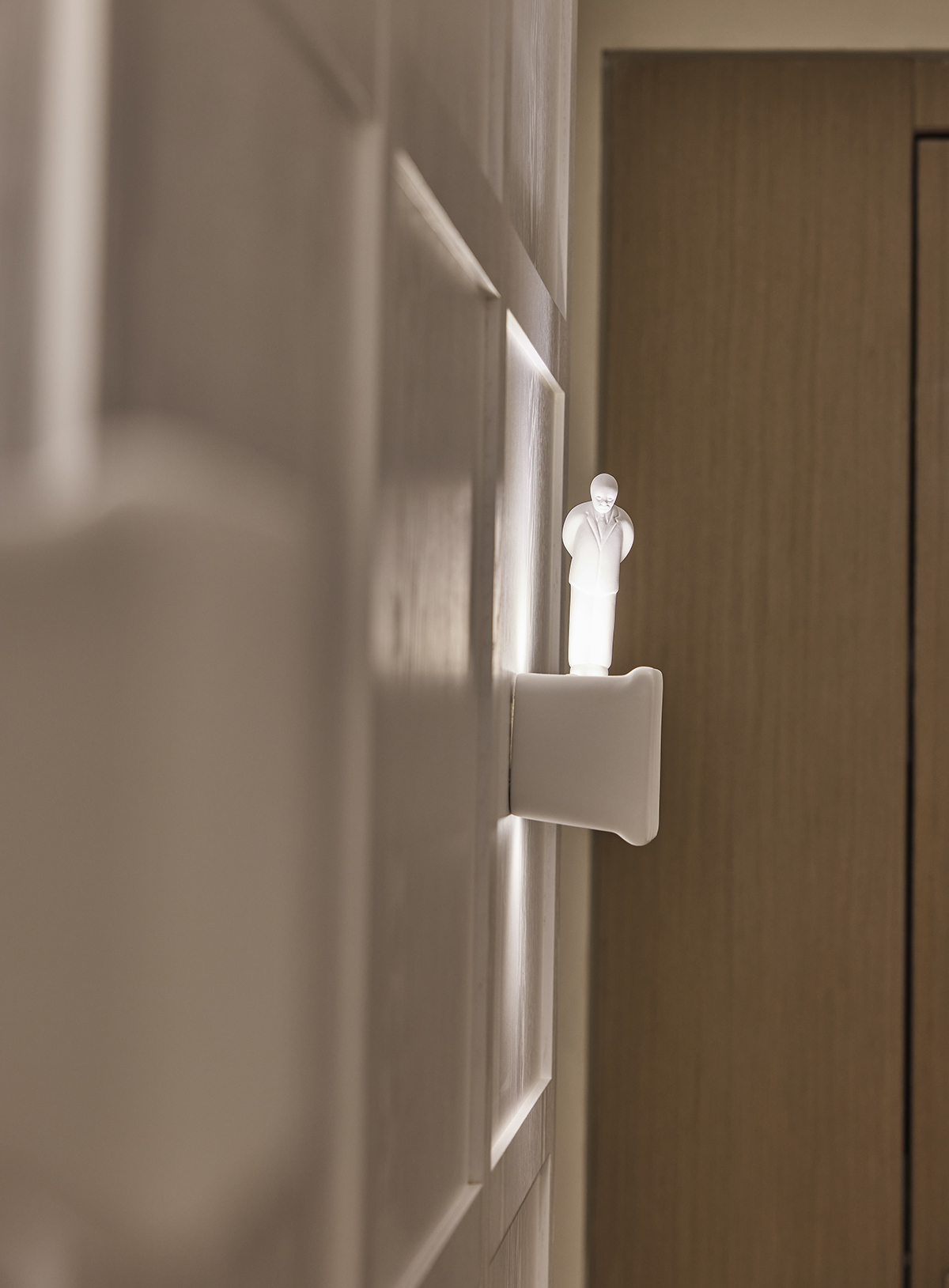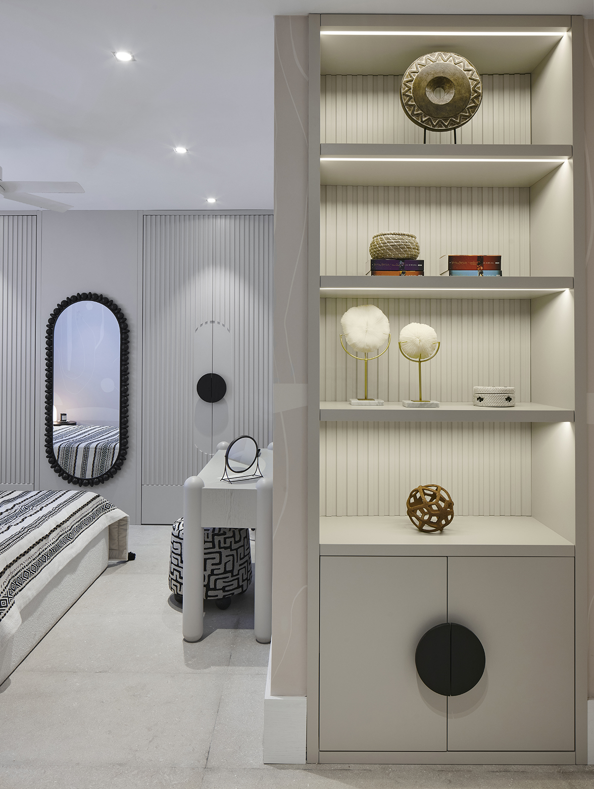 Lighting remains soft and layered, combining recessed spots, decorative wall lights, concealed LEDs, and ceiling fans in the bedrooms.