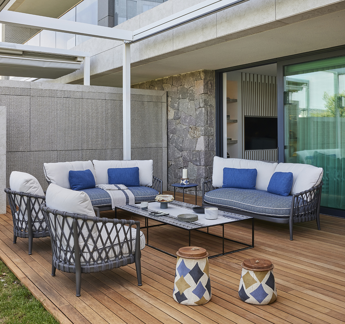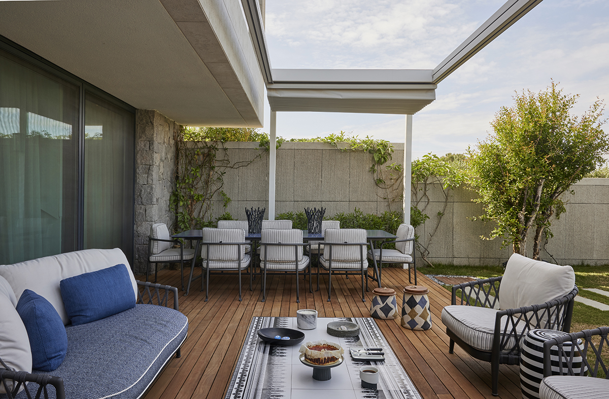Natural stone flooring runs throughout the interior, with iroko decking on the terrace.