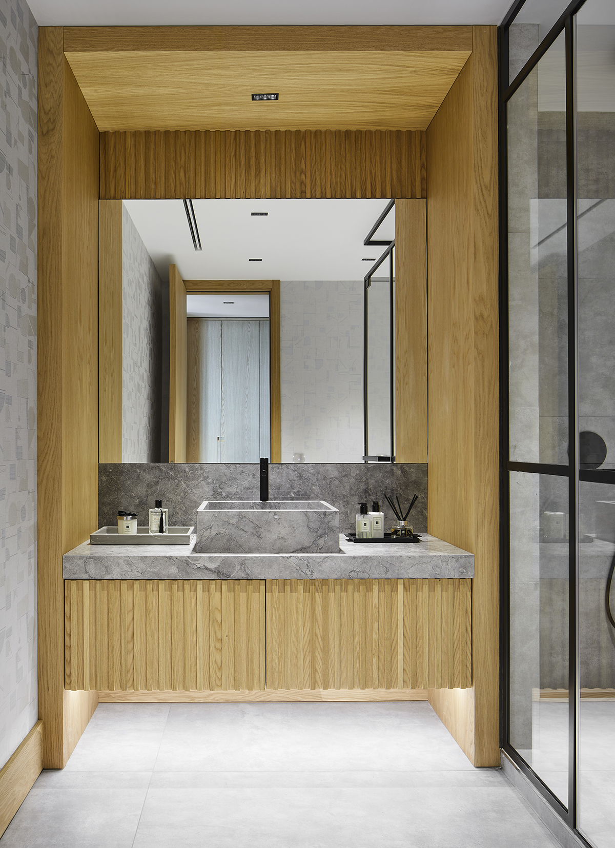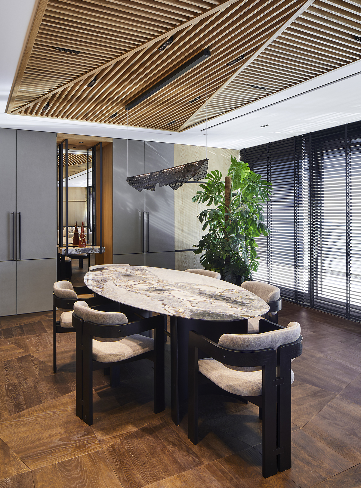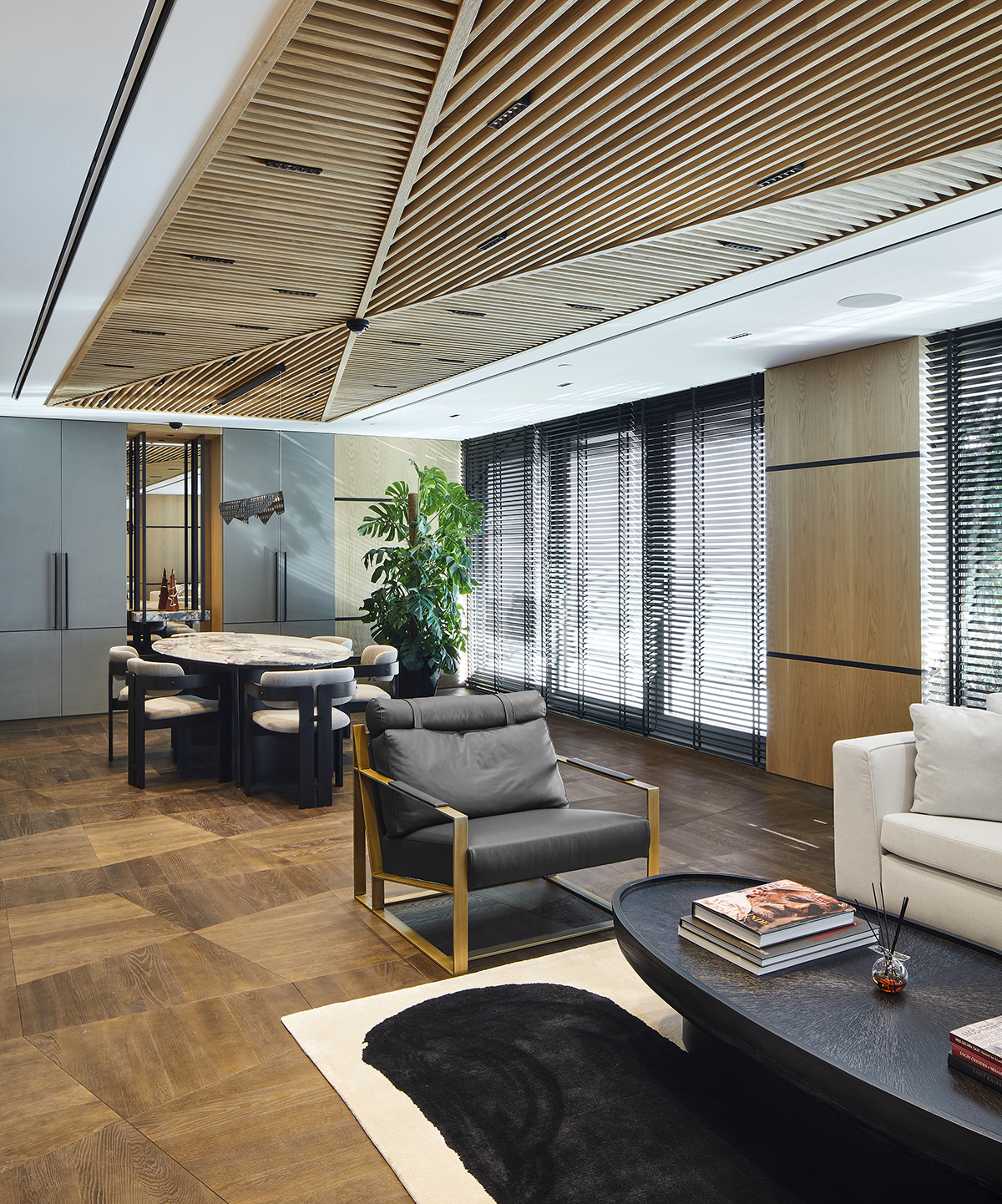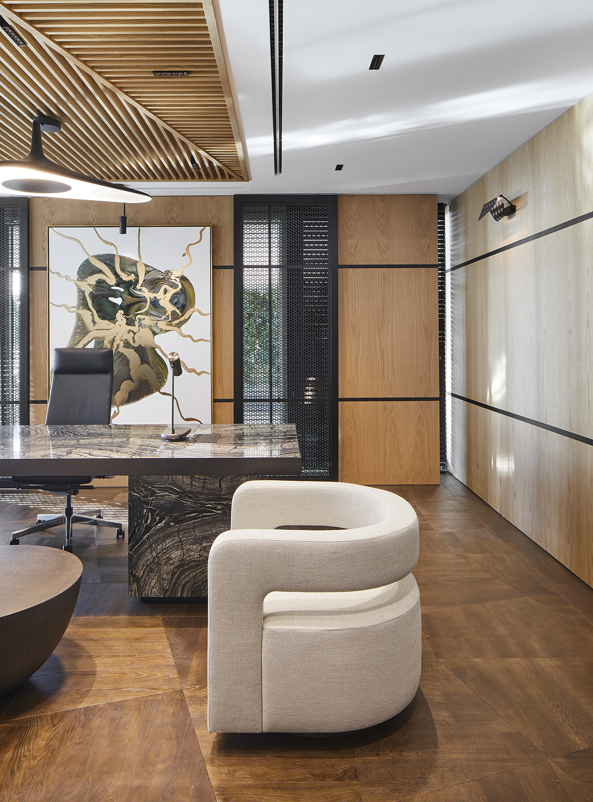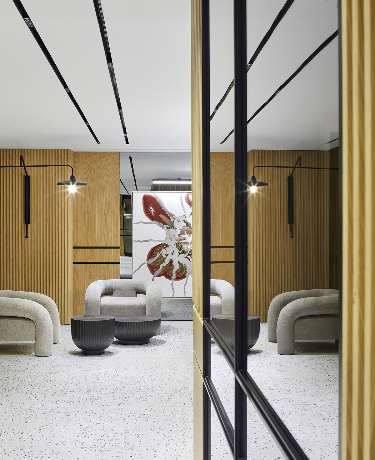 Natural oak finishes, terrazzo flooring with brass details, layered lighting, and custom designed furniture define the interior, while art pieces and sculptural elements enrich the spatial experience.