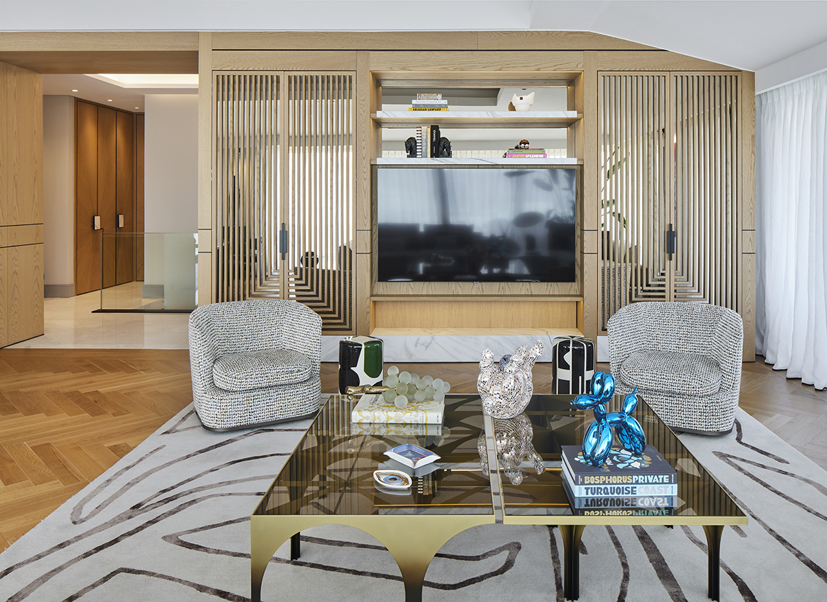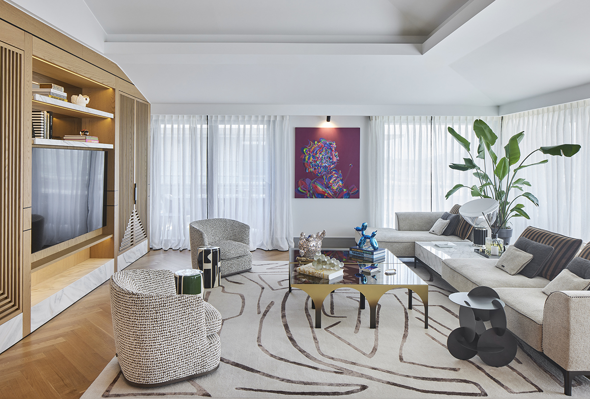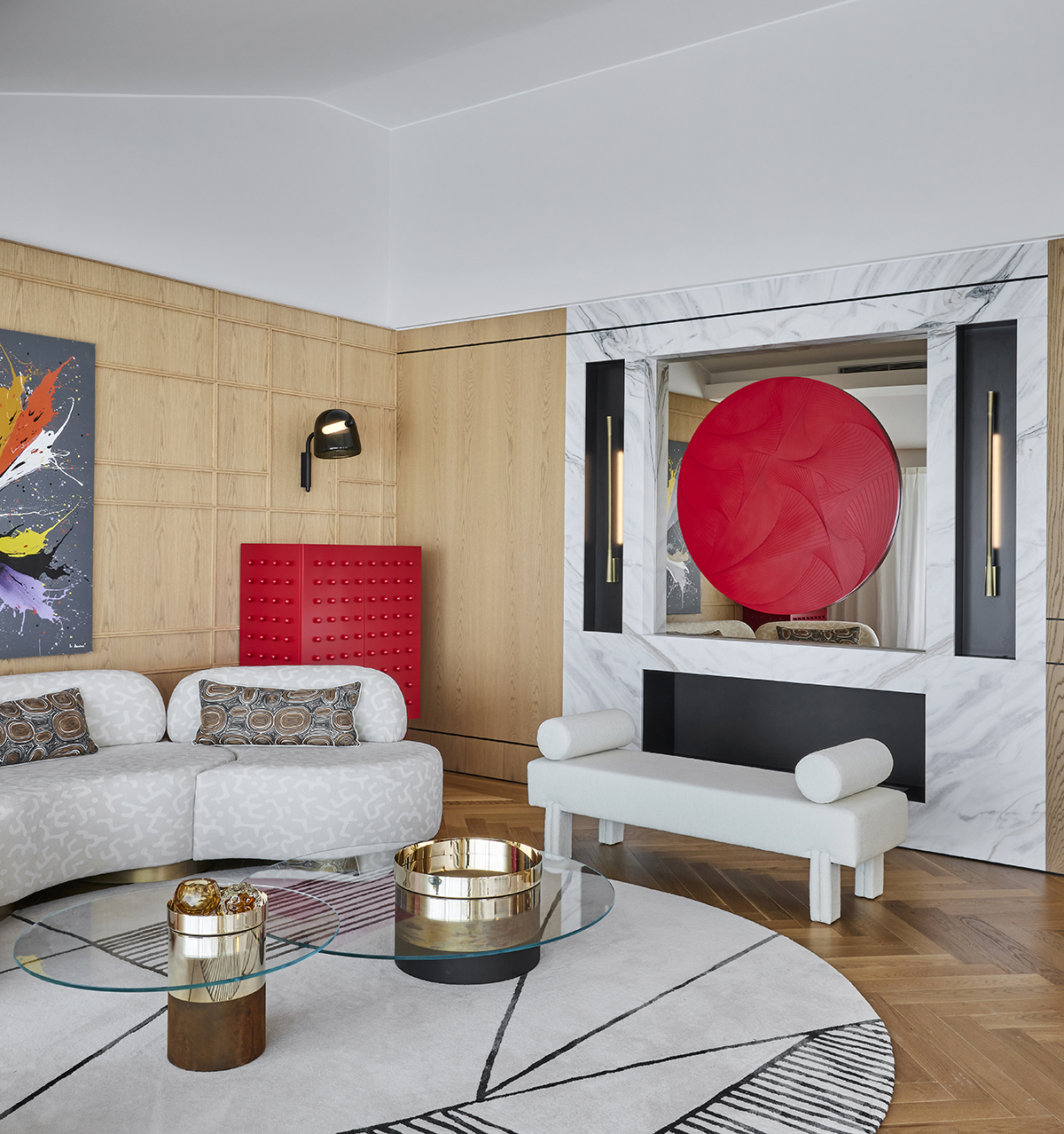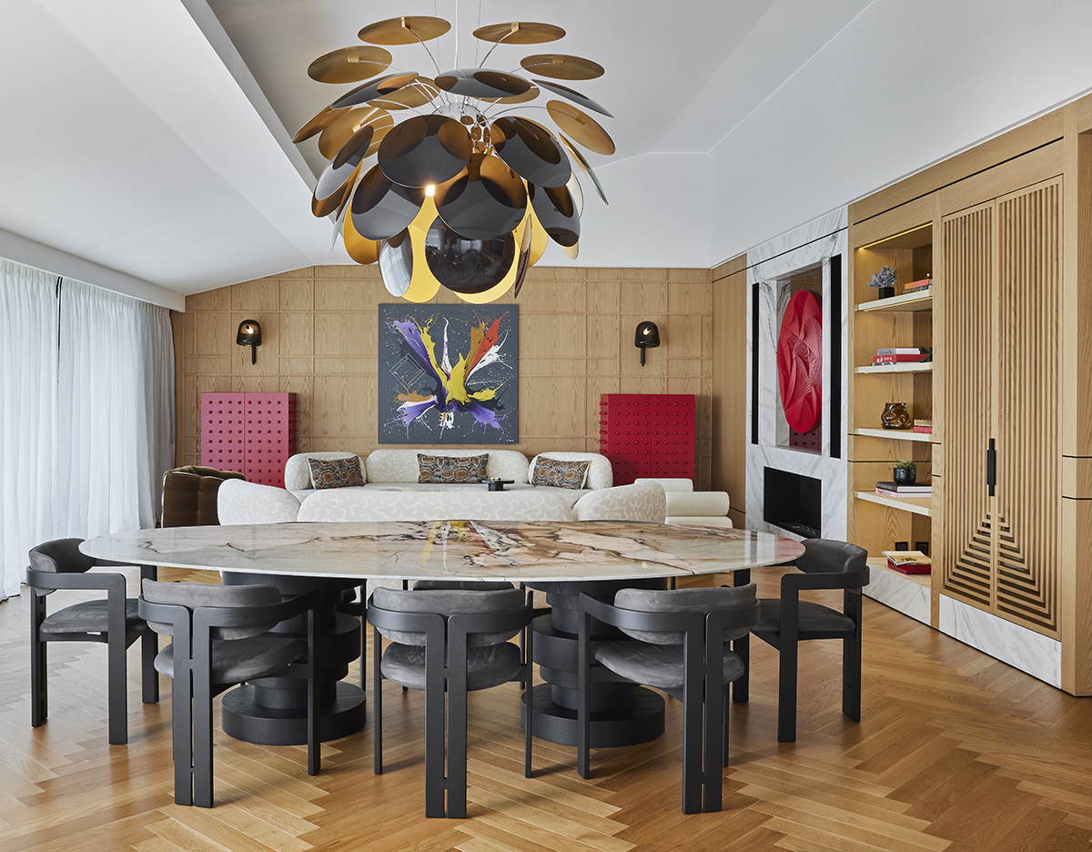 Artworks and selected design pieces introduce character and color, while layered lighting and a mix of marble and parquet flooring create a balanced, timeless atmosphere throughout.