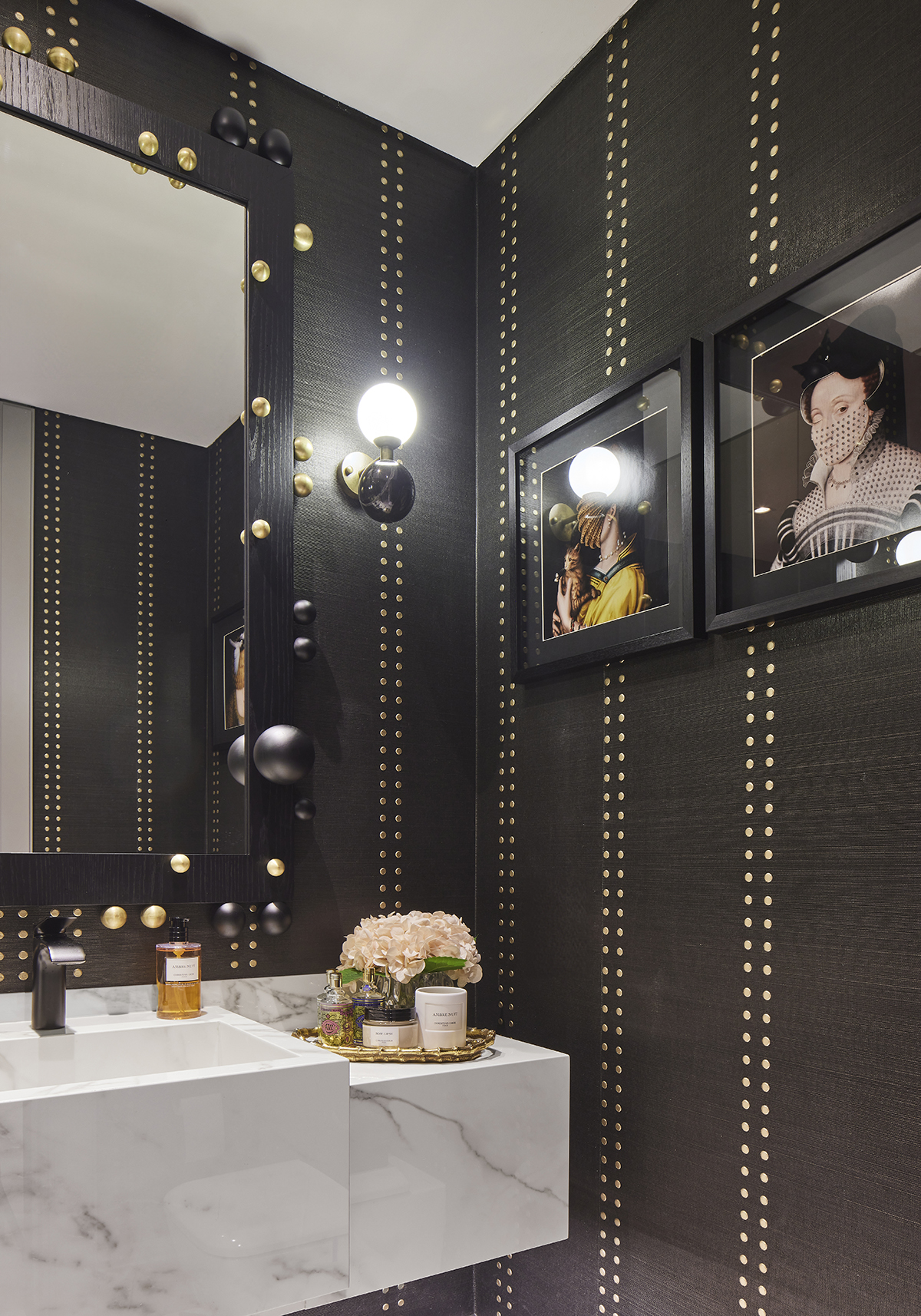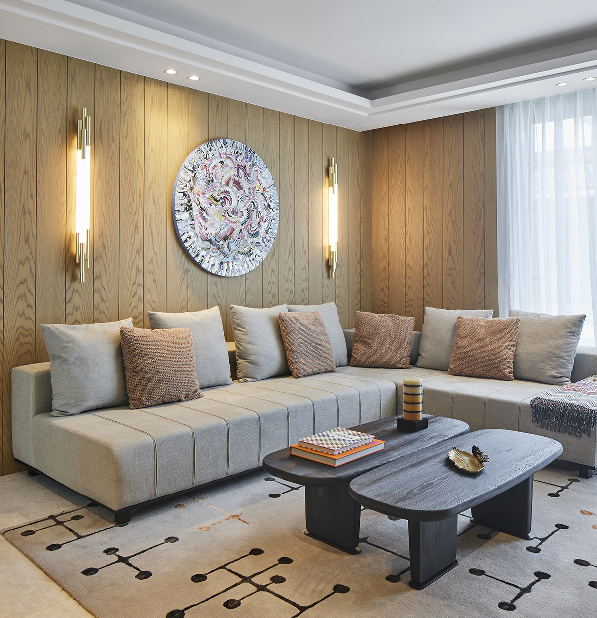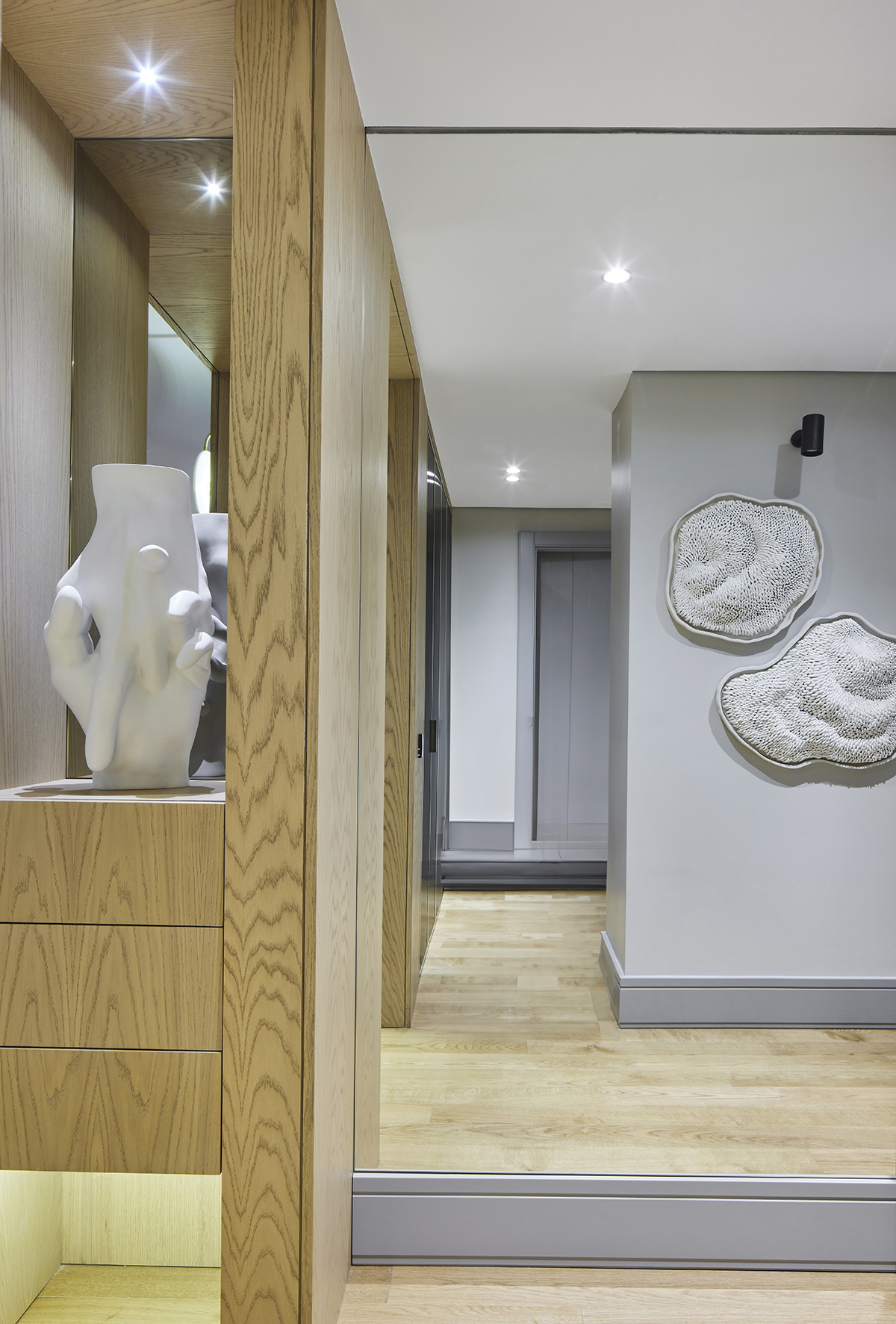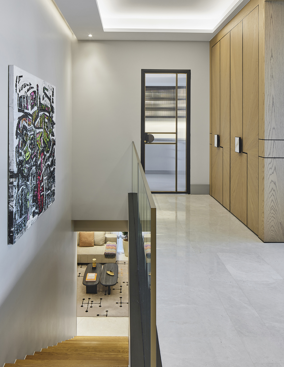 Artworks and selected design pieces introduce character and color, while layered lighting and a mix of marble and parquet flooring create a balanced, timeless atmosphere throughout.
