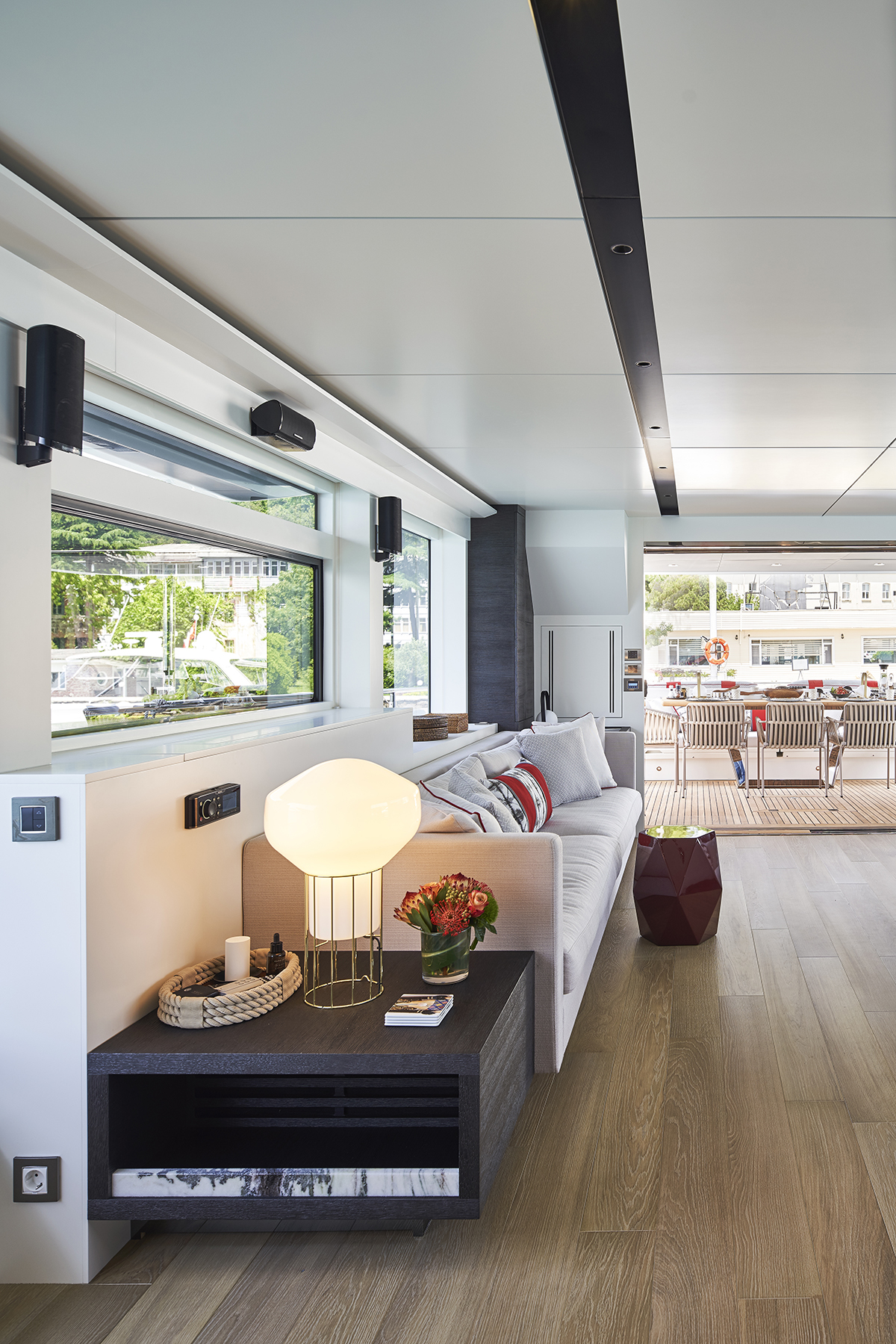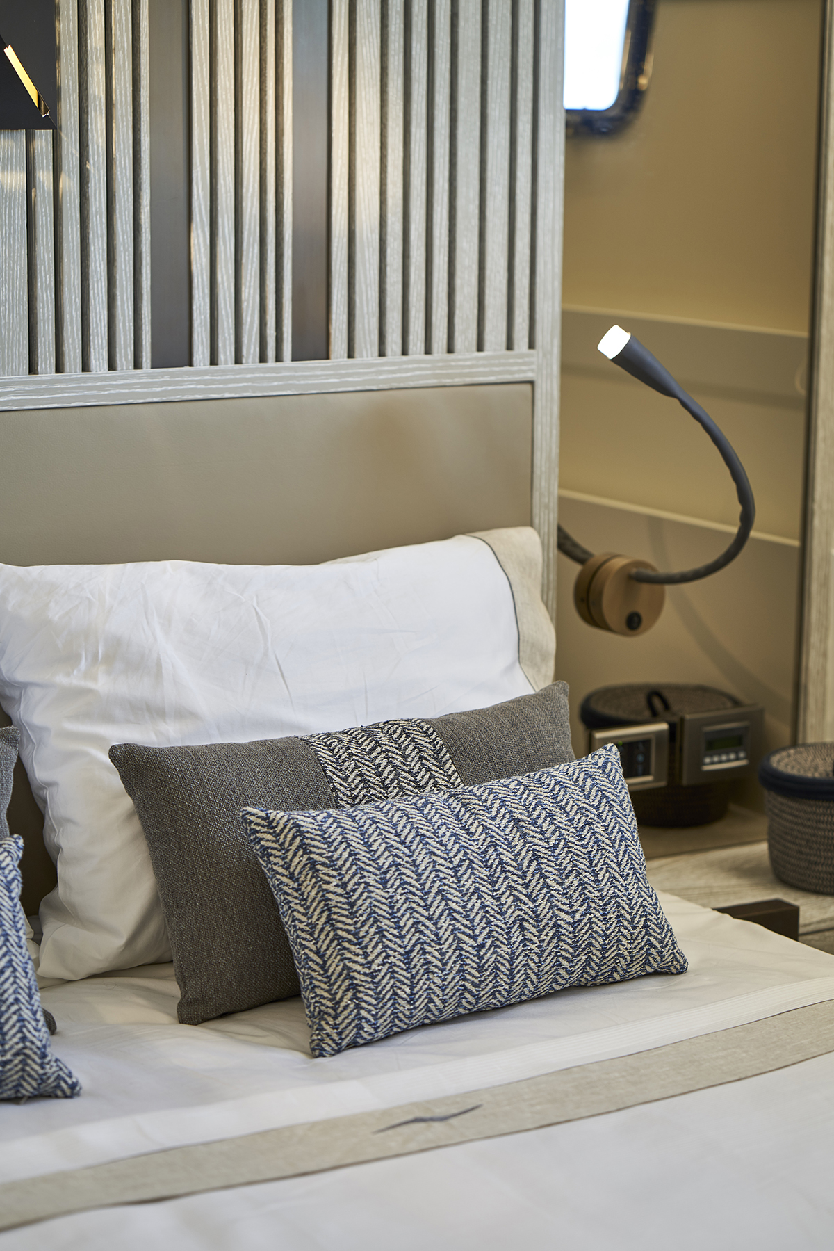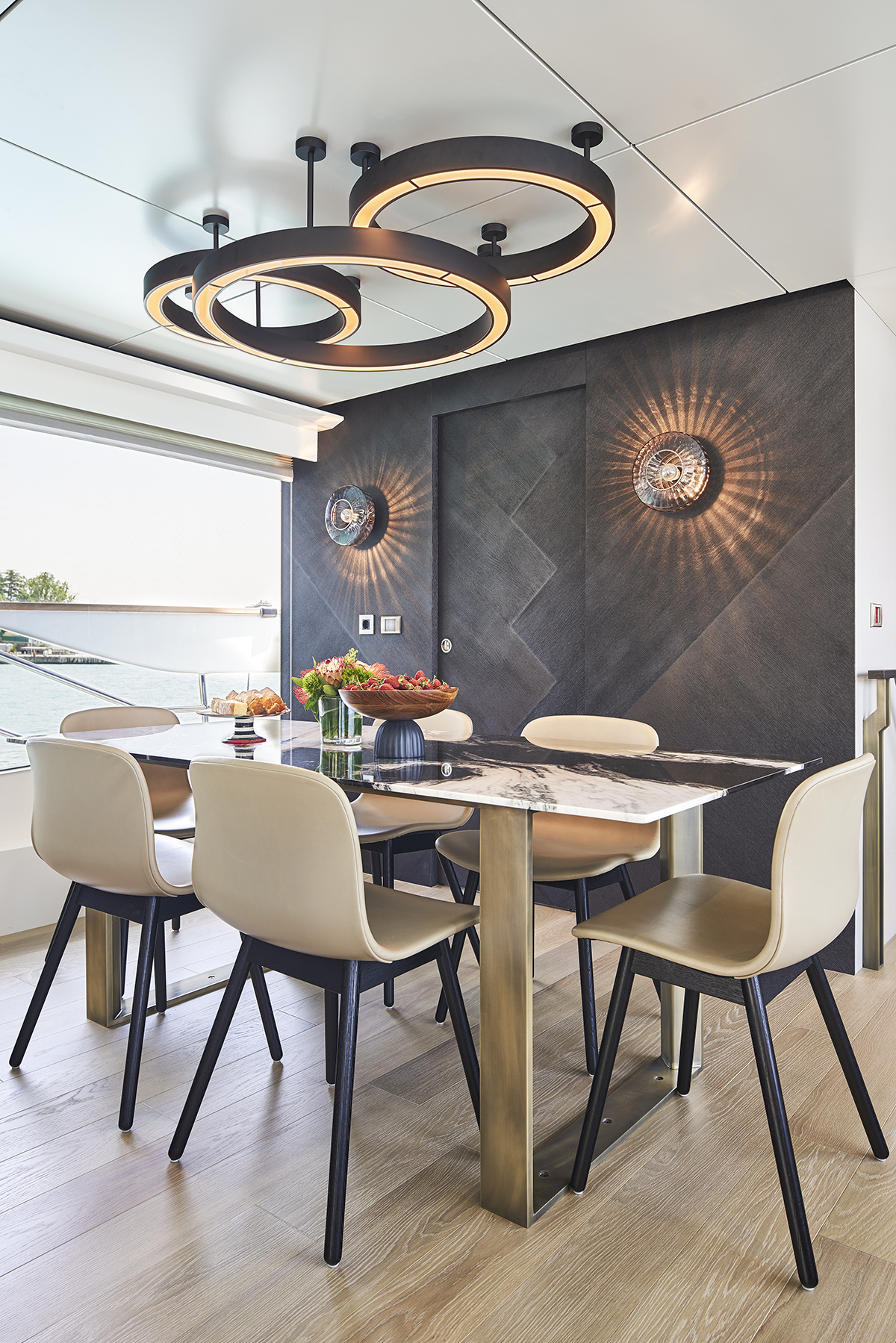 Layered lighting and a carefully curated material selection from oak flooring to wool carpets and Neolith surfaces ensure a cohesive and serene onboard atmosphere.