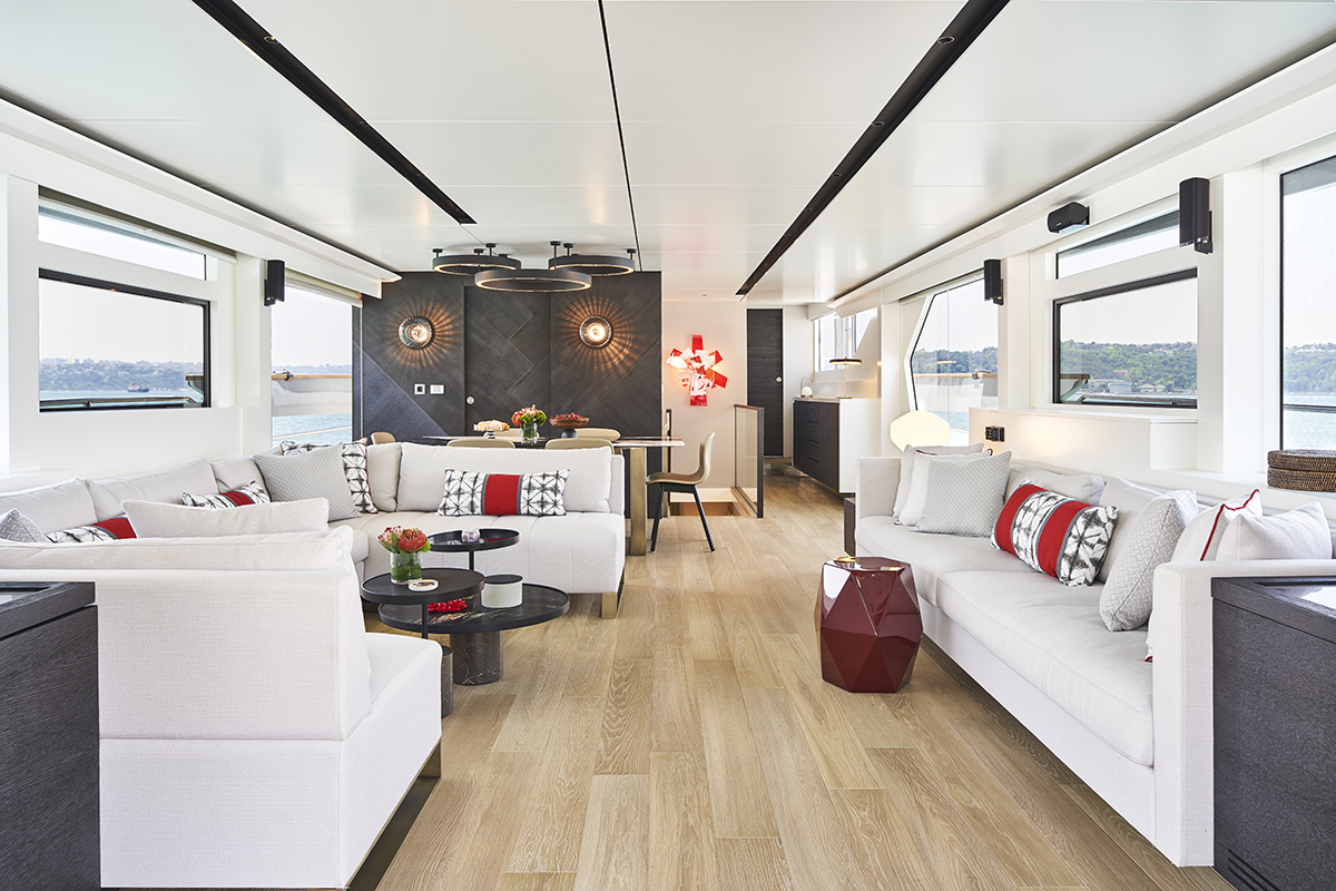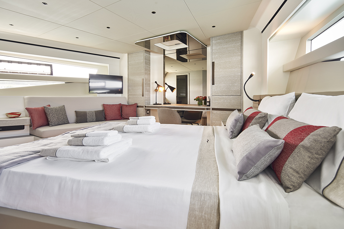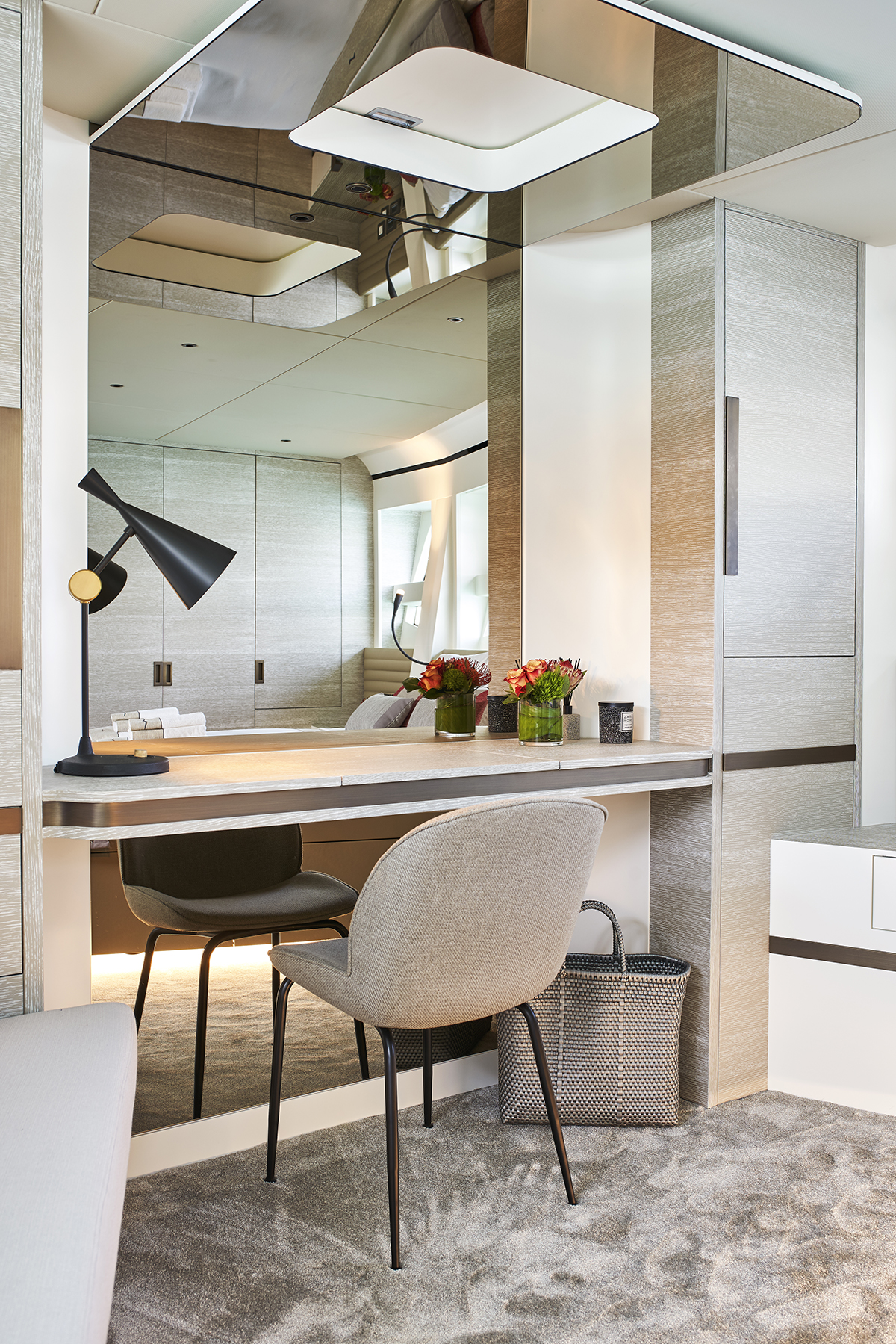 Layered lighting and a carefully curated material selection from oak flooring to wool carpets and Neolith surfaces ensure a cohesive and serene onboard atmosphere.