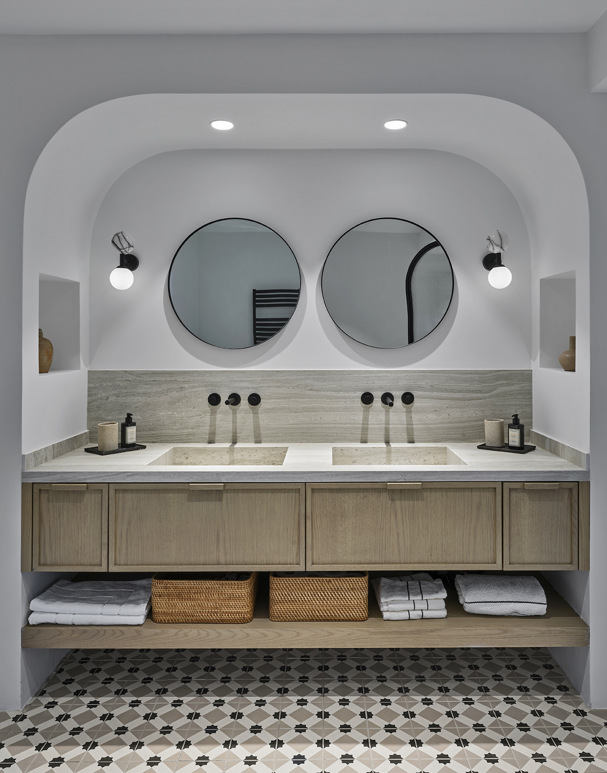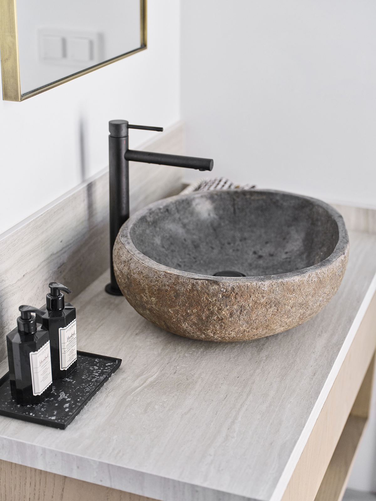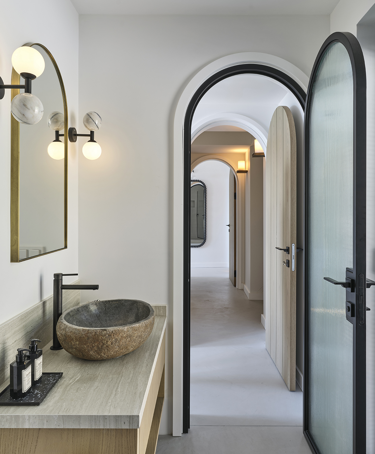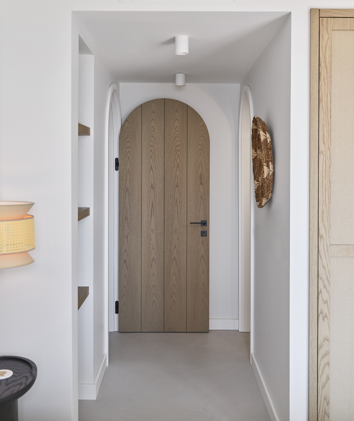 Light-toned surfaces, open oak furnishings, ethnic accents, and soft grey microtopping flooring create a warm yet restrained atmosphere, while mirrors and carefully positioned openings enhance light and spatial depth.
