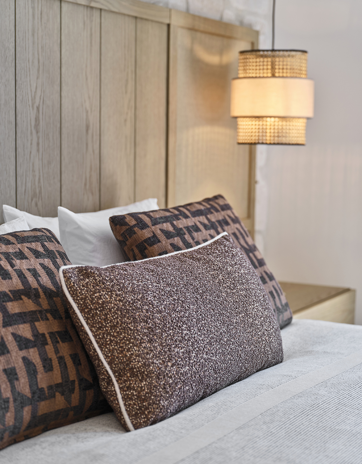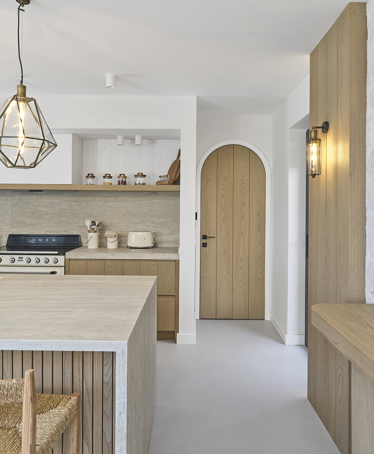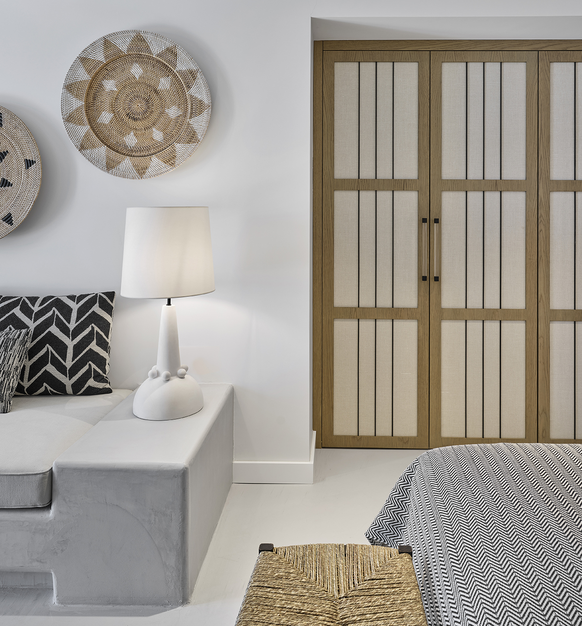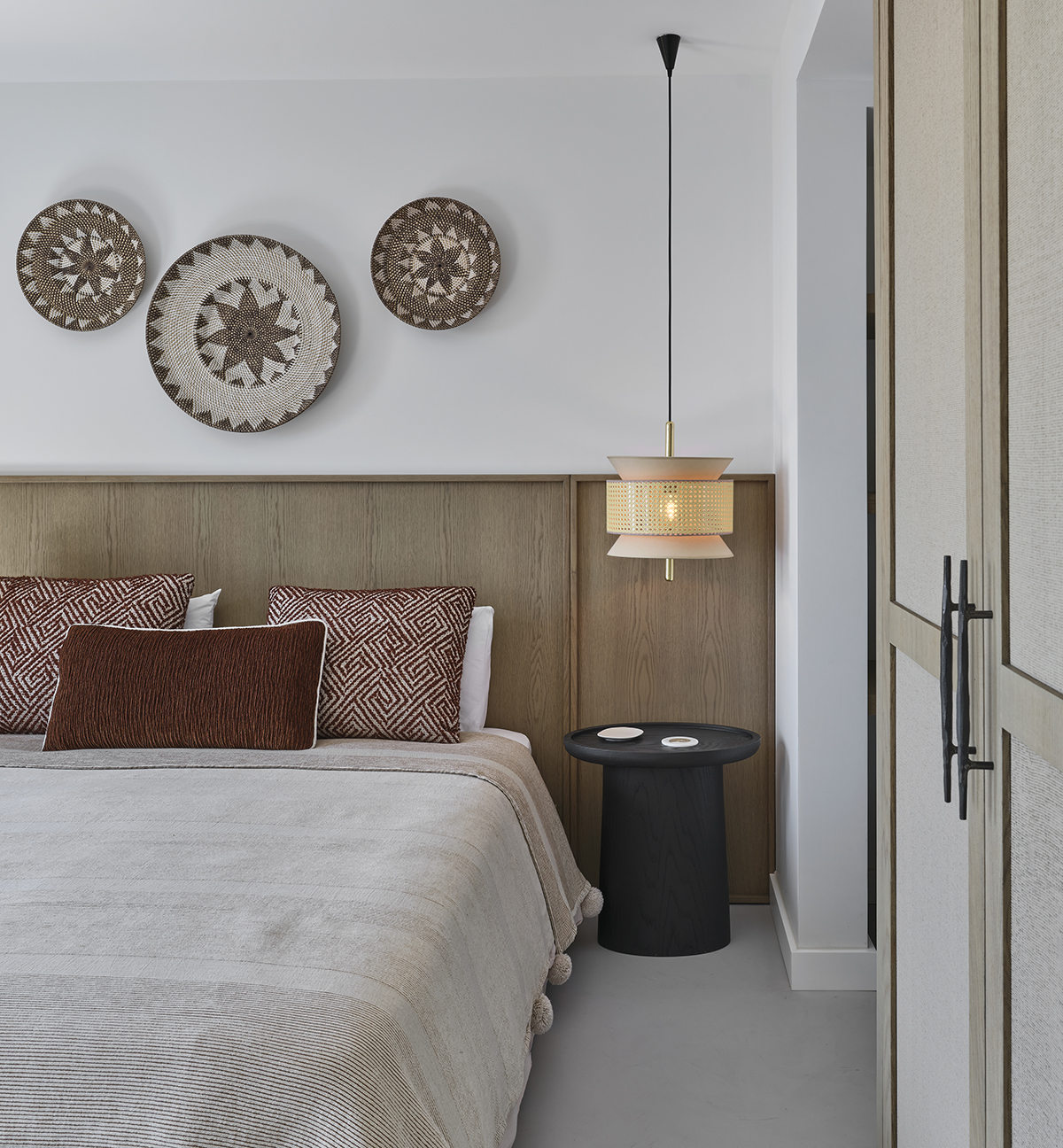 Light-toned surfaces, open oak furnishings, ethnic accents, and soft grey microtopping flooring create a warm yet restrained atmosphere, while mirrors and carefully positioned openings enhance light and spatial depth.