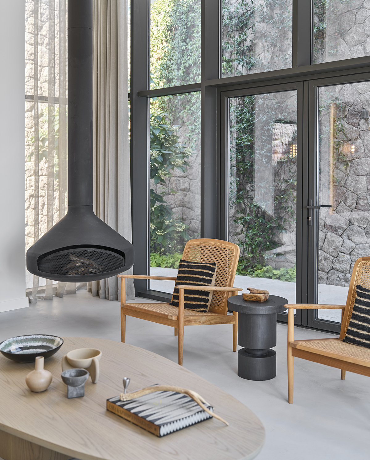 A striking six meter high black wood-burning fireplace anchors the living space, adding both scale and character.
