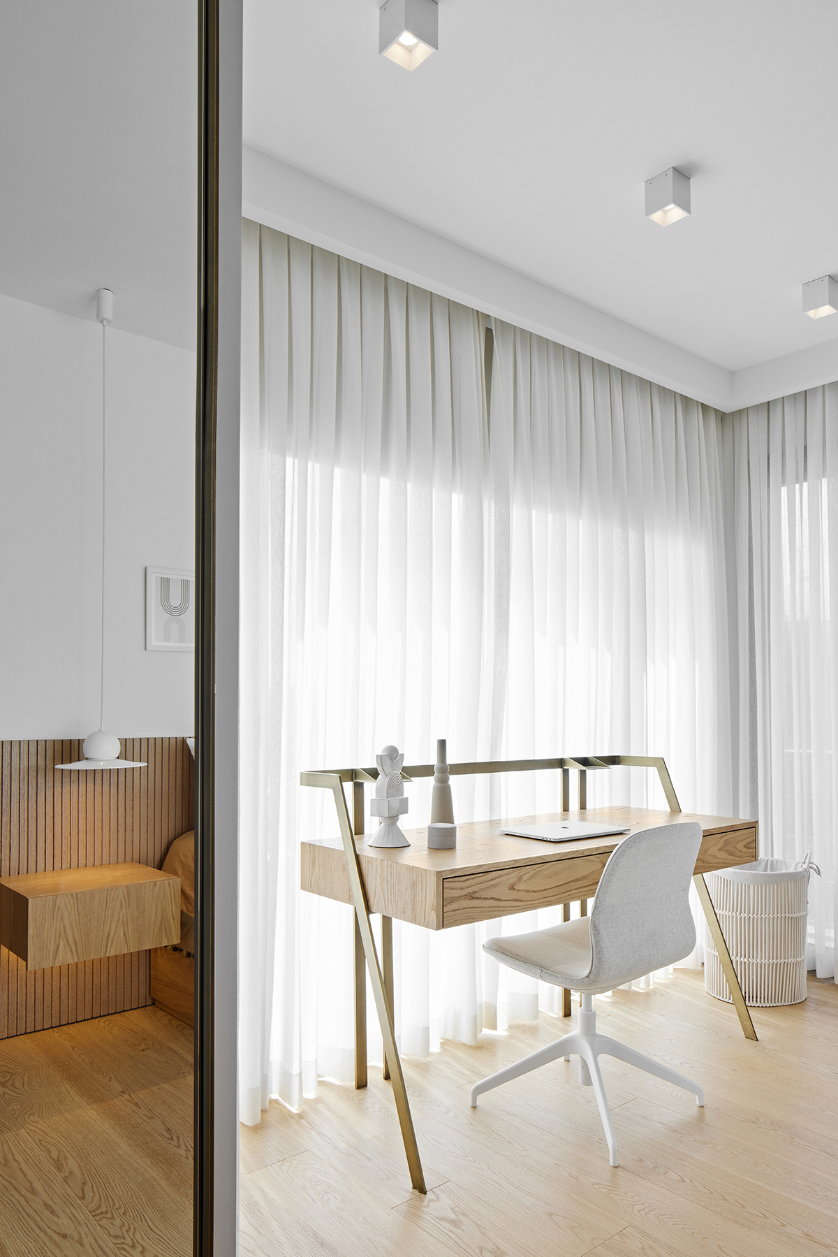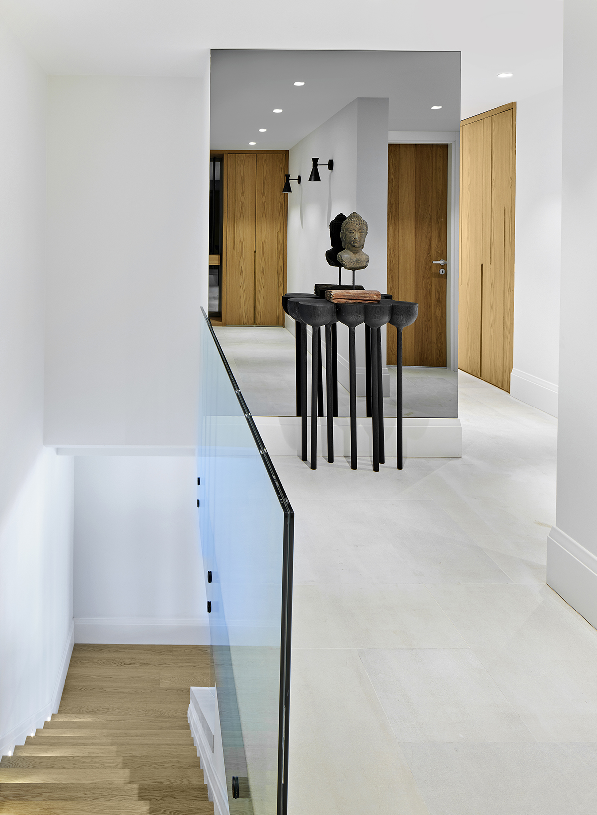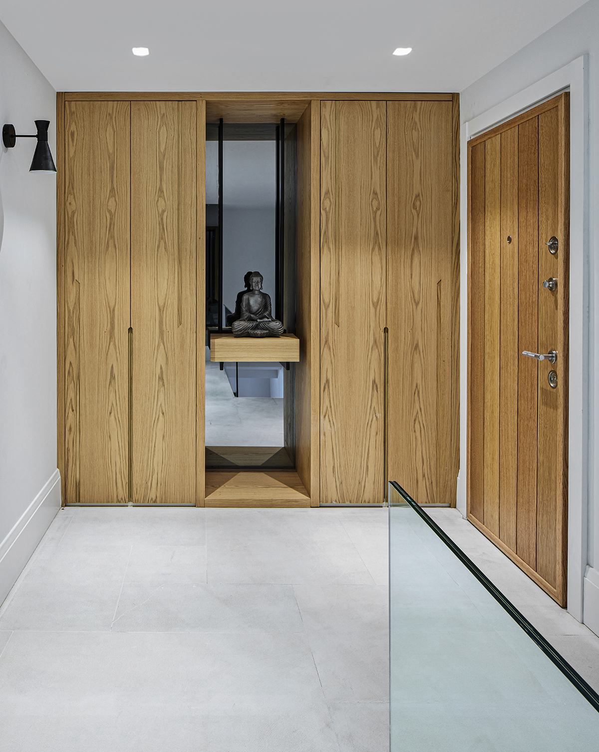 A custom oak and Italian glass partition gently defines the kitchen and living areas, while bronze and smoked mirrors enhance light and spatial depth.