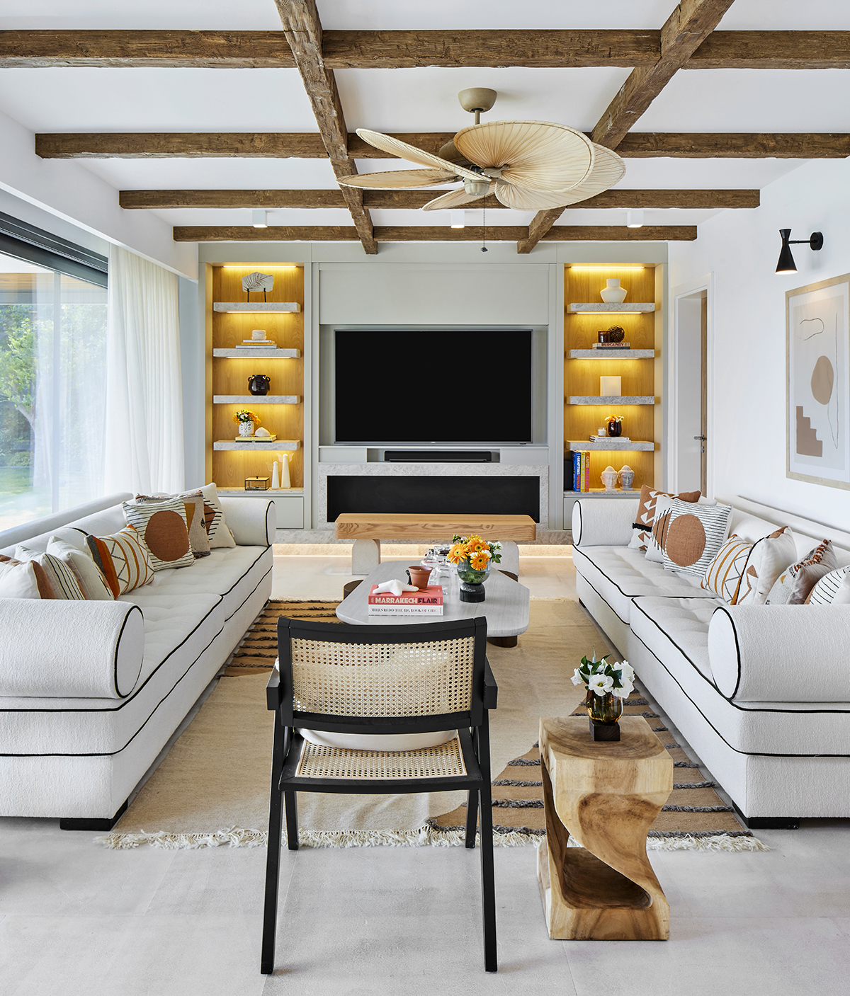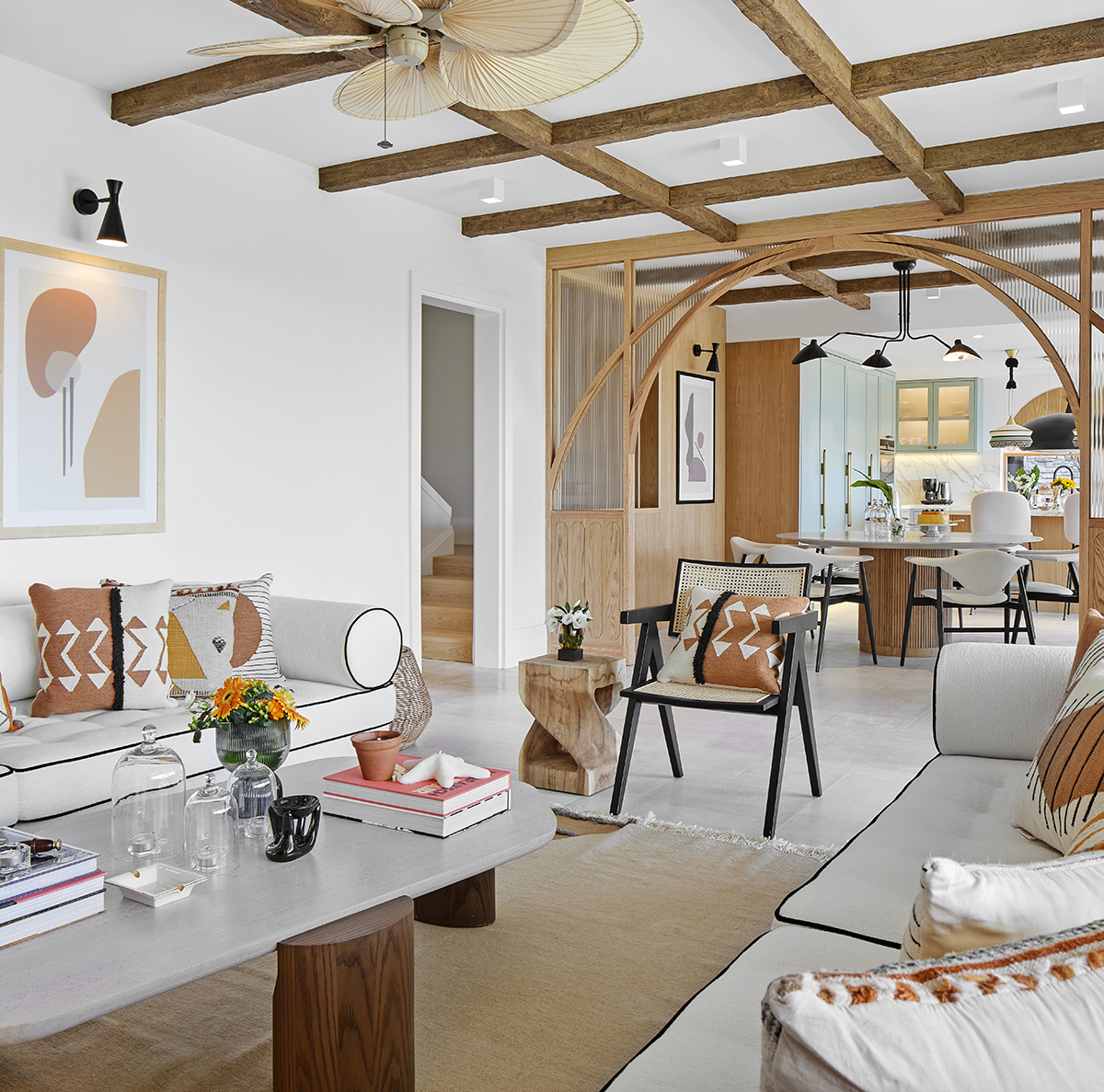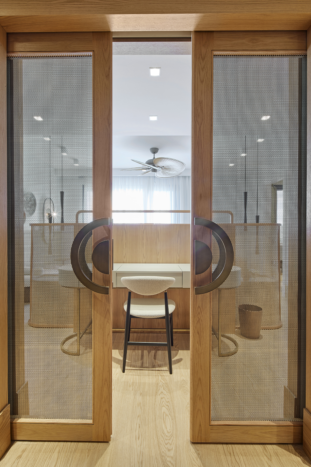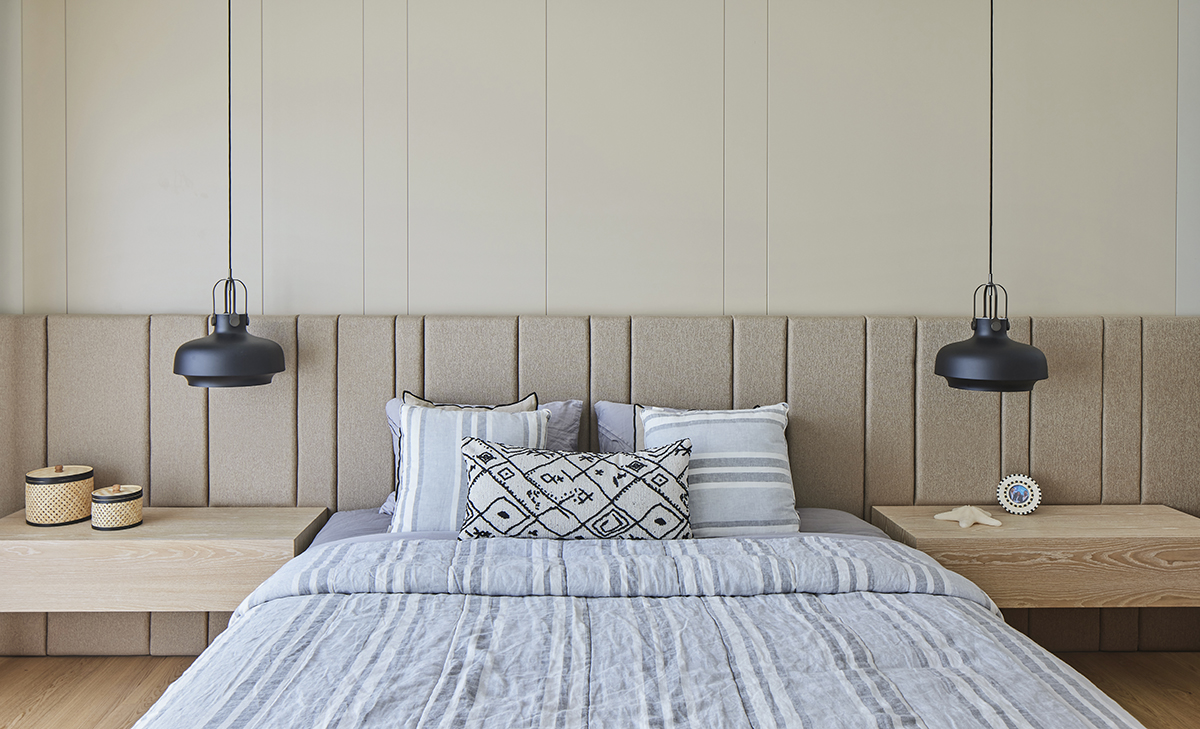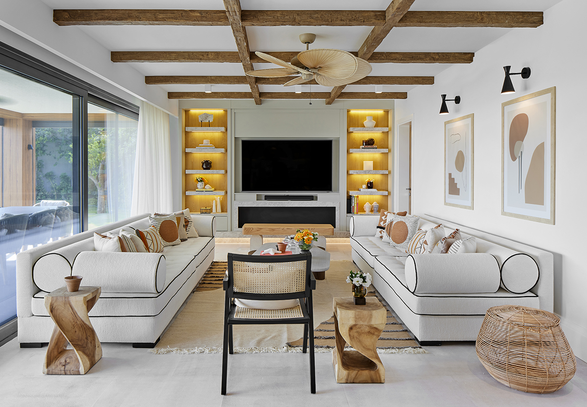 Lighting was kept understated, combining surface mounted spotlights, pendants, ceiling fans, and concealed LED details.