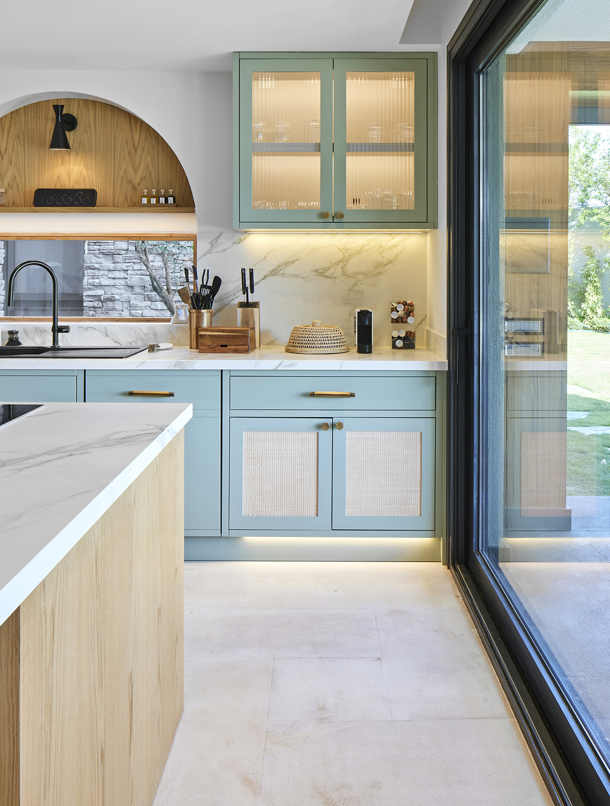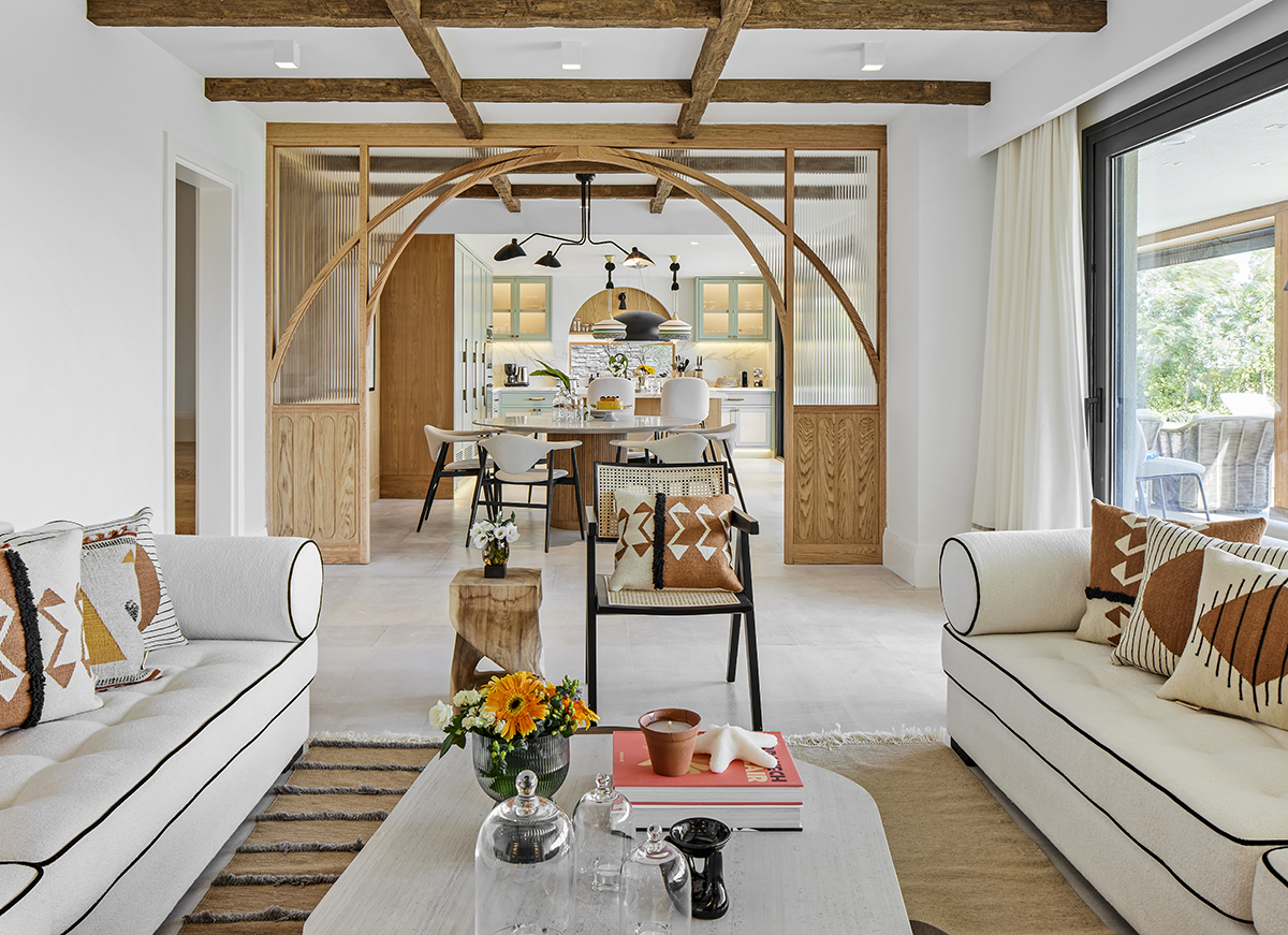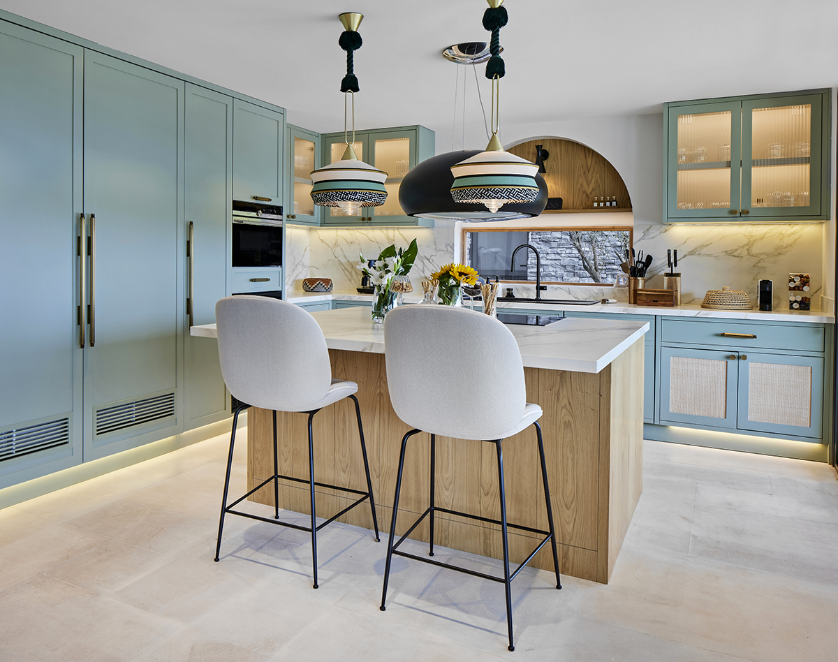 A palette of light oak, lacquered surfaces, and natural stone forms the base of the interior, enriched with subtle mint and orange accents that reflect the spirit of summer.