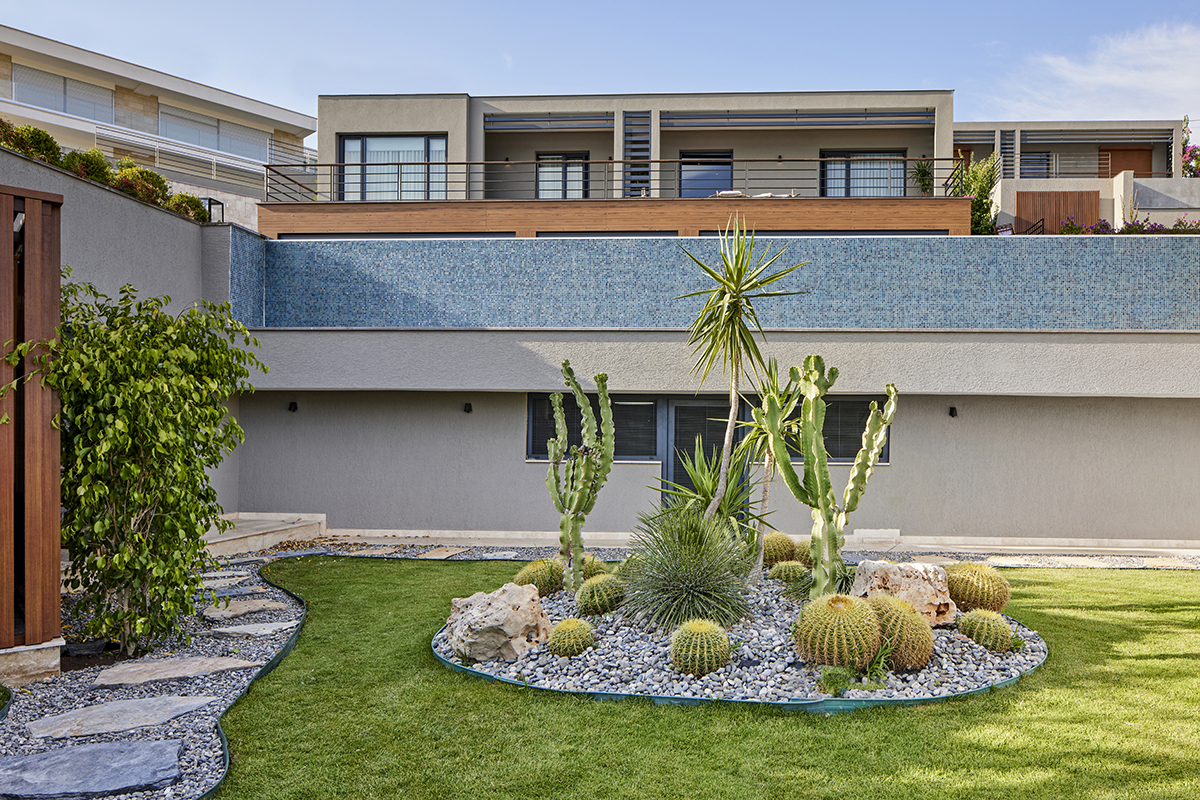 Natural stone, textured finishes, and oak flooring complete the interior, while a thoughtfully designed landscape of Mediterranean plants frames the outdoor spaces in harmony with the setting.