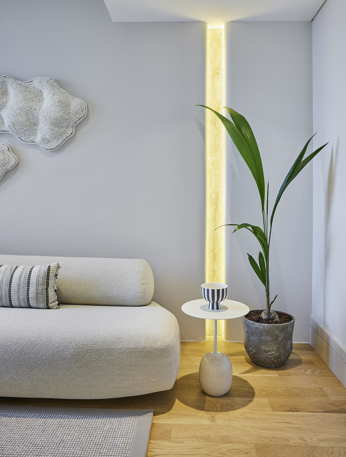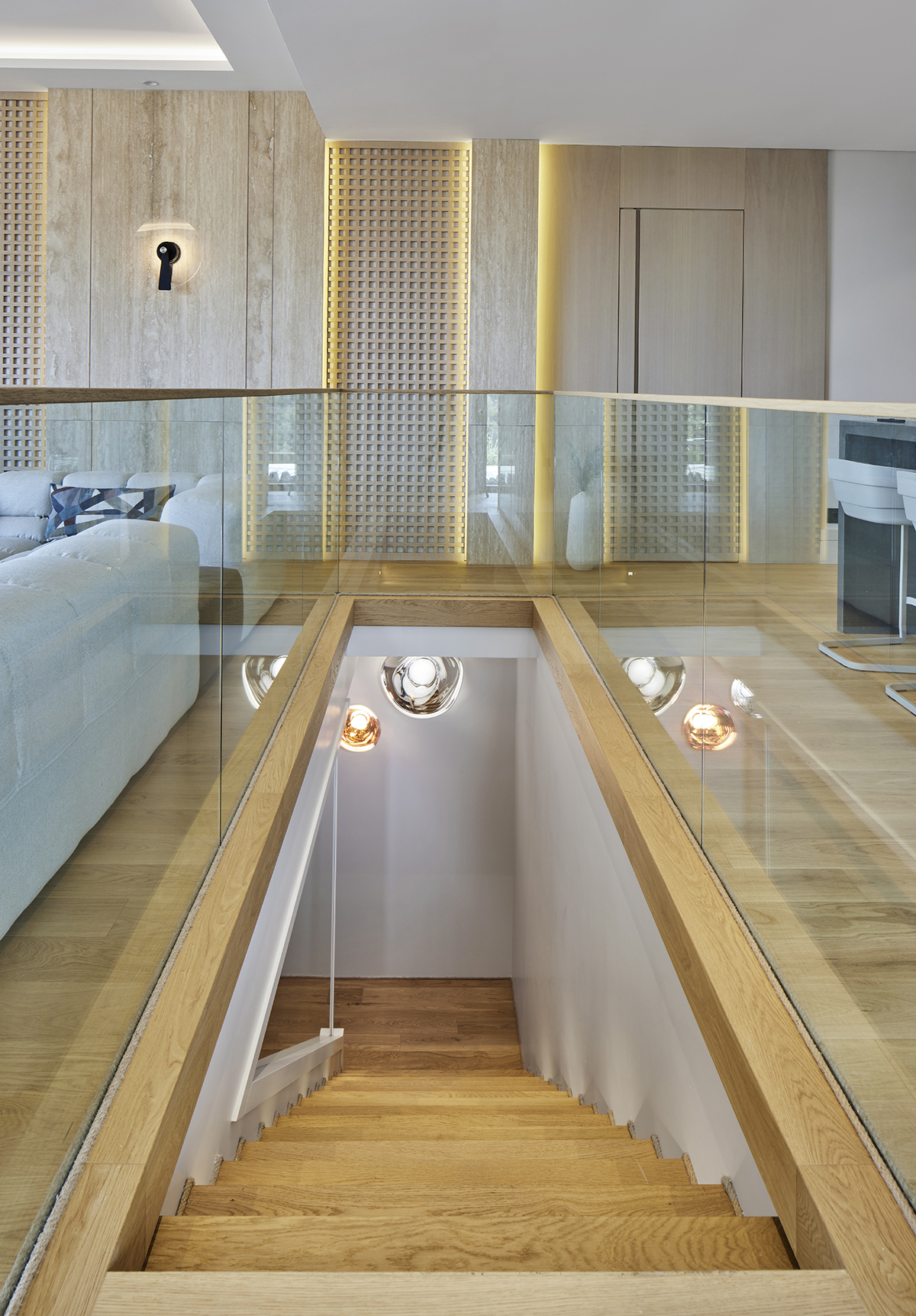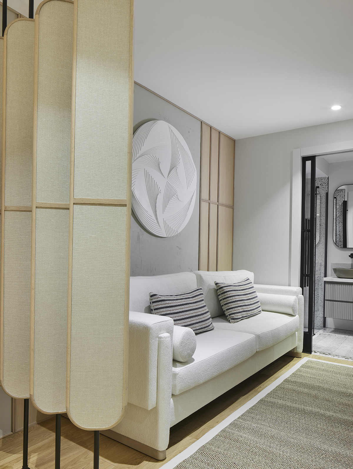Travertine and light oak create a serene backdrop, while linen textiles and layered lighting enhance the sense of openness and comfort.
