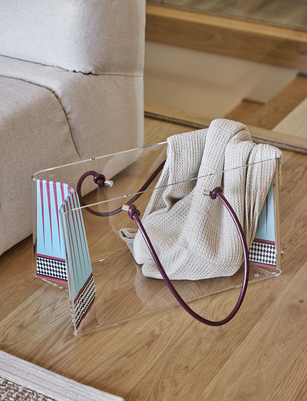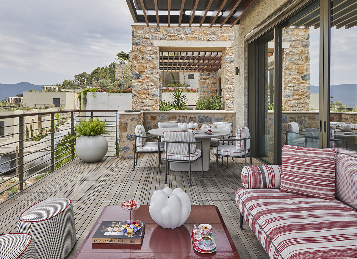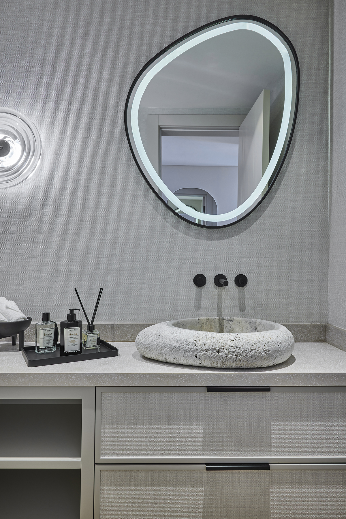 Travertine and light oak create a serene backdrop, while linen textiles and layered lighting enhance the sense of openness and comfort.