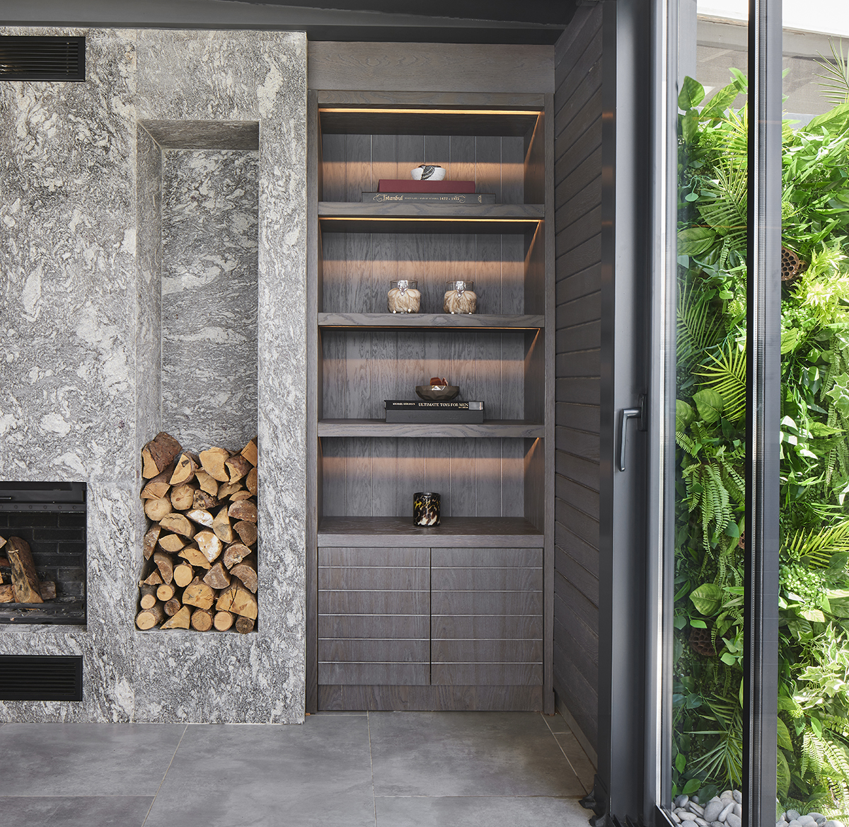 The interior language remains understated and elegant, supported by layered lighting that includes recessed square spots, wall lights accentuating wood paneling, concealed LEDs within bespoke furniture, and artwork lighting.