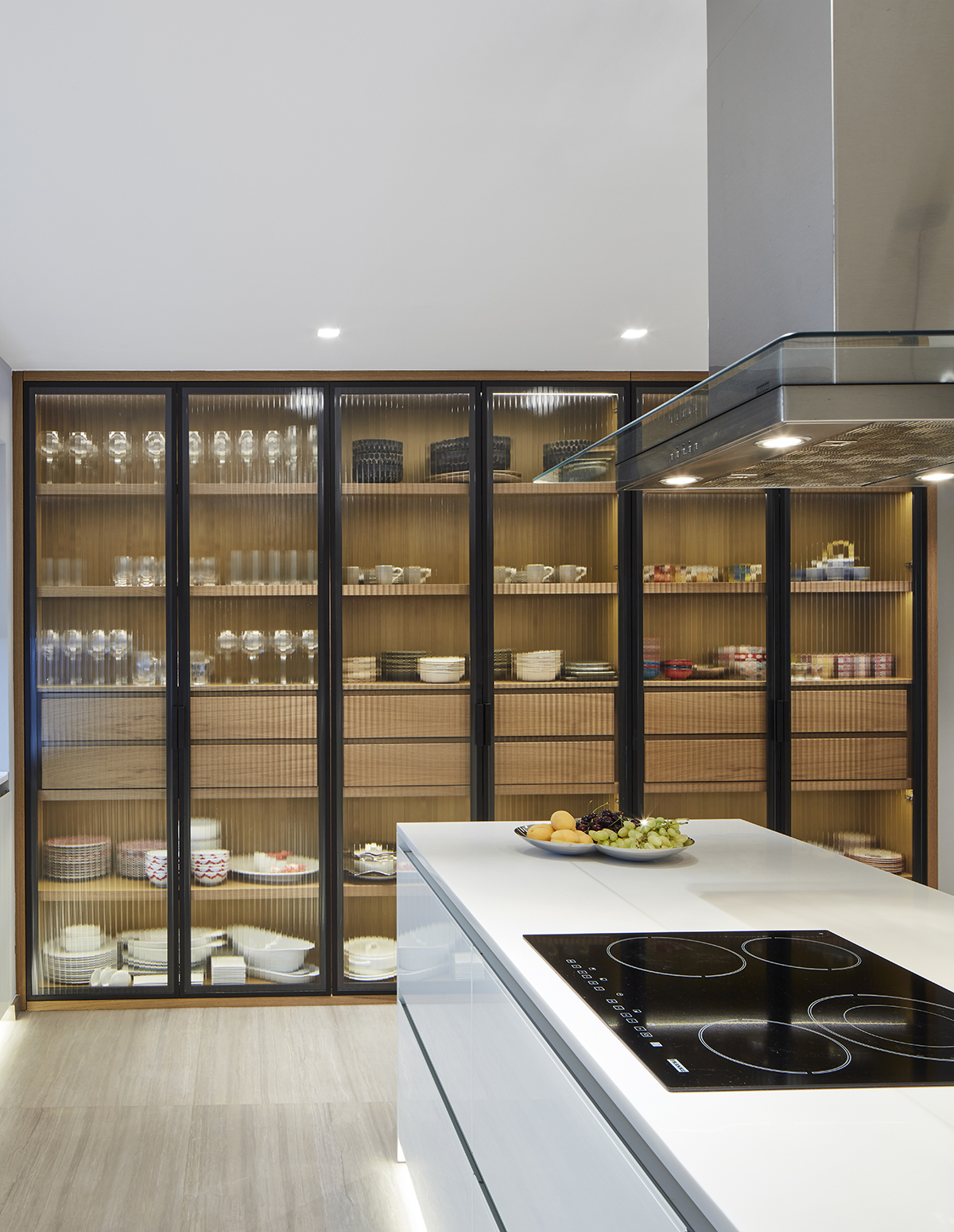 Lighting remains understated yet layered, combining spotlights, pendants, and concealed lighting within cabinetry and shelving.