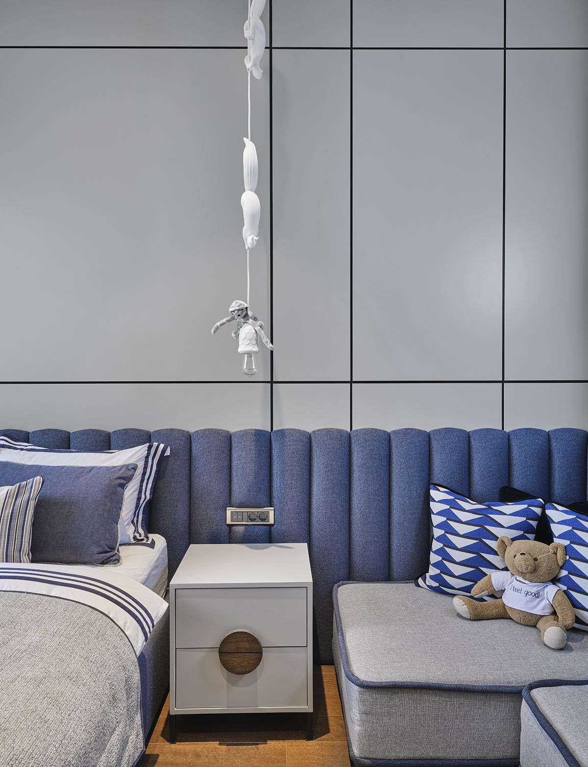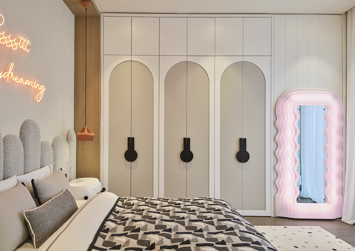The master suite is designed as a layered space, where the sleeping area flows naturally into the dressing room and bathroom.