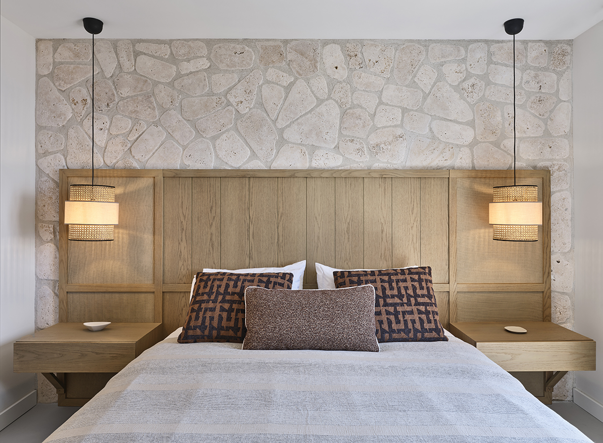 Natural textiles, patterned ceramics in the bathrooms, and climate-responsive landscaping further strengthen the home’s quiet, timeless relationship with its setting.