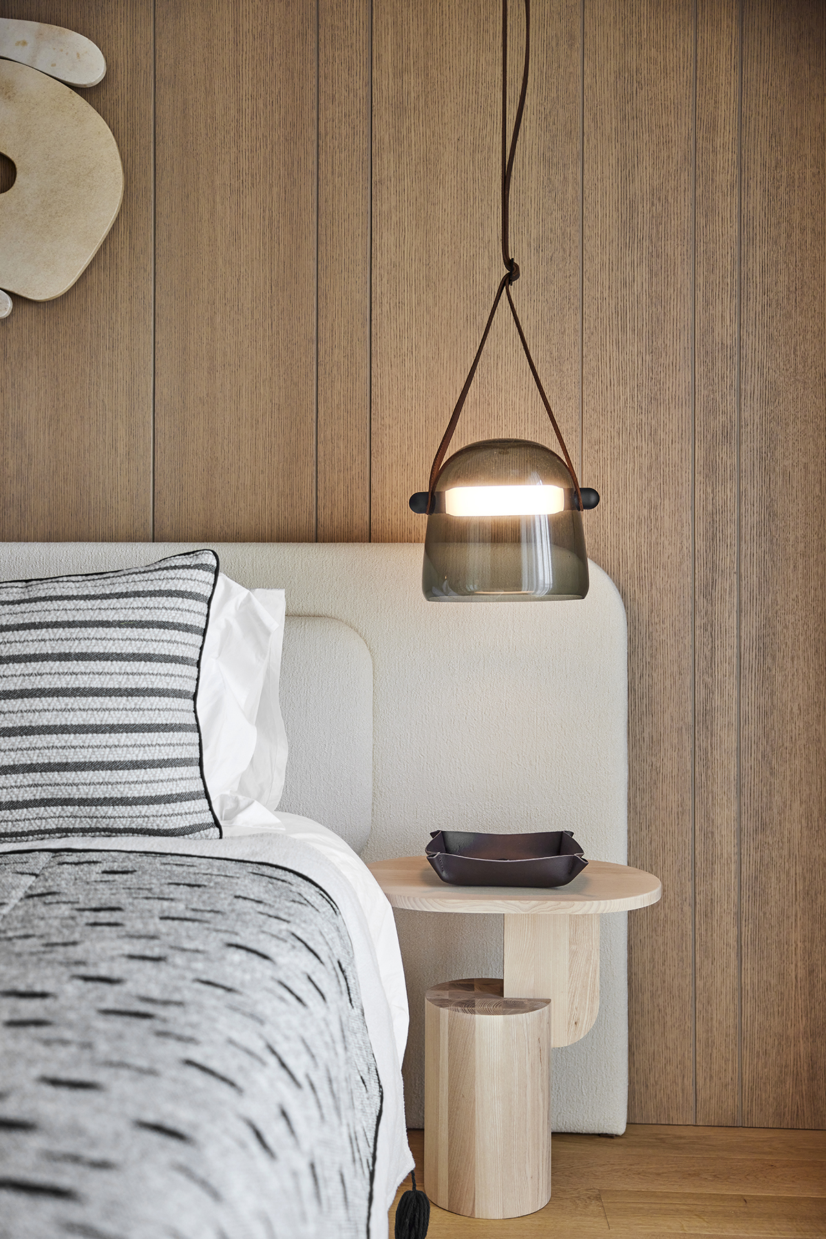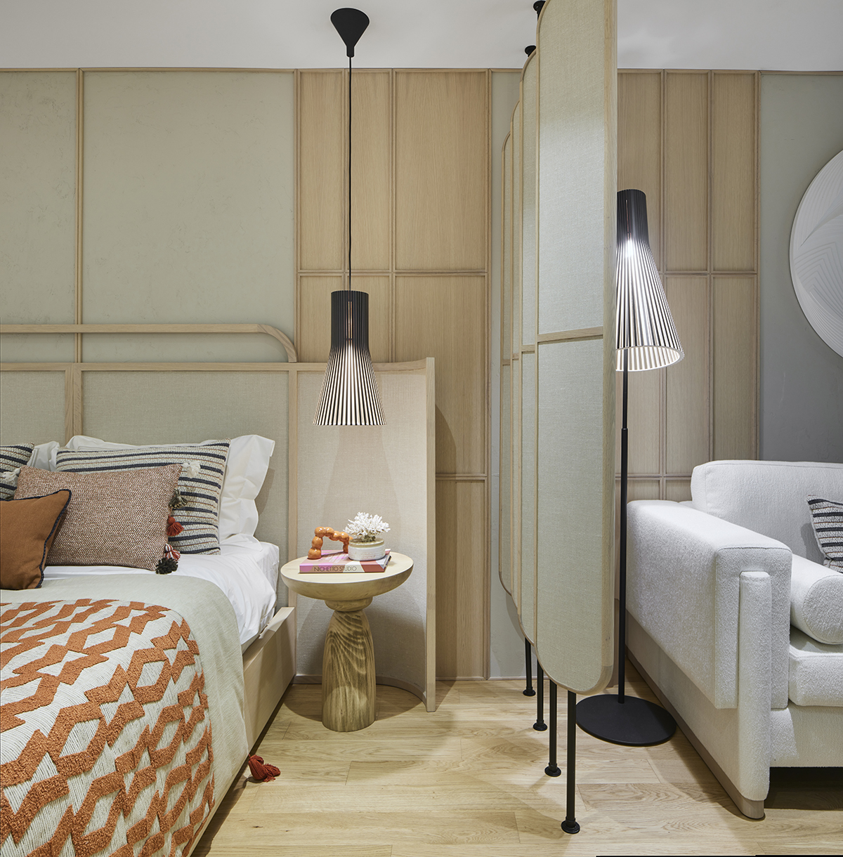 Travertine and light oak create a serene backdrop, while linen textiles and layered lighting enhance the sense of openness and comfort.