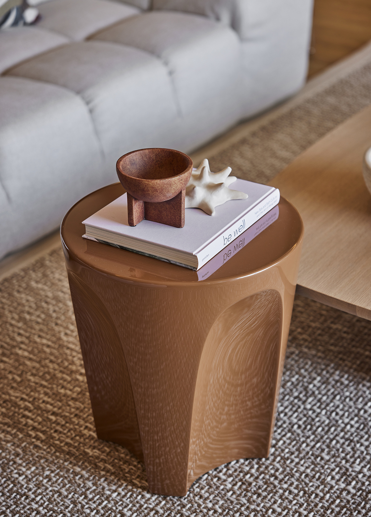 The interior concept is built around a soft palette of neutral tones and natural materials.